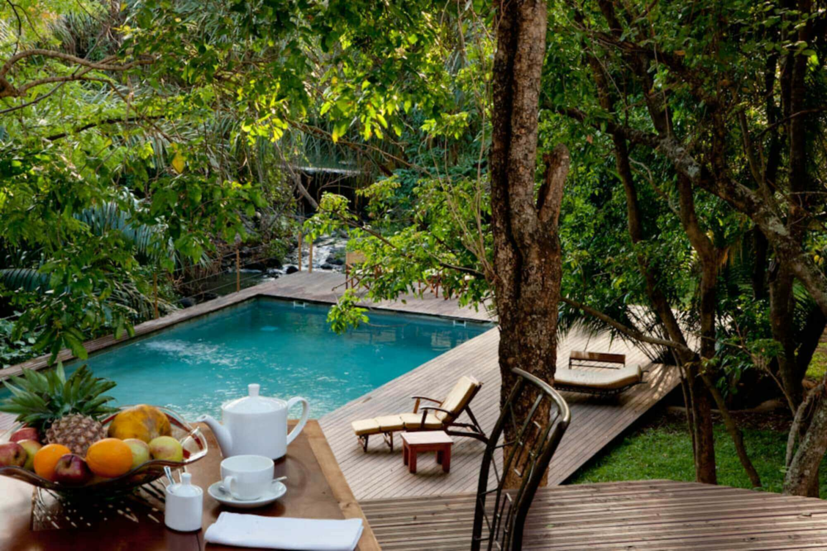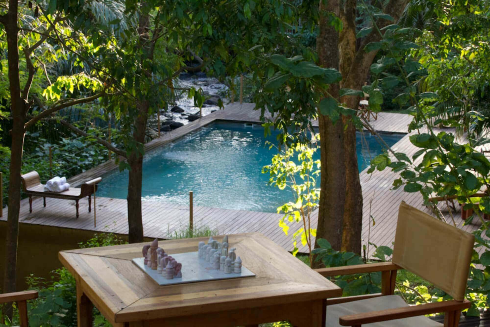 Das Rhino River Camp befindet sich in einer dicht bewaldeten 32 Hektar großen privaten Konzession am Ufer des Kindani-Baches direkt außerhalb der Grenze des Meru Nationalparks, ganz unweit des Rhino Sanctuary. Wenn man den zentral liegenden Bau erreicht, wird man von einem imposanten Nashorn aus Bronze begrüßt. Die komplett offenen Lounge- und Restaurantbereiche sind sehr elegant eingerichtet, mit strahlend weißen Wänden, in die man Regale eingebaut hat sowie mit komfortablen Sofas und vielen Skulpturen. Vom zweistufigen Deck blickt man zwischen den Bäumen auf den unterhalb liegenden Pool, der direkt über den kleinen Bach erbaut wurde.