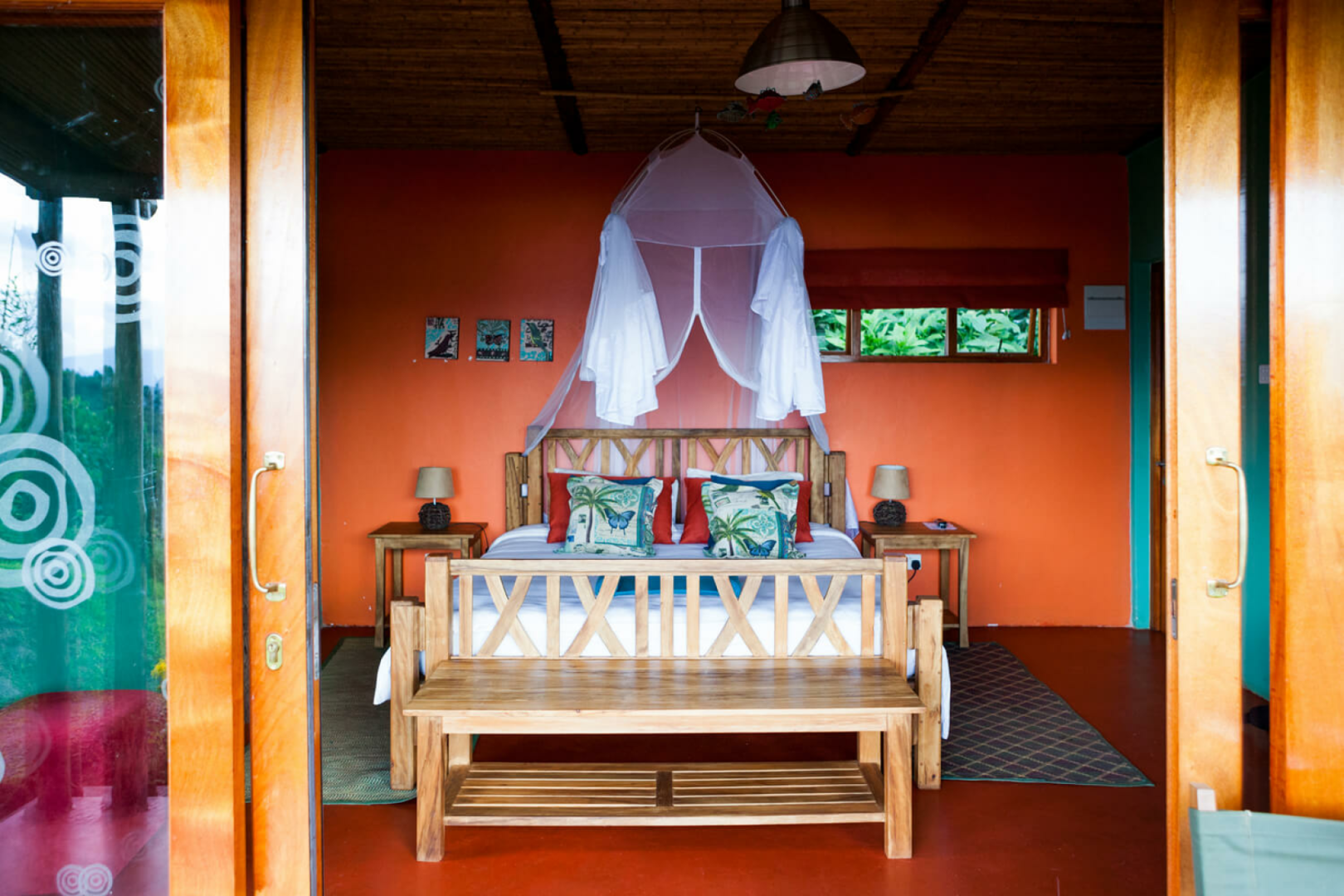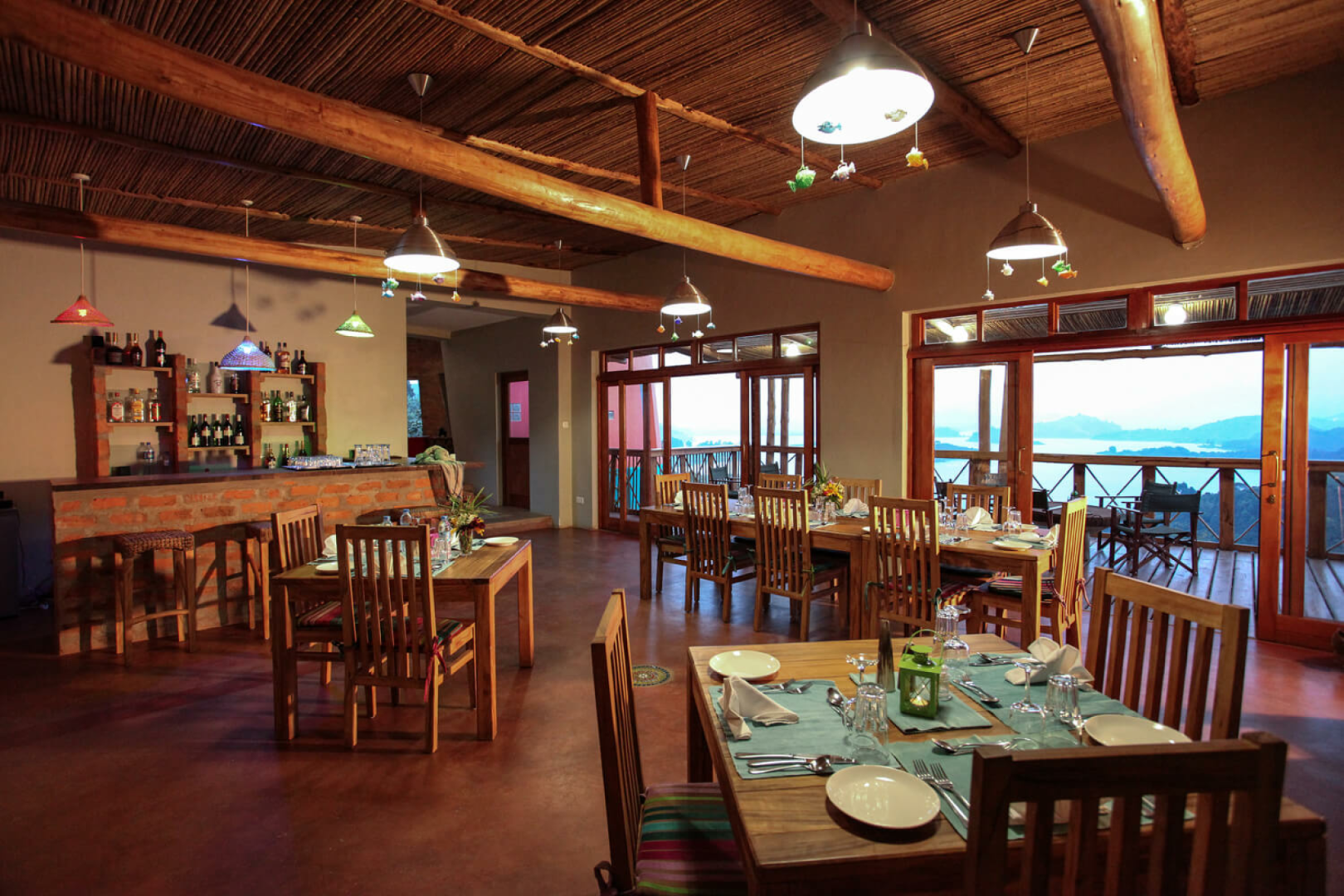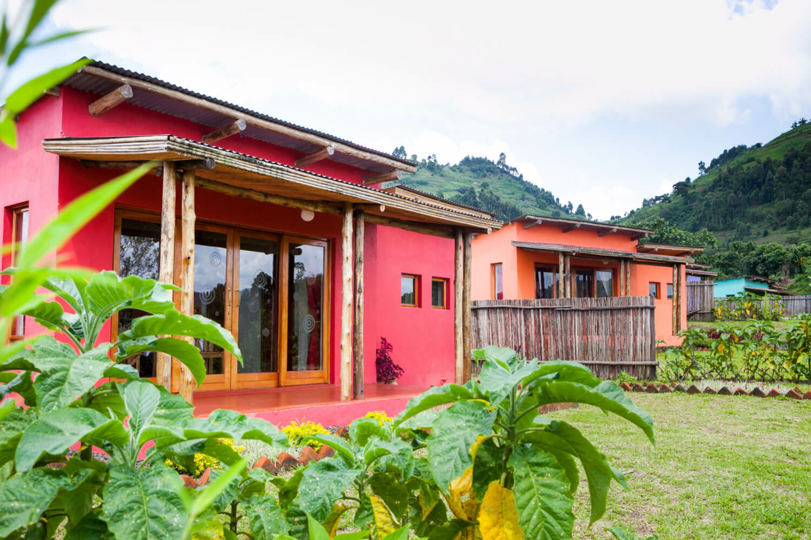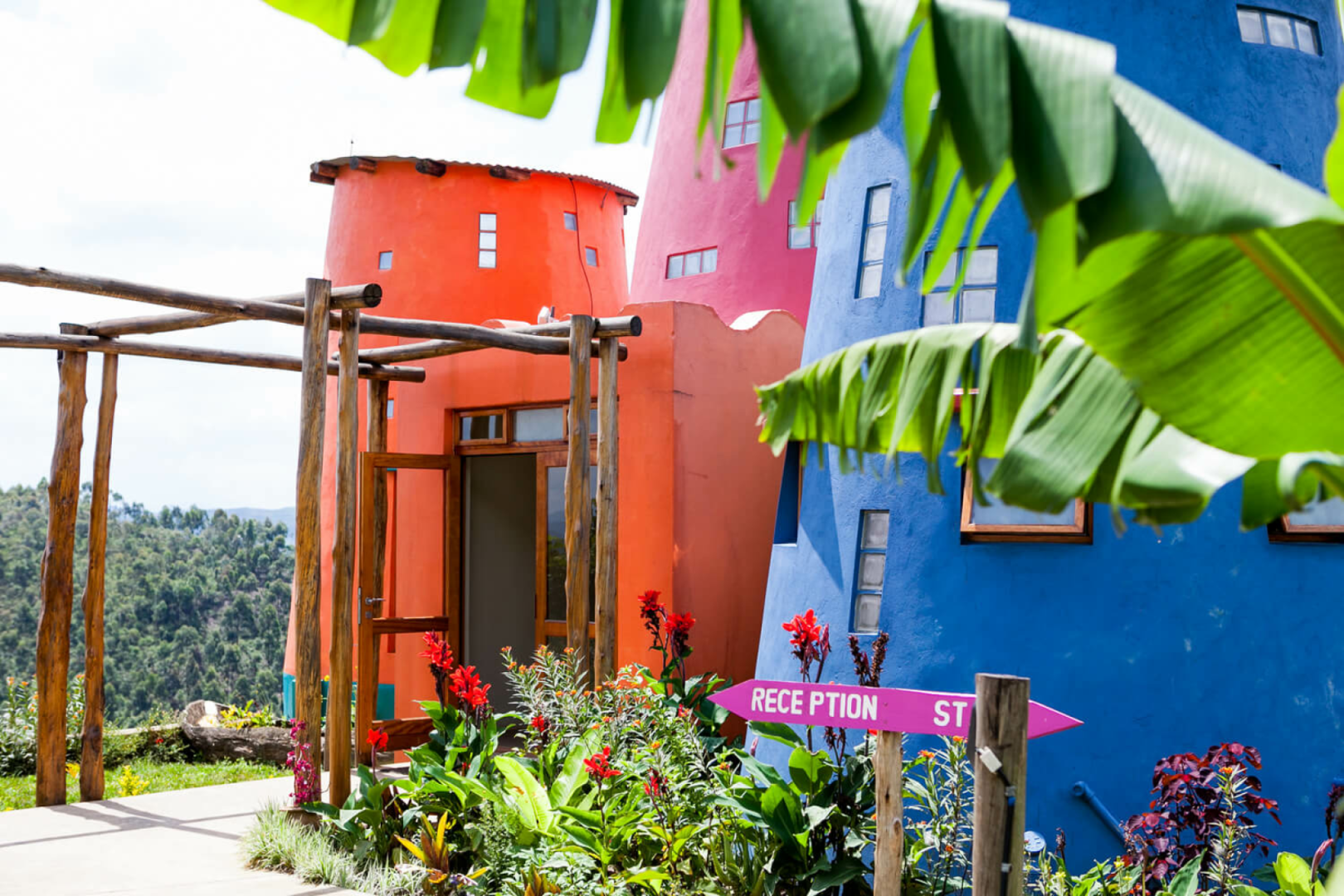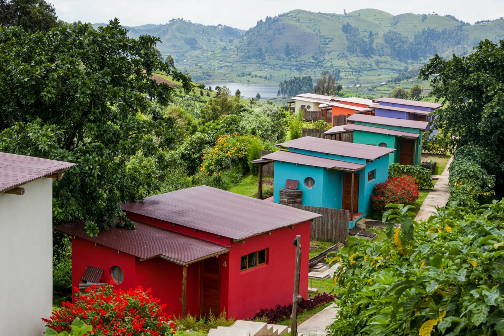 Der Eingang zur Lodge wird durch drei hohe bunte Türme markiert, die Verwaltungsbüros, eine Lounge und eine Bibliothek beherbergen. Auf dem gut gepflegten Gelände liegen dann die ebenfalls bunten Cottages, die sehr schön ausgestattet sind. Jede einzelne Veranda der Lodge bietet eine beeindruckende Aussicht auf den Lake Mutanda.