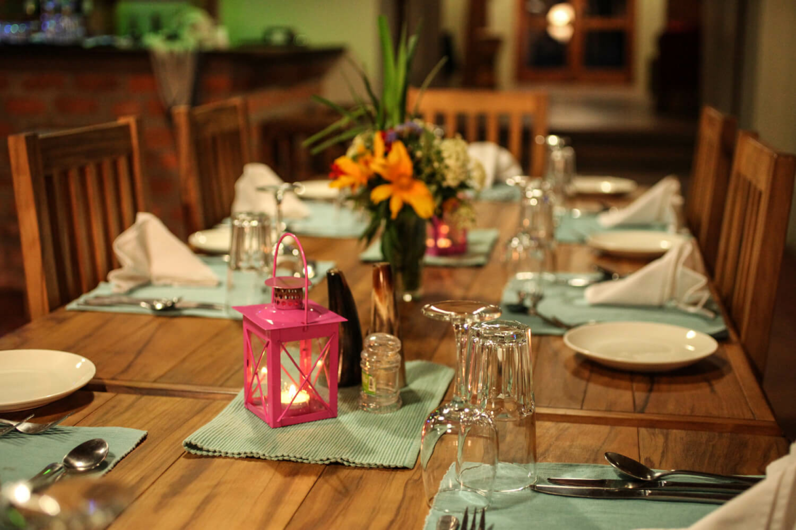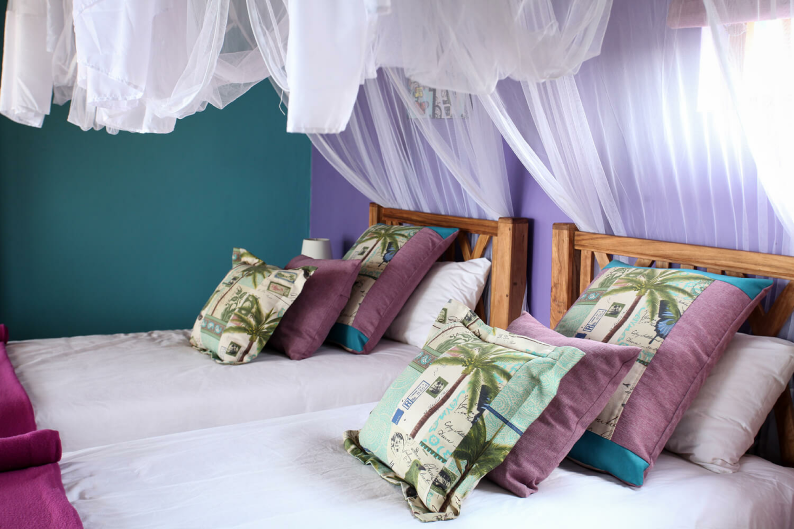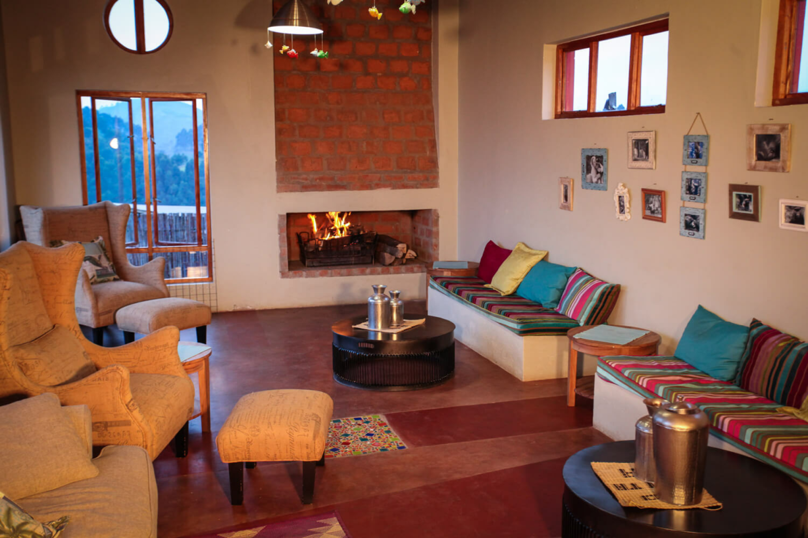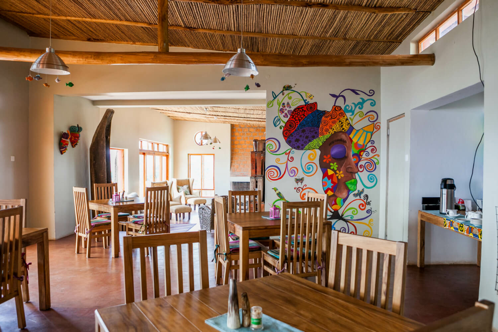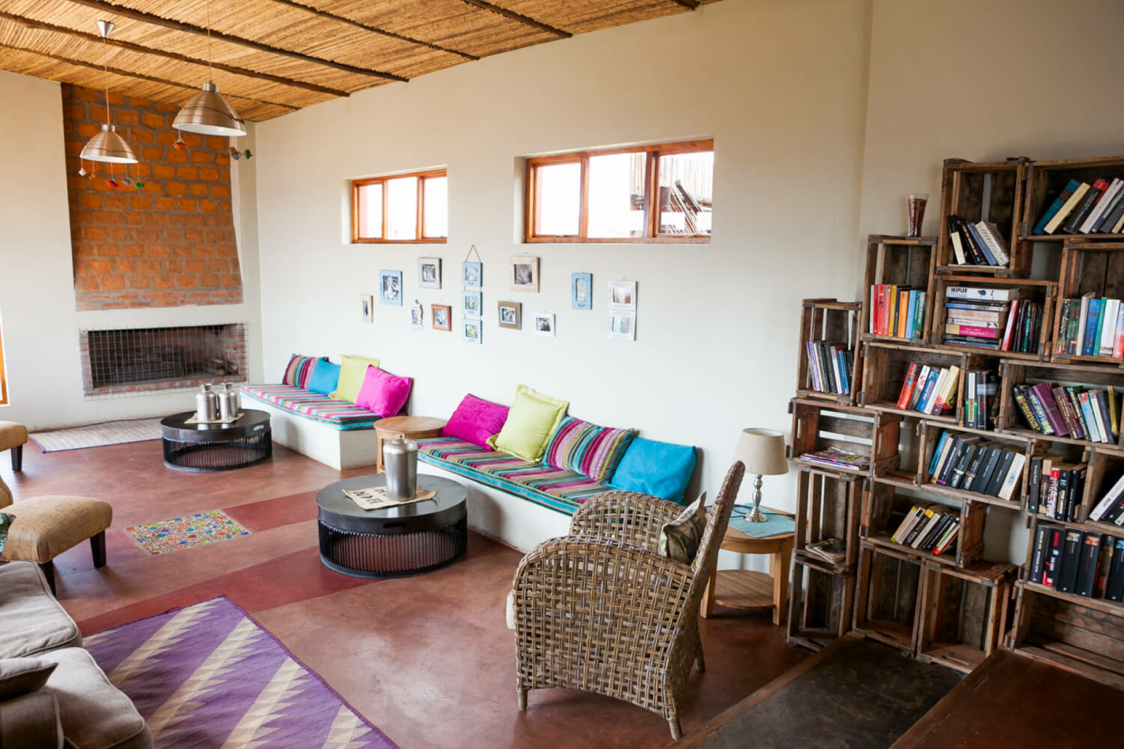 Der Eingang zur Lodge wird durch drei hohe bunte Türme markiert, die Verwaltungsbüros, eine Lounge und eine Bibliothek beherbergen. Auf dem gut gepflegten Gelände liegen dann die ebenfalls bunten Cottages, die sehr schön ausgestattet sind. Jede einzelne Veranda der Lodge bietet eine beeindruckende Aussicht auf den Lake Mutanda.