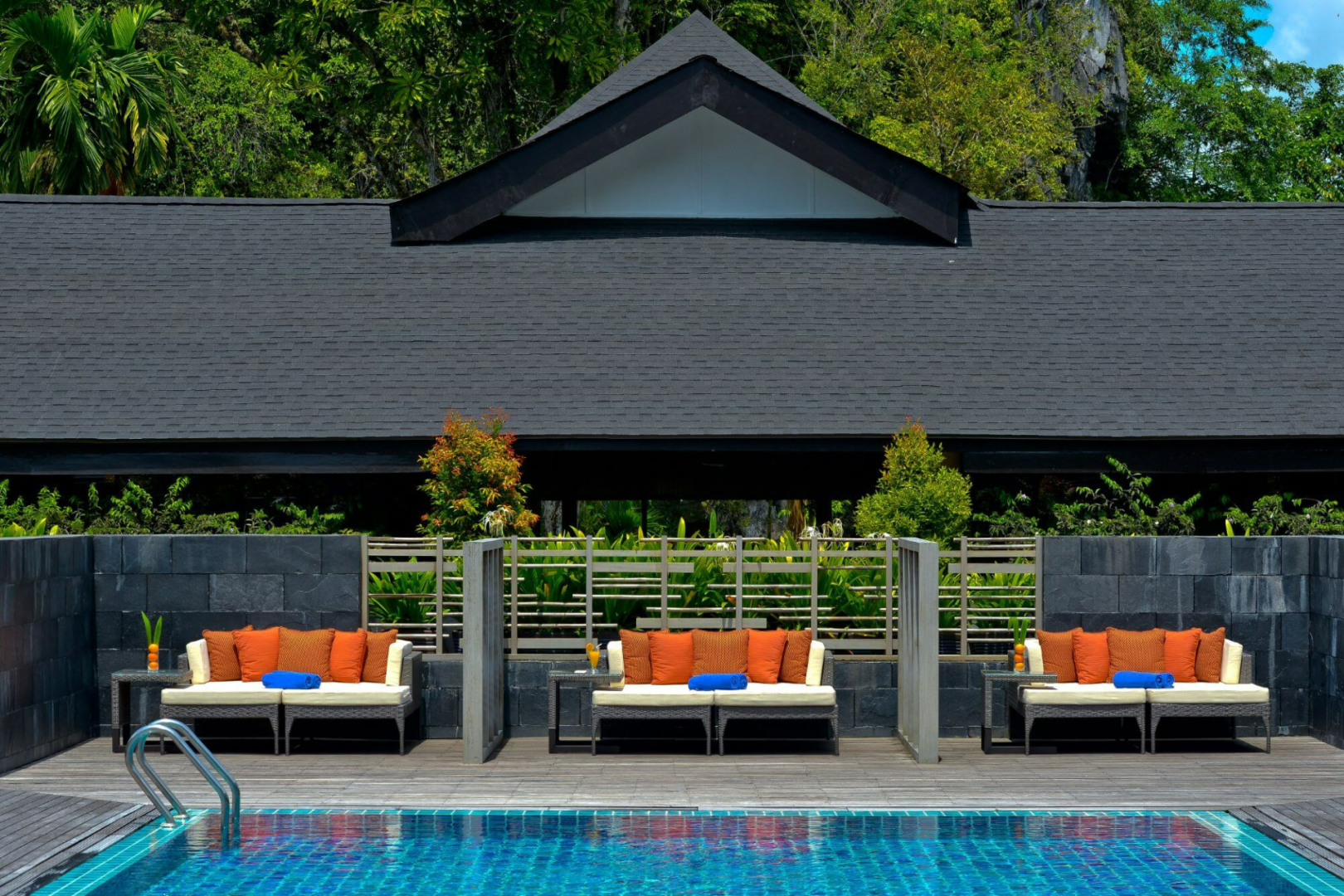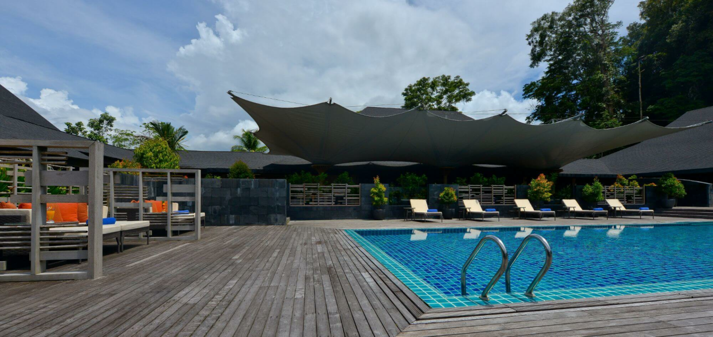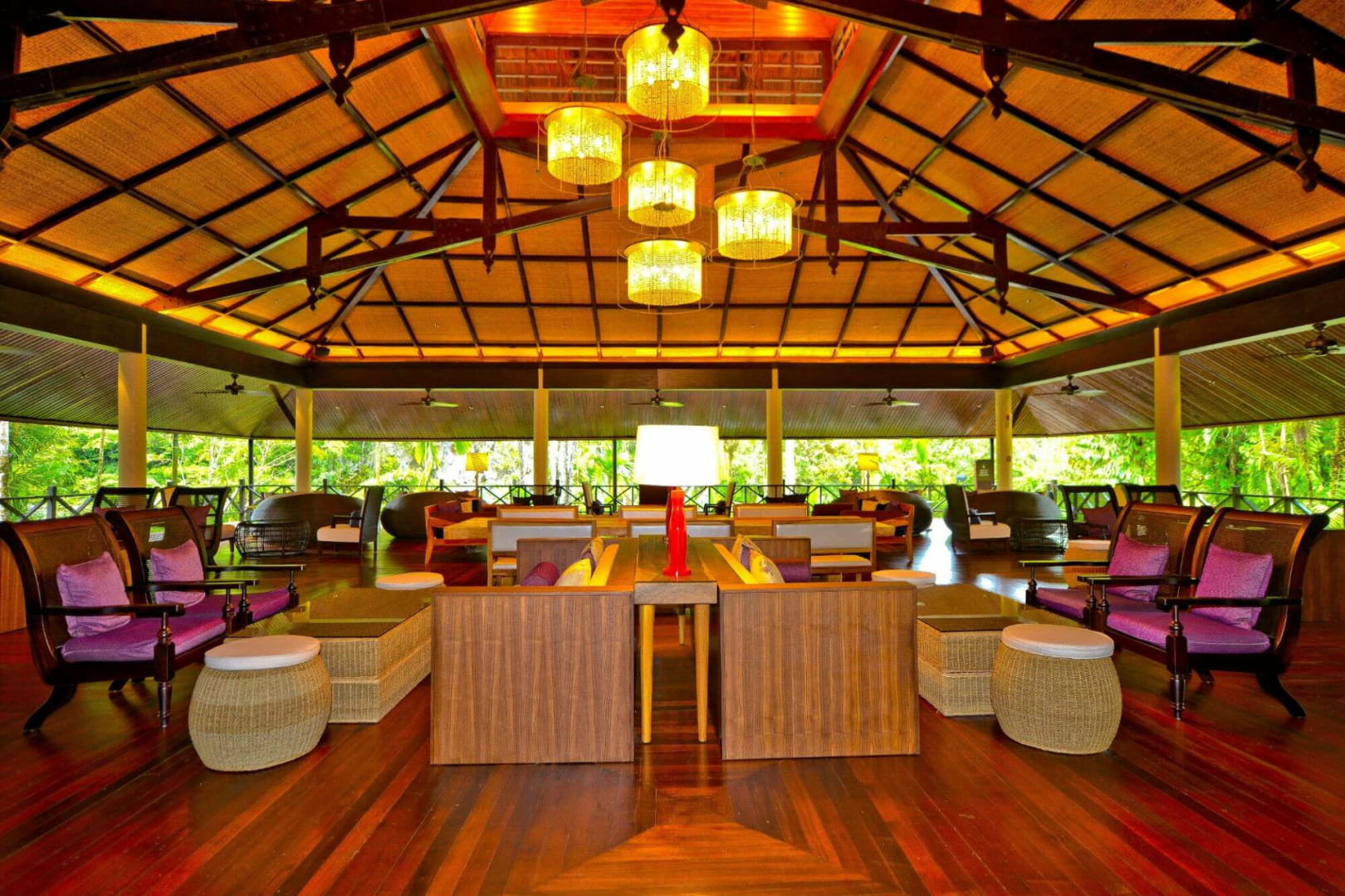 Die Einrichtung des Restaurants sowie der Bar entspricht allerdings in vollem Umfang unserer Vorstellung einer Lodge im Dschungel: Hier finden sich viele Holz- und Rattanmöbel. Zu den gemeinsamen Bereichen gehört ein sehr einladender Poolbereich.