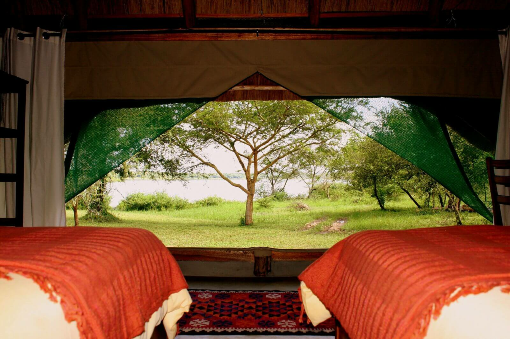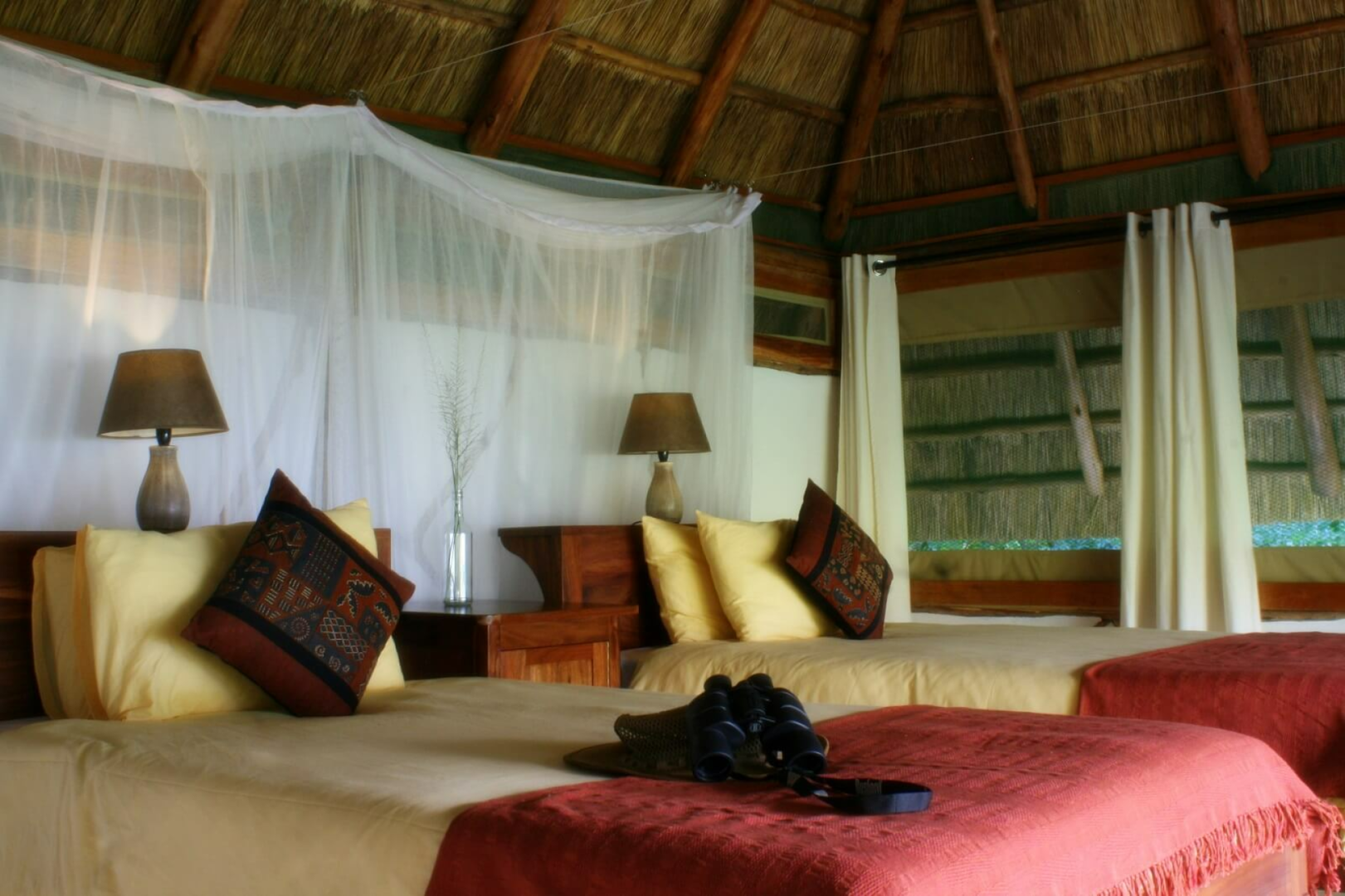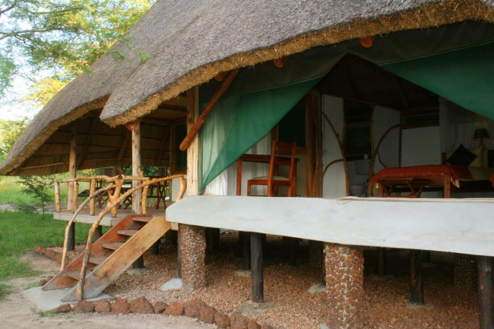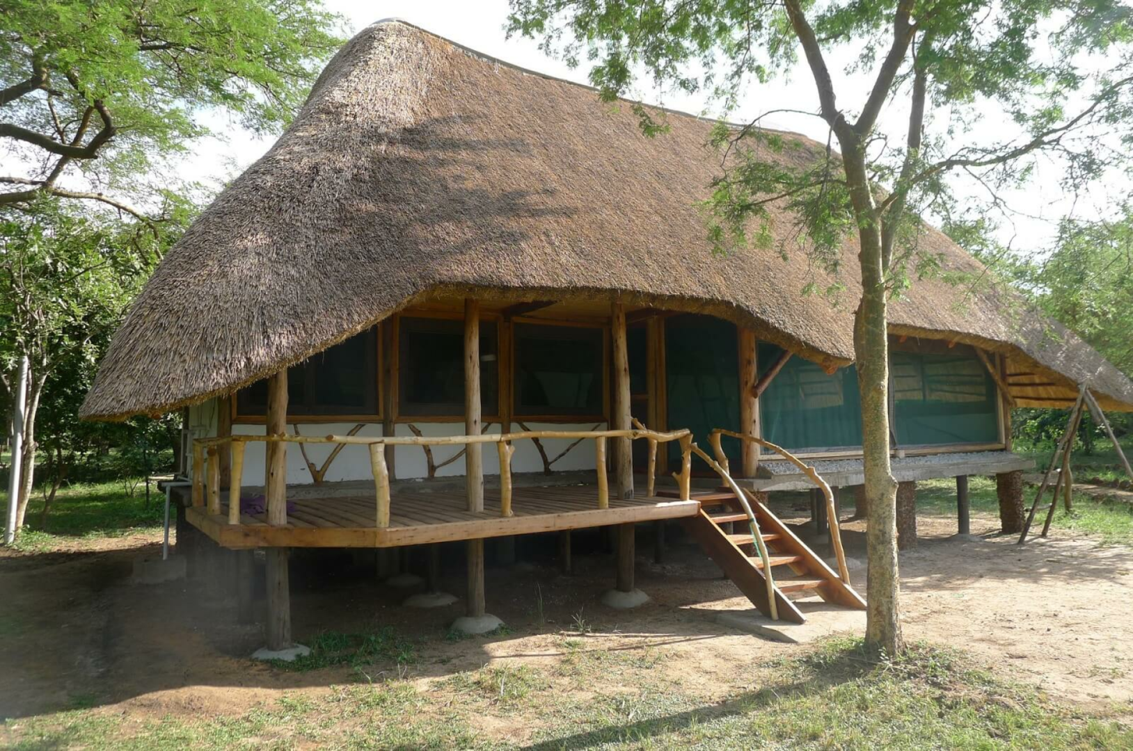 Die Bungalows haben nur drei Wände, sind also vorne offen und nur mit einem Netz versehen. Frische Luft durchdringt das Zimmer. Häufig kann man direkt vom Camp aus Nilpferde, Krokodile und manchmal sogar Elefanten beobachten.