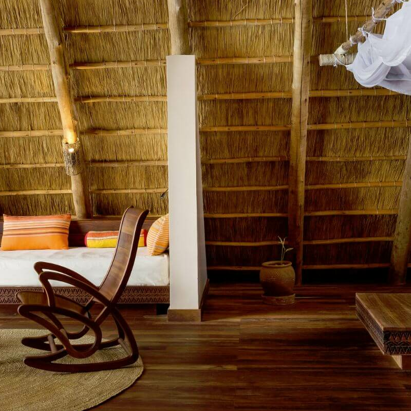 Chalets unter Strohdach untergebracht. Jedes Chalet ist mit einer