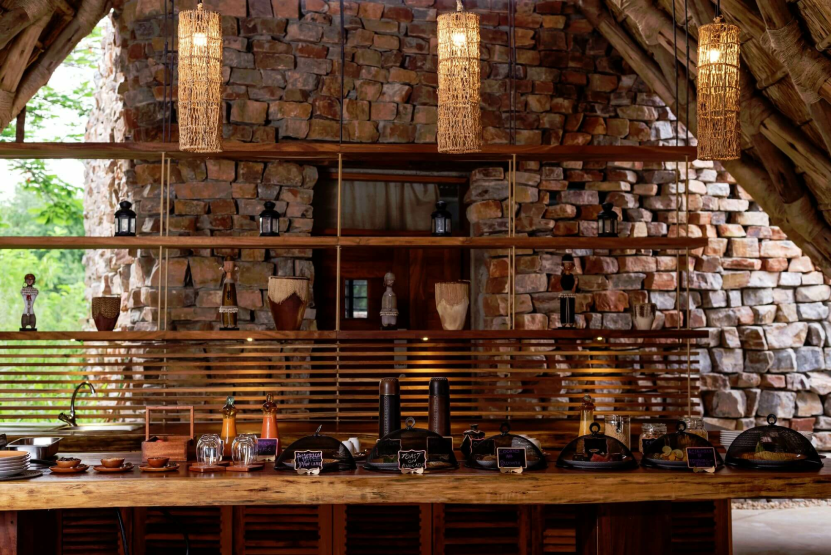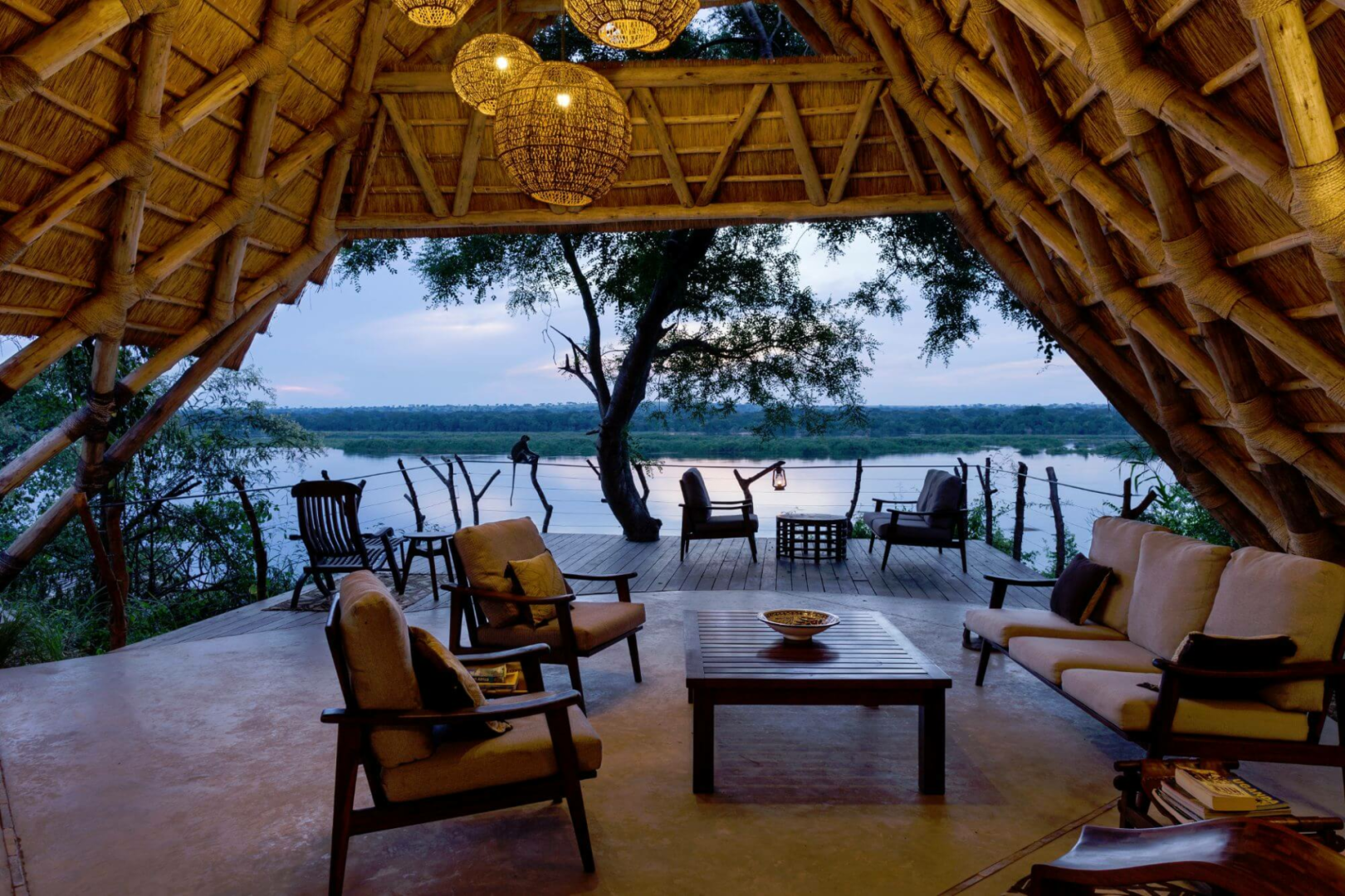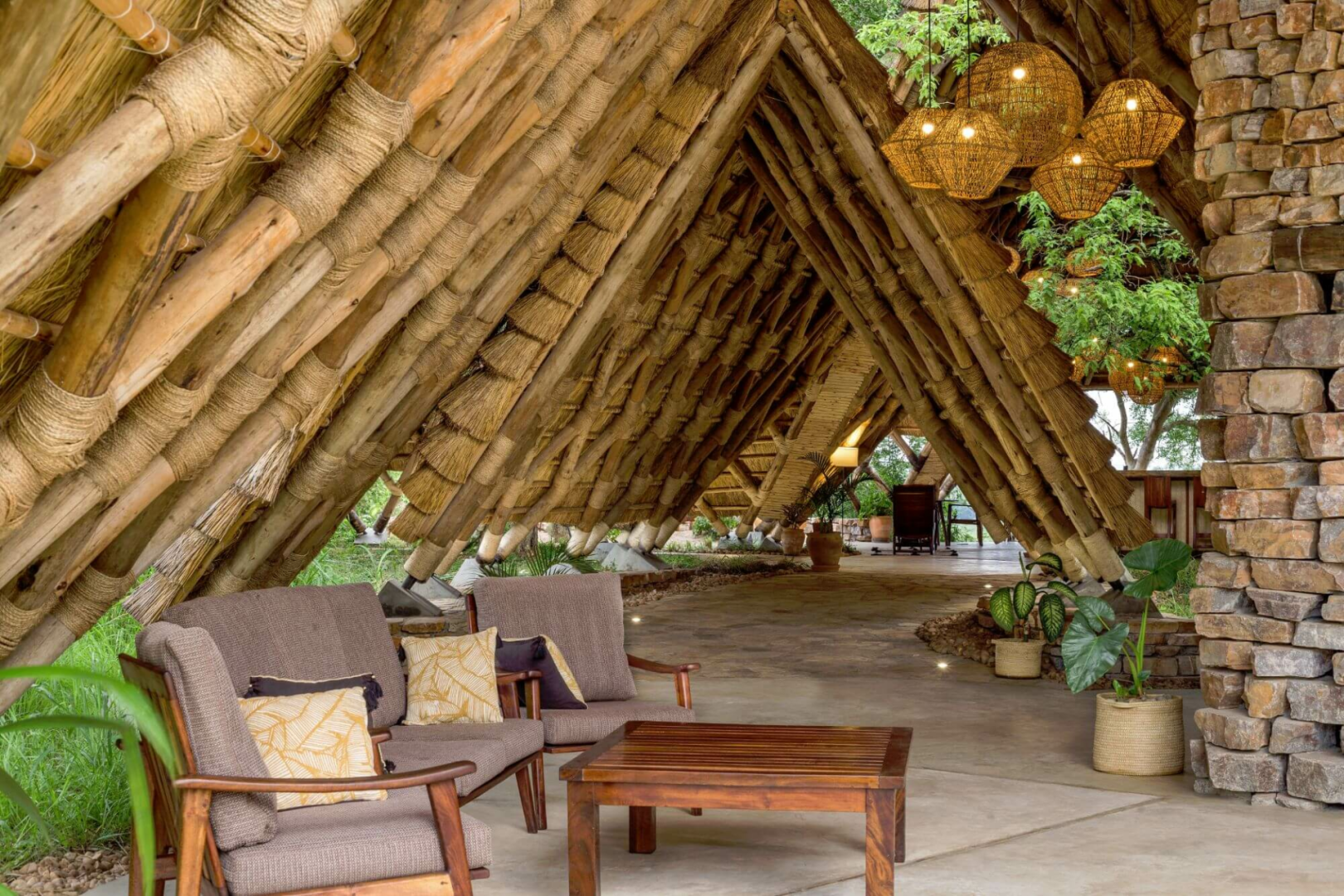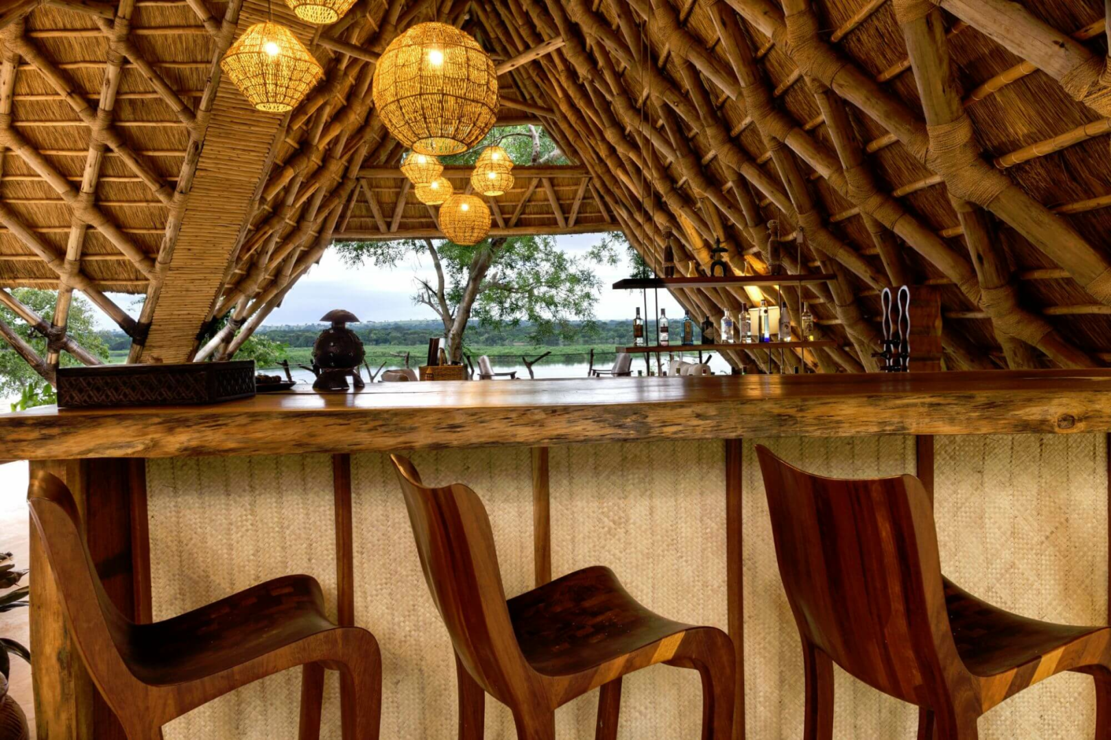 Essraum mit Bar und Lounge. Von überall in der Lodge kann man den Blick