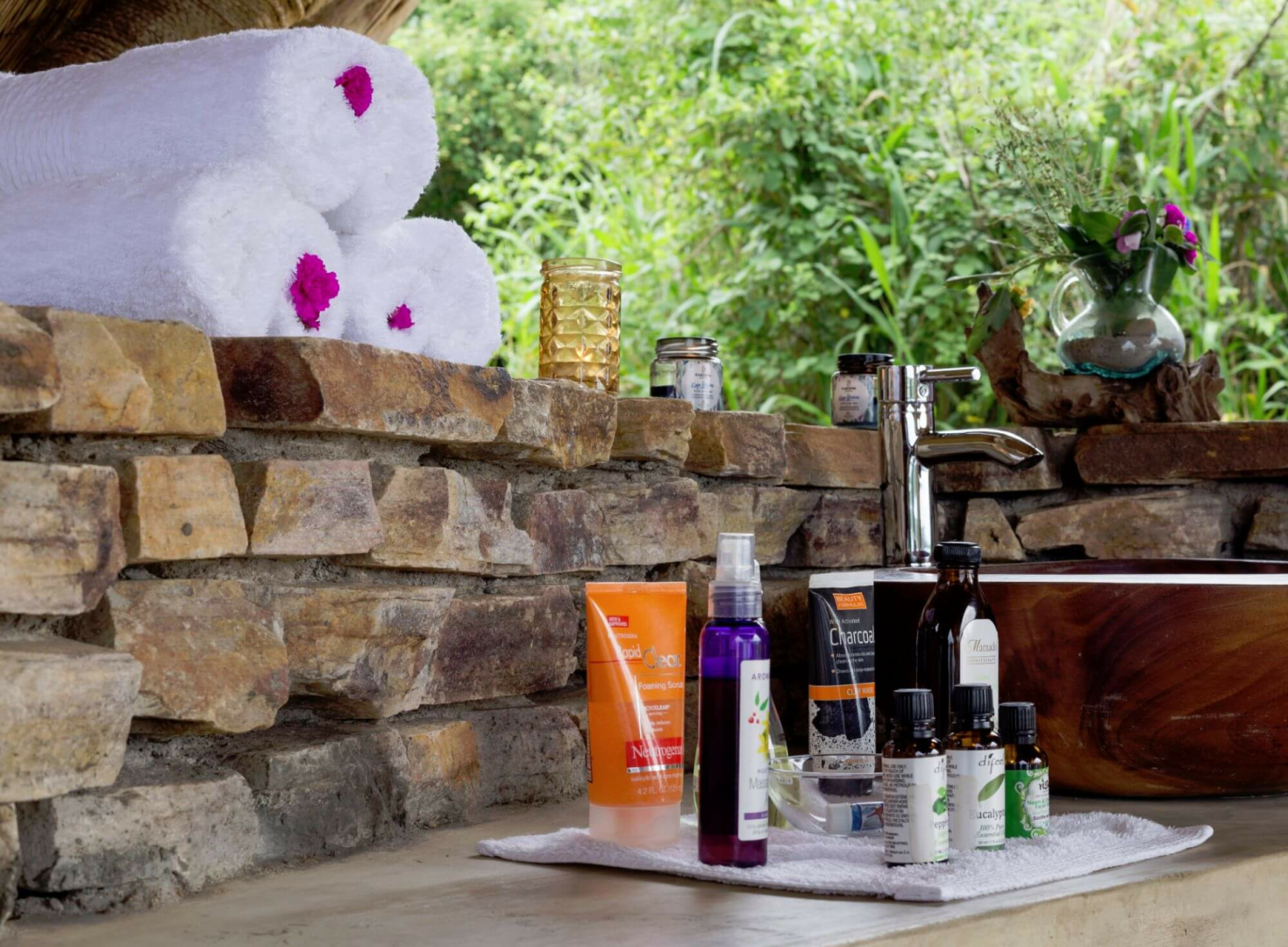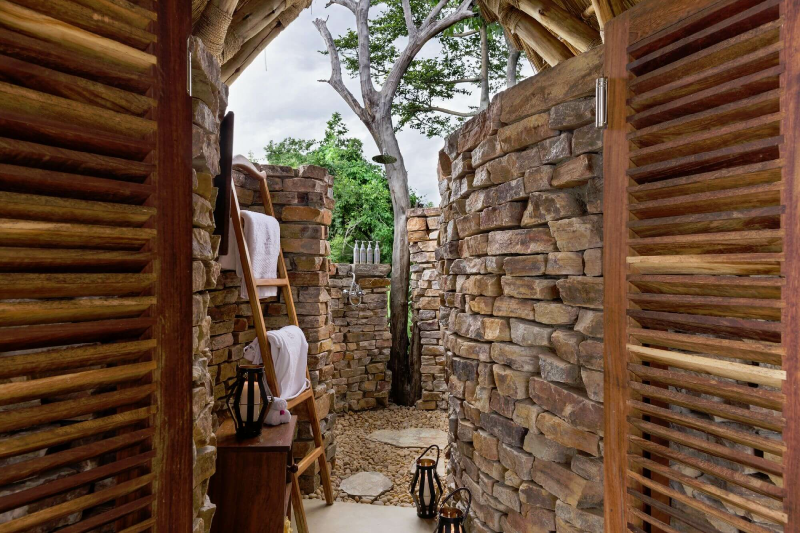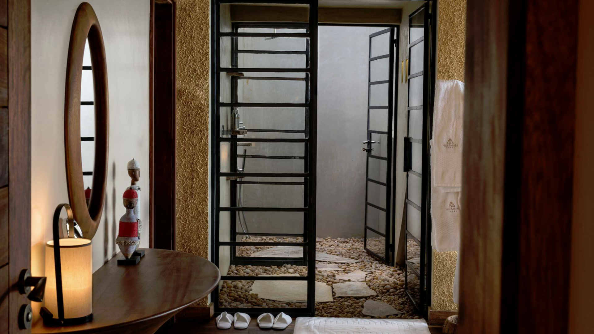 Waschbecken, einer frei stehenden Badewanne und eine Outdoor-Dusche.