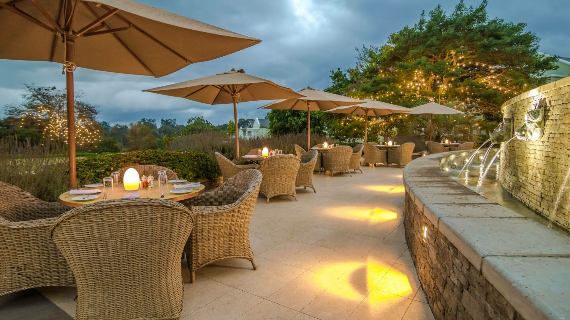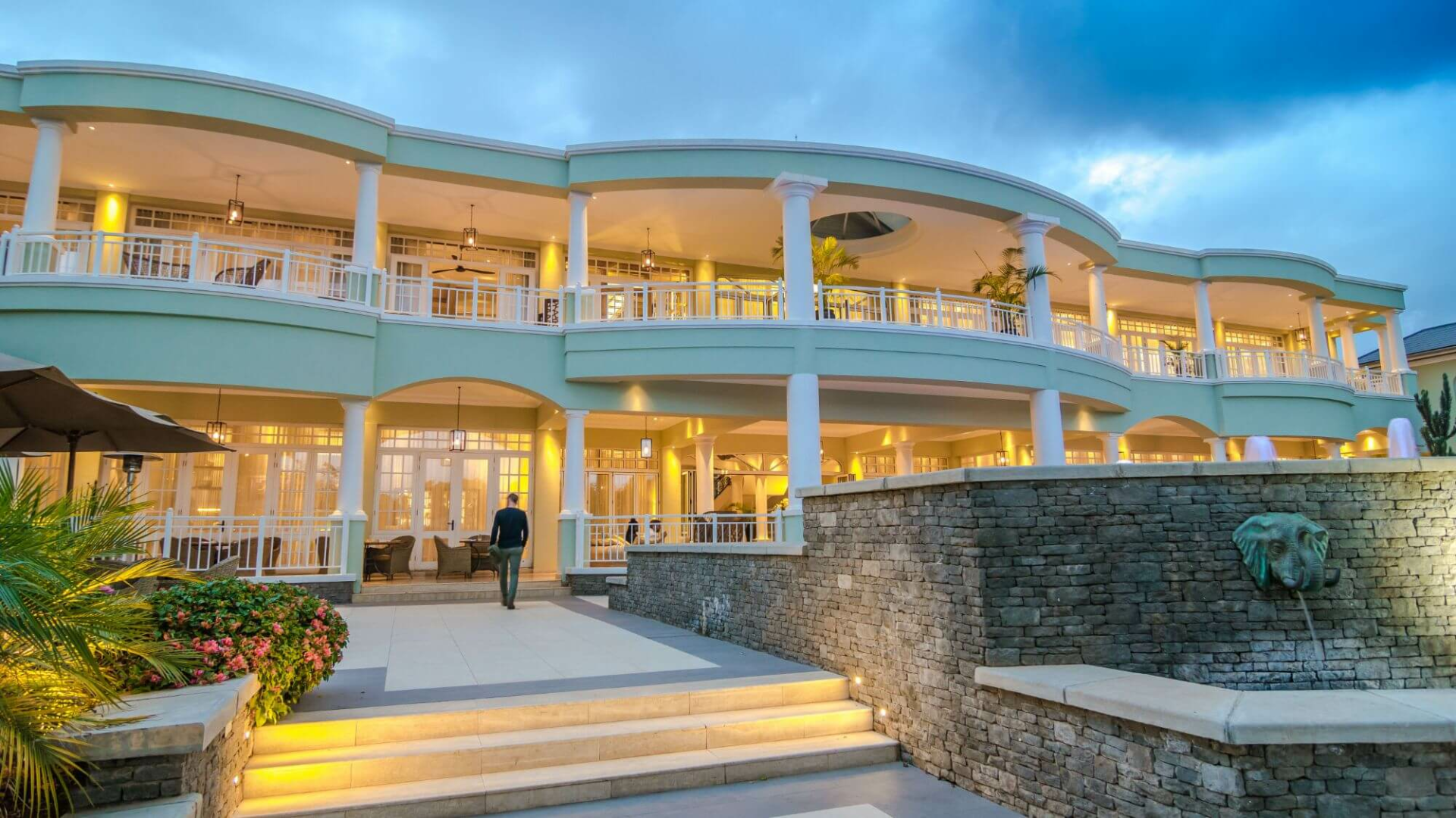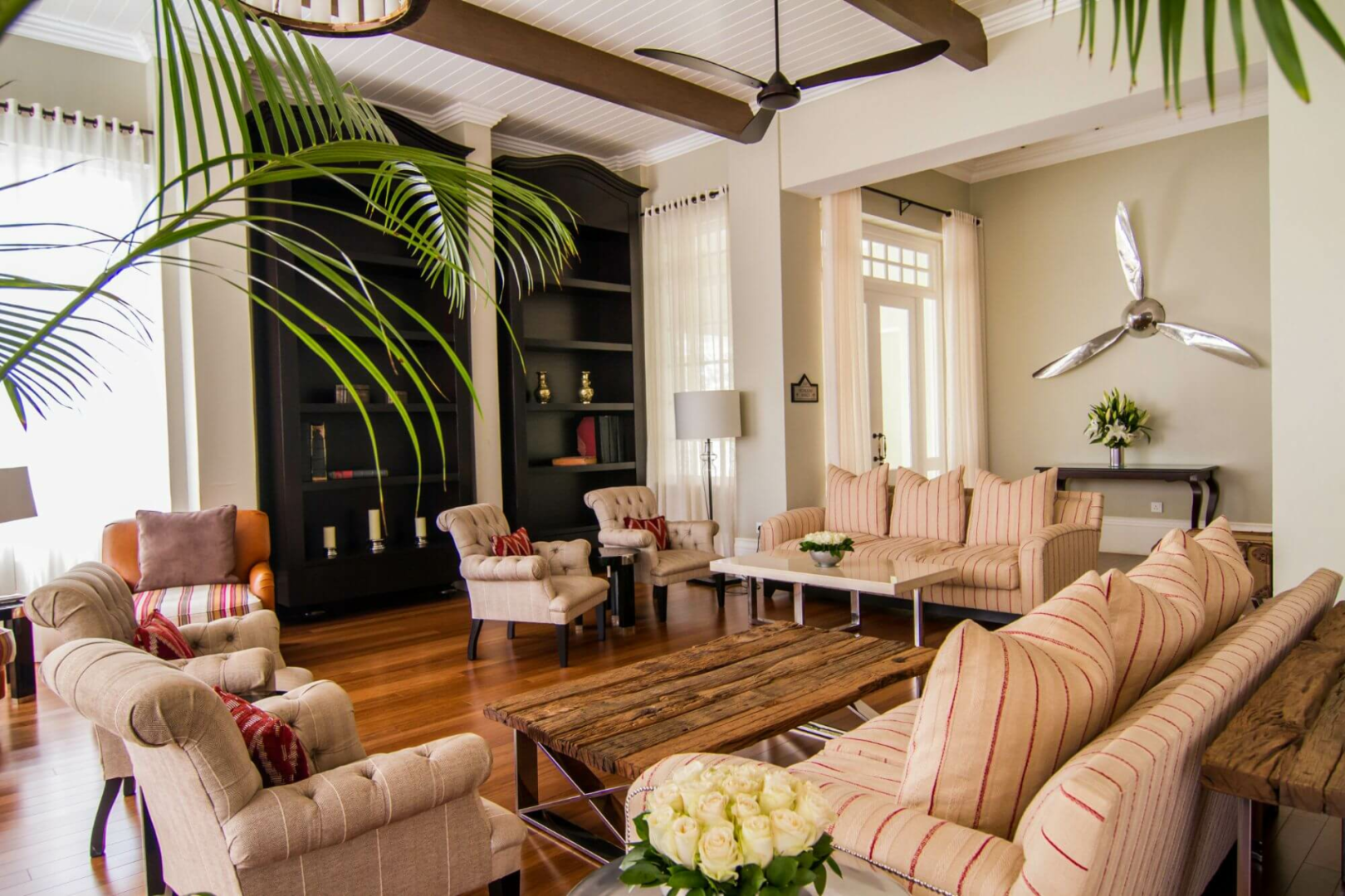 Die aufwendig eingerichteten gemeinsamen Bereiche sind in Pastellfarben gehalten. Der Hauptspeisesaal befindet sich auf der linken Seite, durch die großen Balkonfenster blickt man auf die Terrasse, wo man ebenfalls speisen kann sowie auf den Pool. Eine große, geschwungene Treppe führt hinauf zu einer geräumigen Bar mit bequemen Ledersesseln und einem Balkon mit Blick auf die üppigen Gärten, sowie zu einem privaten Speiseraum.