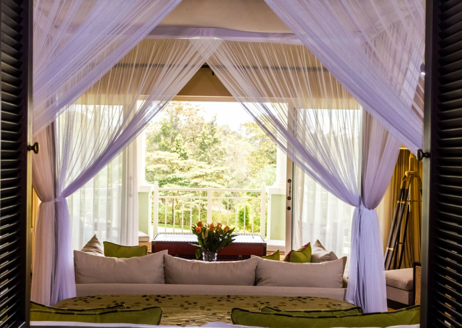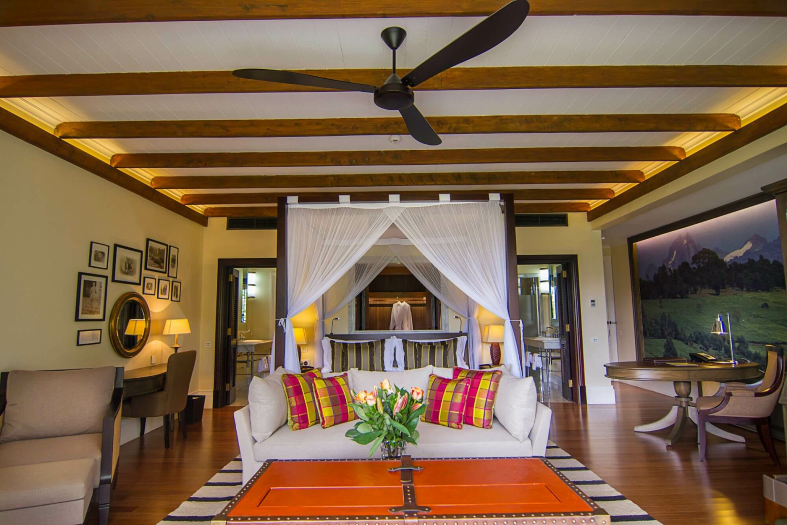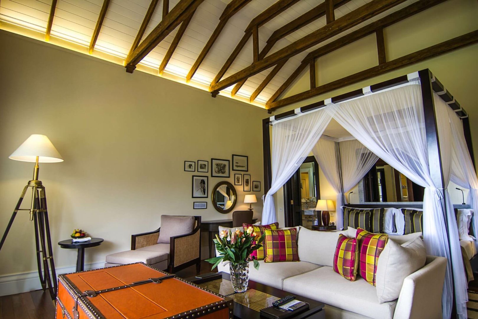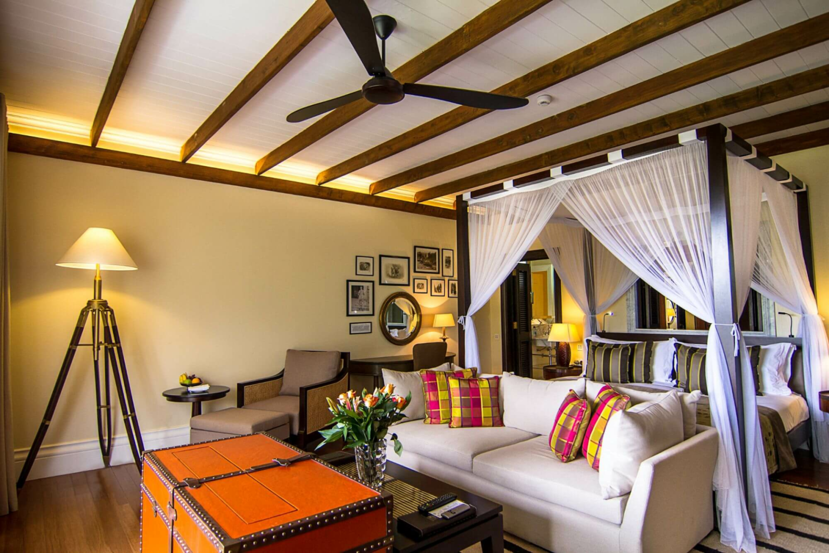 Gäste werden in 30 Deluxe Suiten mit Himmelbett und Balkon, sowie in zehn weiteren Suiten untergebracht. Alle Zimmer befinden sich in grün bemalten Reihenhäusern, die ein wenig an einen Ferienkomplex erinnern.