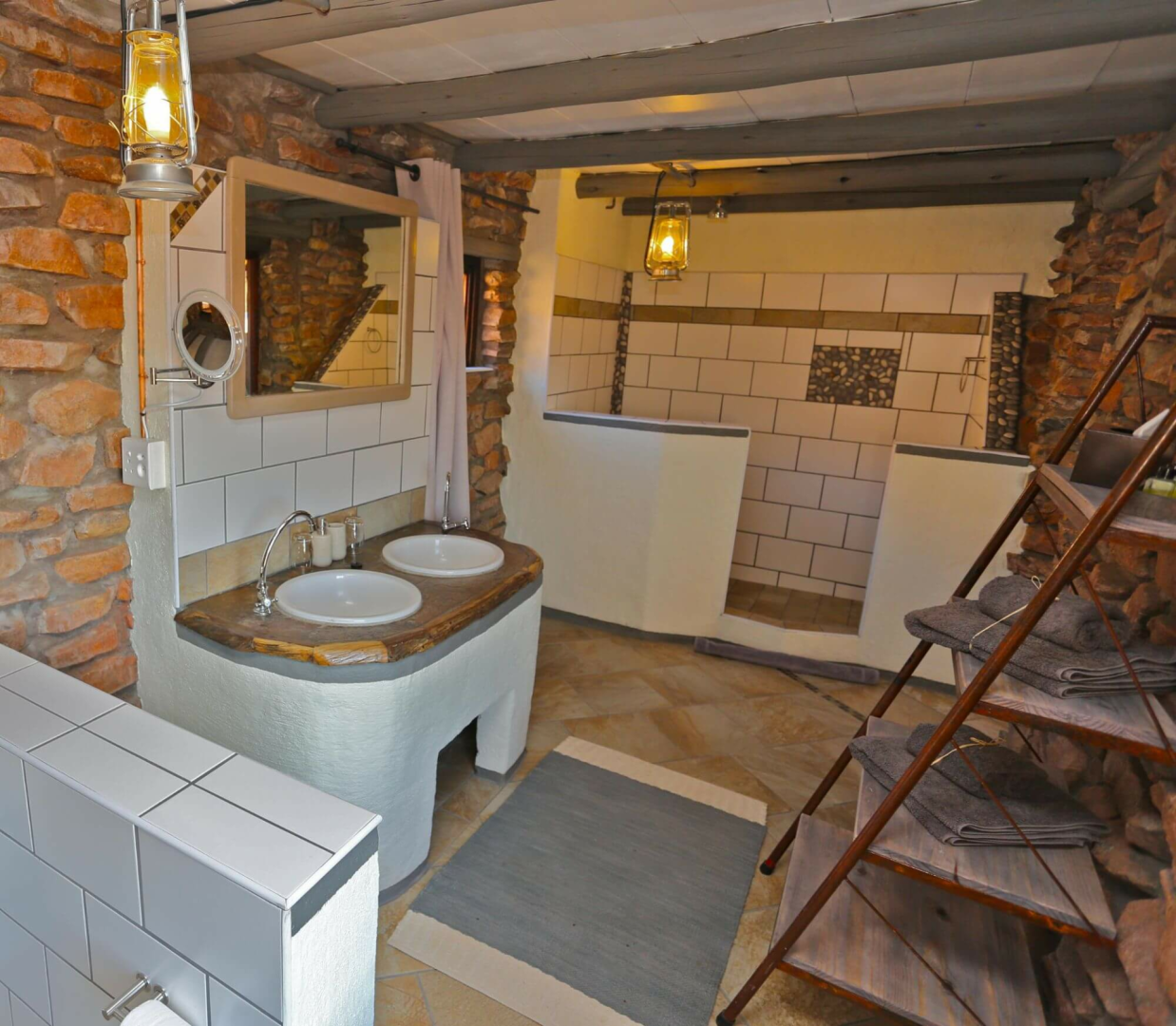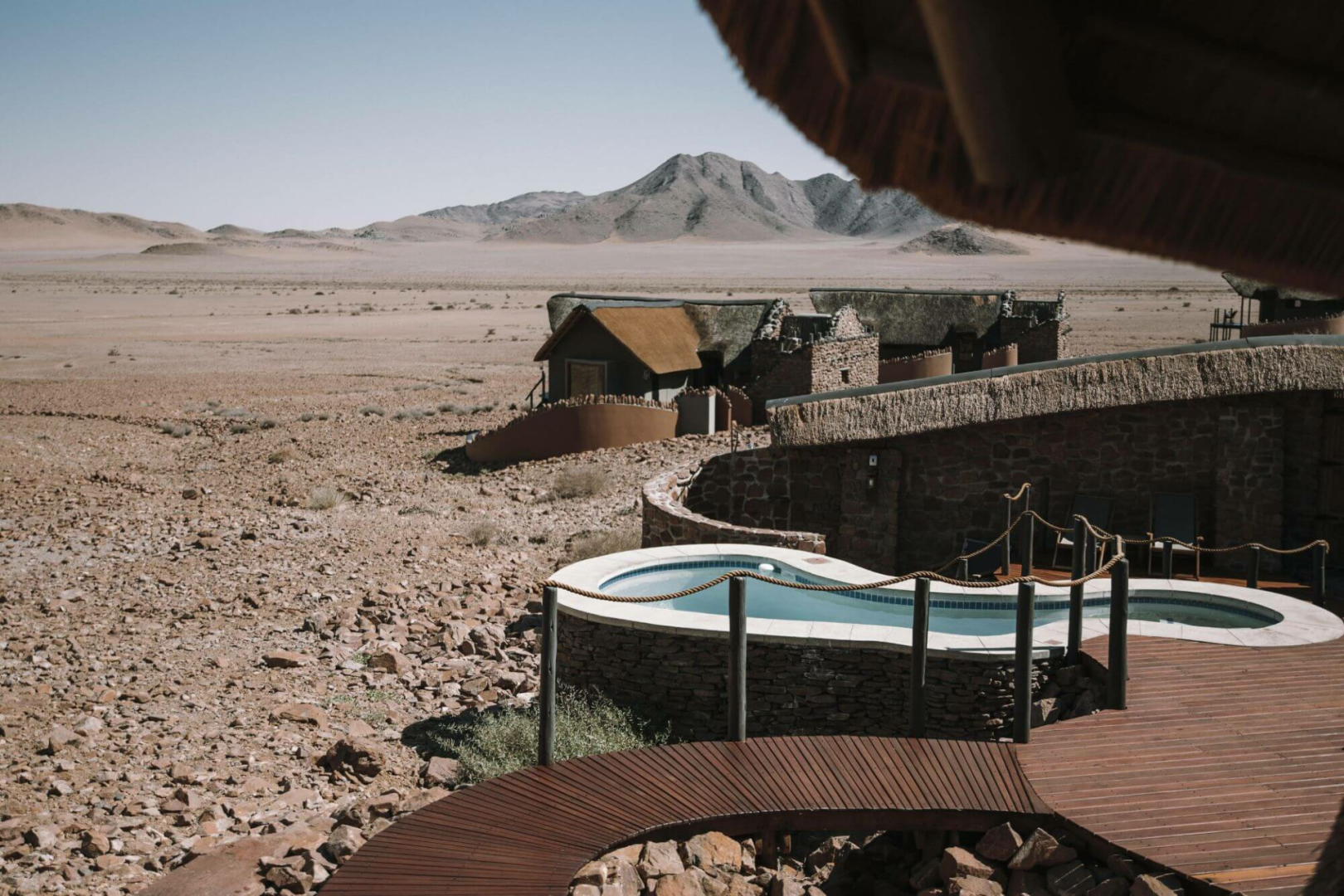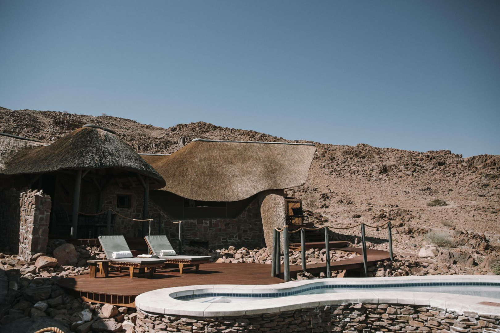 Draußen befindet sich eine Terrasse und ein sehr einladender Swimmingpool mit zahlreichen Sitzgelegenheiten im Schatten. Es gibt auch ein auf einem Hügelgipfel hoch gelegenes Sundowner-Deck, ein fantastischer Ort, um den Sonnenuntergang zu beobachten. Der unglaubliche Panoramablick über die Wüste entschädigt für die Anstrengungen des Aufstiegs.