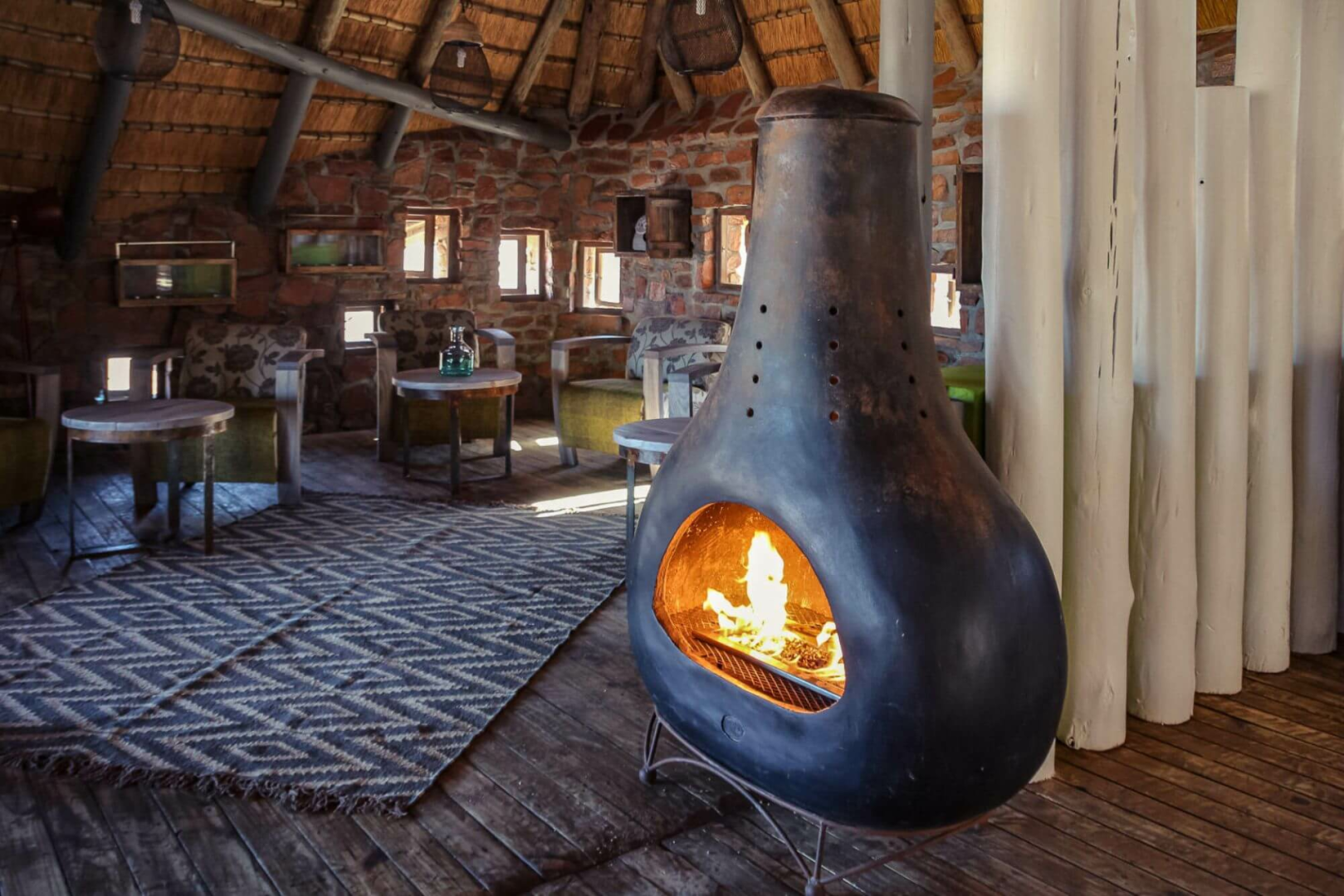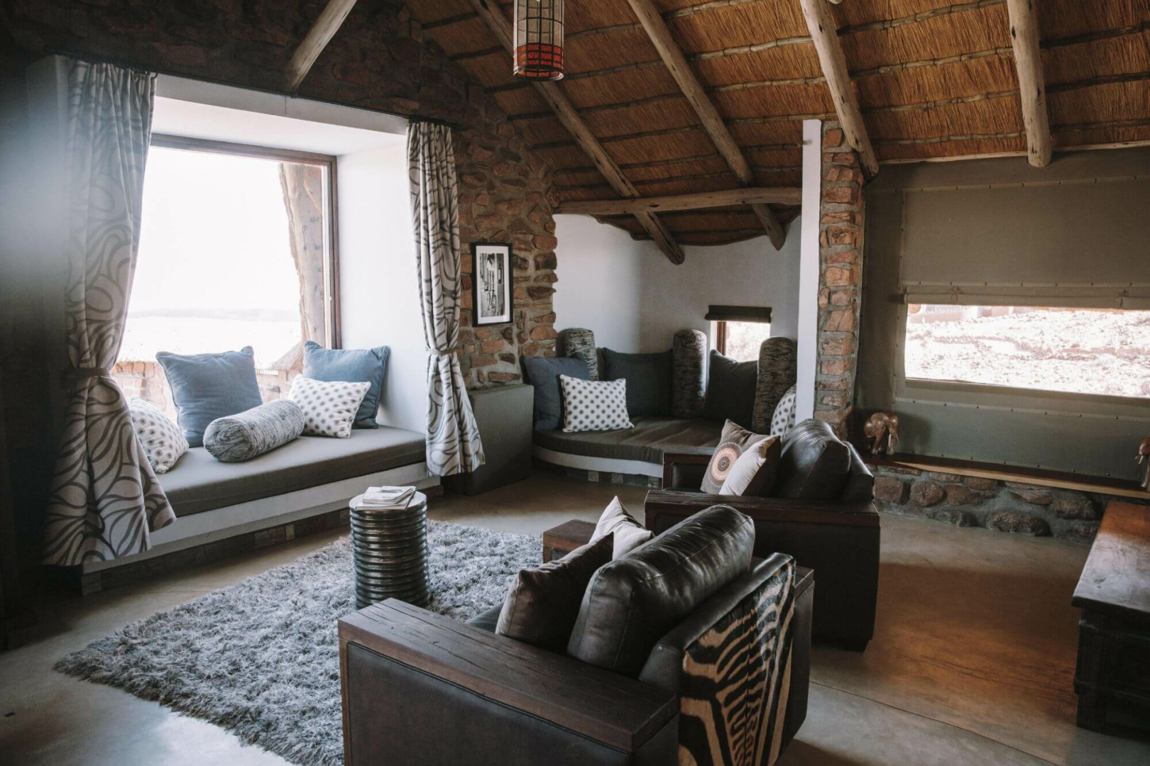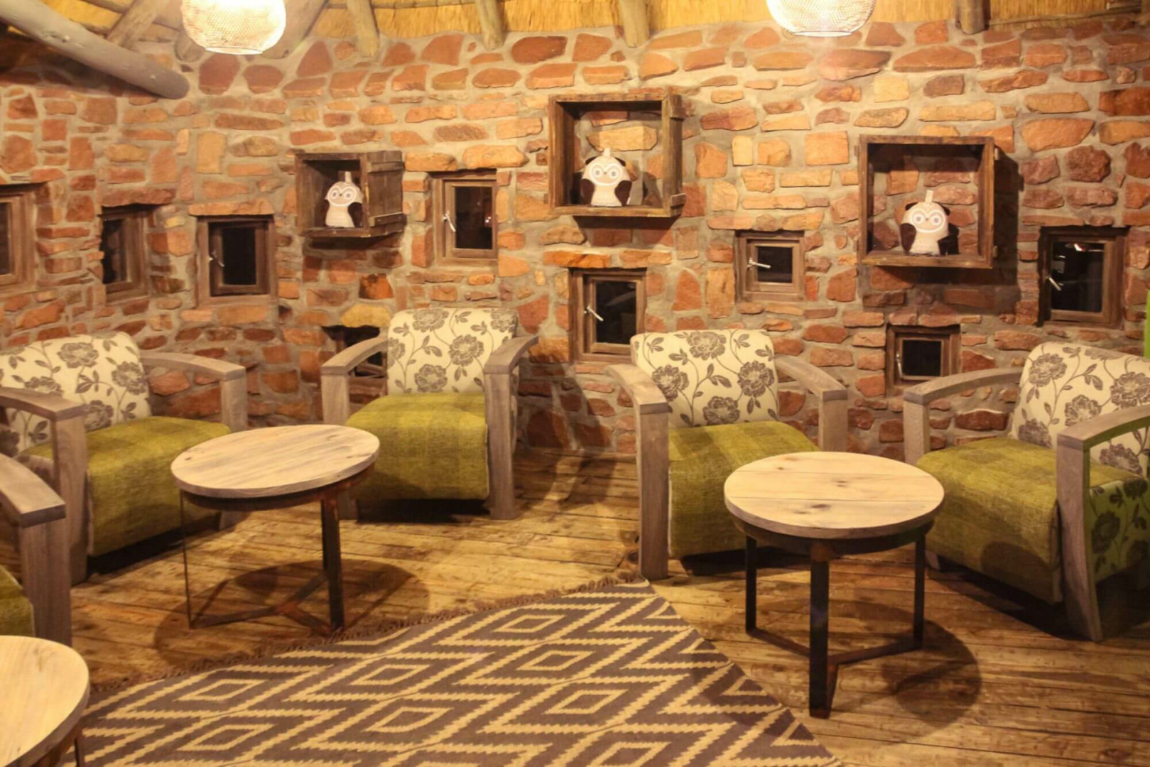 Kernstück der Lodge bildet ein großes Haus aus Stein und Stroh, wo Rezeption, Ess- und Loungebereich mit Bar und Kamin beherbergt sind. Die Inneneinrichtung ist afrikanisch-rustikal und hat sehr viel Charme.