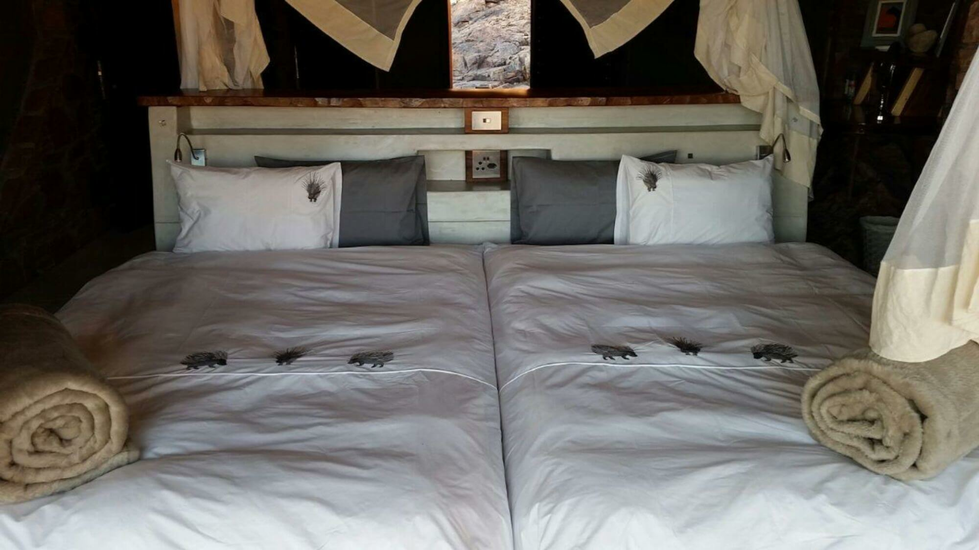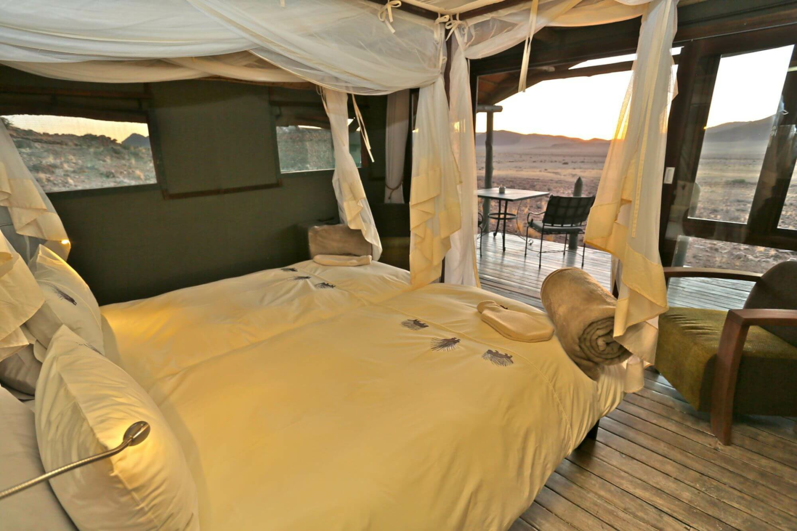 Gäste werden in zwölf großen Luxuszelten untergebracht, die aus einer Mischung aus Strohdach, Stein und Leinen gebaut sind. Die Inneneinrichtung ist elegant ohne übertrieben luxuriös zu sein. Die Badezimmer wirken rustikal mit einer Ziegelsteinwand. Die Zelte sind sehr geräumig, schön eingerichtet und haben eine phänomenale Aussicht von der privaten Veranda. Vielleicht das schönste Merkmal ist das Schlafdeck auf dem Dach: jedes Zimmer ist mit einer Schlafrolle und zusätzlichen Decken ausgestattet, die die Gäste für eine Nacht unter dem Sternenhimmel auf das Schlafdeck mitnehmen können.