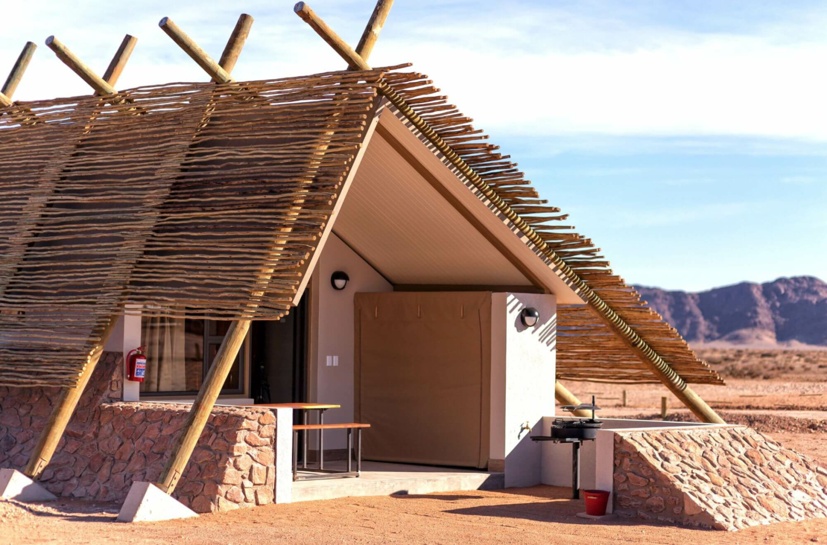 Das Desert Homestead, in einem privaten Naturschutzgebiet 20 km südlich des Tors zum Sossusvlei-Gebiet und mit weitem Panoramablick auf die Naukluft-Berge bietet übernachtenden Gästen ein optimales Preis-und-Leistungsverhältnis im Namib Naukluft Park.