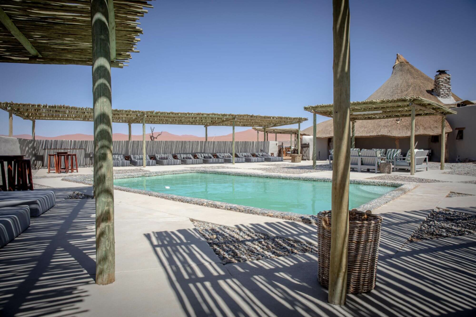 Die Unterbringung erfolgt in 23 wunderschönen aus Lehm gebauten zweistöckigen Suites mit riesigem Badezimmer und Dachterrasse, wo man unter freiem Himmel schlafen kann. Im Hauptgebäude sind Restaurant und Lounge-Bereich untergebracht. Weitläufige Terrassen nah dem Pool laden zum Relaxen ein. Man ist hauptsächlich hier wegen der nah liegenden Sossuvslei-Dünen, Quadfahrten und Ballonfahrten sind auch möglich.