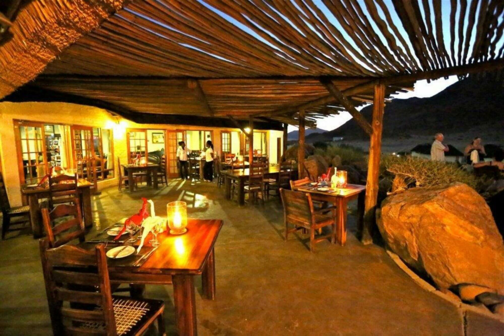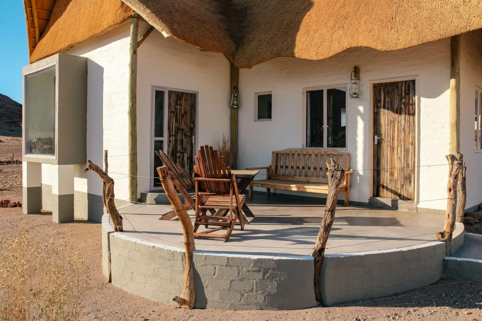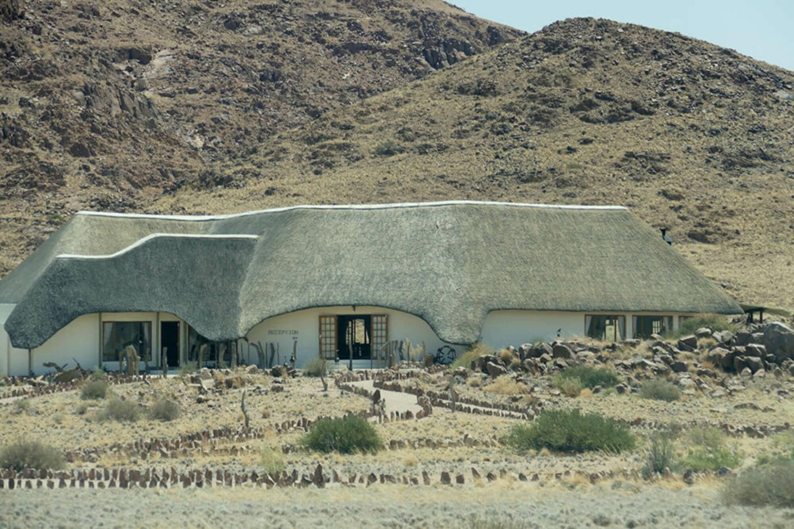 Die reetgedeckte Hauptlodge beherbergt eine Lounge mit Blick von der Veranda auf die umliegende Wüste. Die Inneneinrichtung ist rustikal und gemütlich, mit Restaurant- und Bar-Bereich mit Kamin, wo am Nachmittag hausgemachten Kuchen serviert werden. Von der Lounge und der Veranda führt eine Treppe hinunter zu einem kleinen Pool, der hinter Felsen versteckt und von Sonnenliegen umgeben ist.