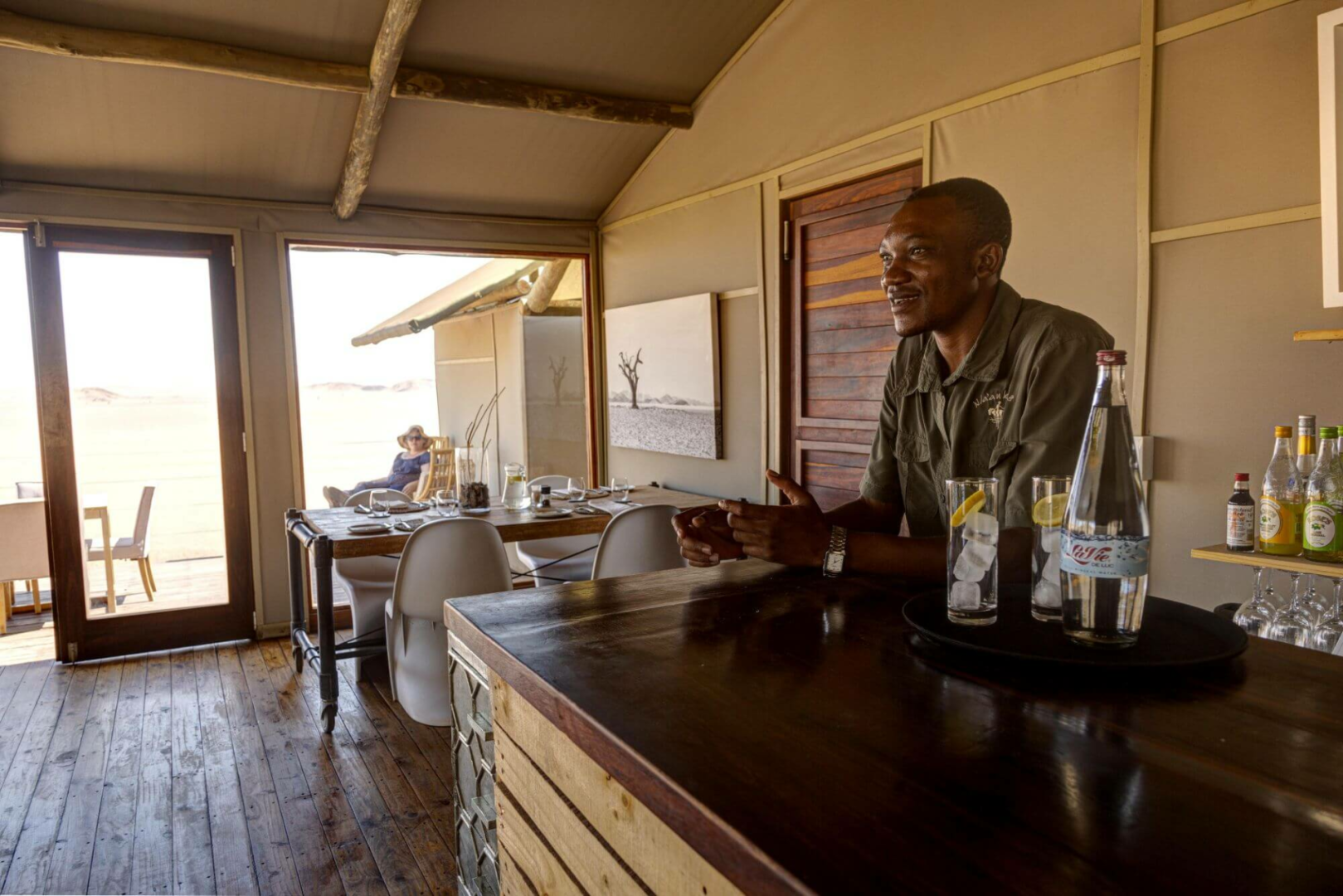 Die Gegend ist ein Paradies für Fotografen. Ausflüge zu den umliegenden Dünen, Sundownders, Wanderungen und Reitausflüge gehören zu den Aktivitäten hier. Zur Lodge gehört auch ein großes Gehege für zwei gerettete Geparden, die nicht wieder in die freie Wildbahn entlassen werden können. An der Fütterung können Gäste gerne teilnehmen.