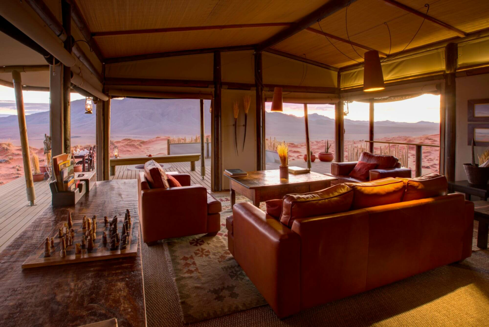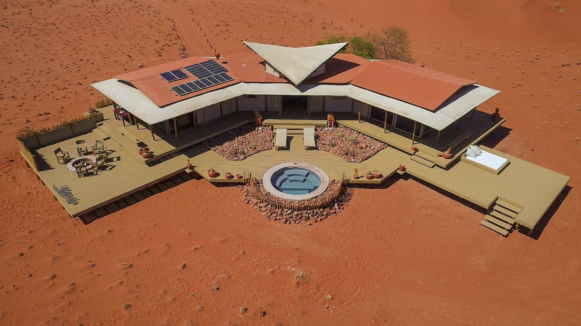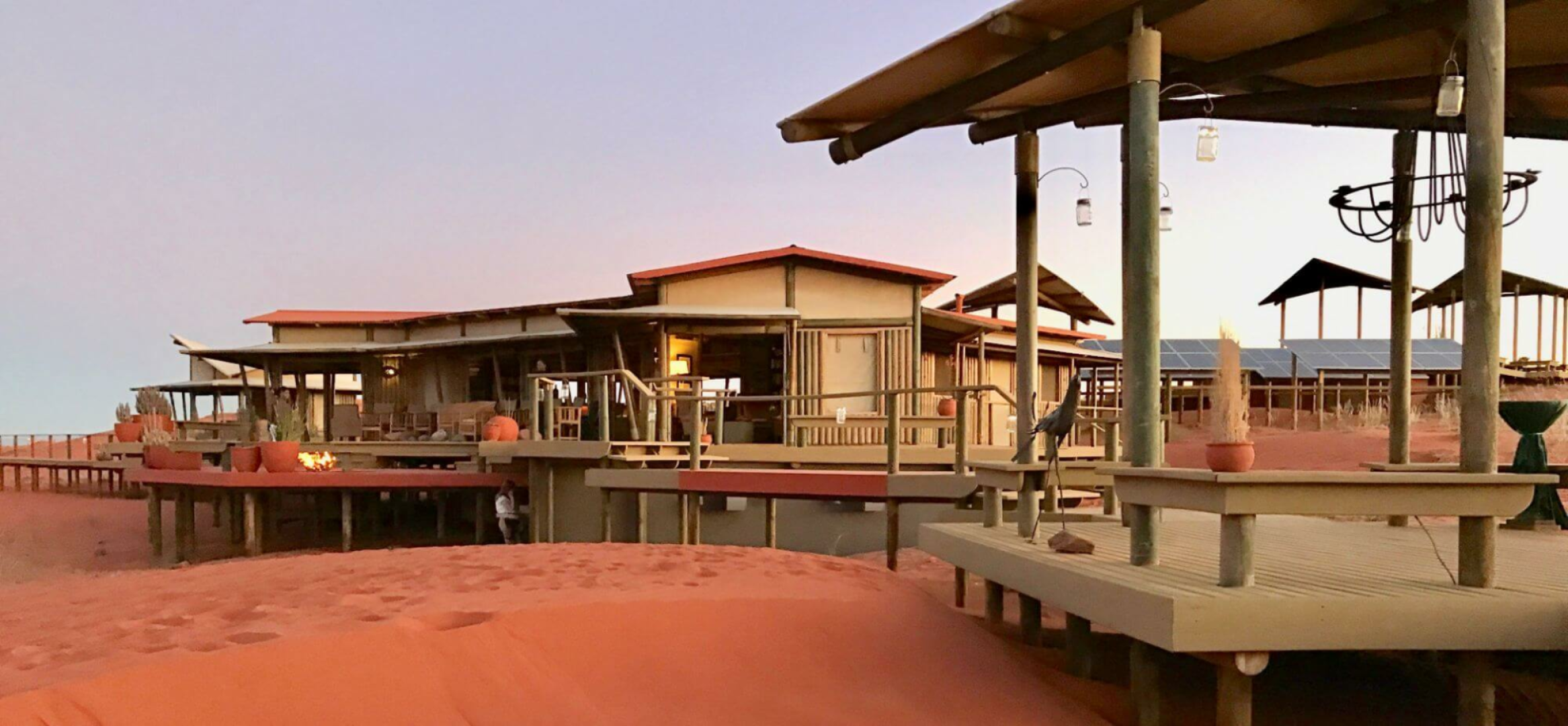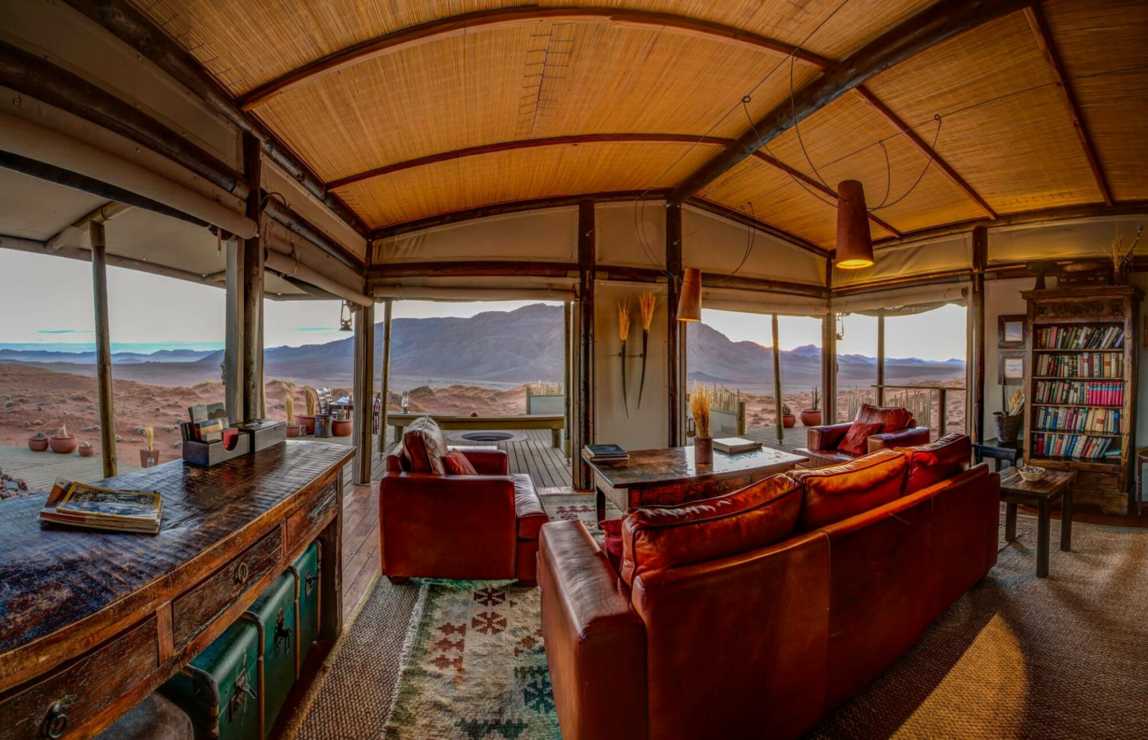 Herzstück der Lodge bilden mehrere Konstruktionen aus Leinen und Holz, die auf Plattformen über die Wüste erbaut sind und Bar und Lounge mit Ledersesseln, eine Bibliothek und zwei Essbereiche beherbergen. Alle Aufenthaltsbereiche sind hin zur Wüste offen und bieten einen einmaligen schönen Anblick. Es gibt auch auf der riesigen Terrasse einen kleinen, aber schönen runden Pool, wo man sich von der Hitze erholen kann. Eine schöne Feuerstelle, um den Tag bei einem Drink genussvoll zu verabschieden, ist natürlich auch hier zu finden.