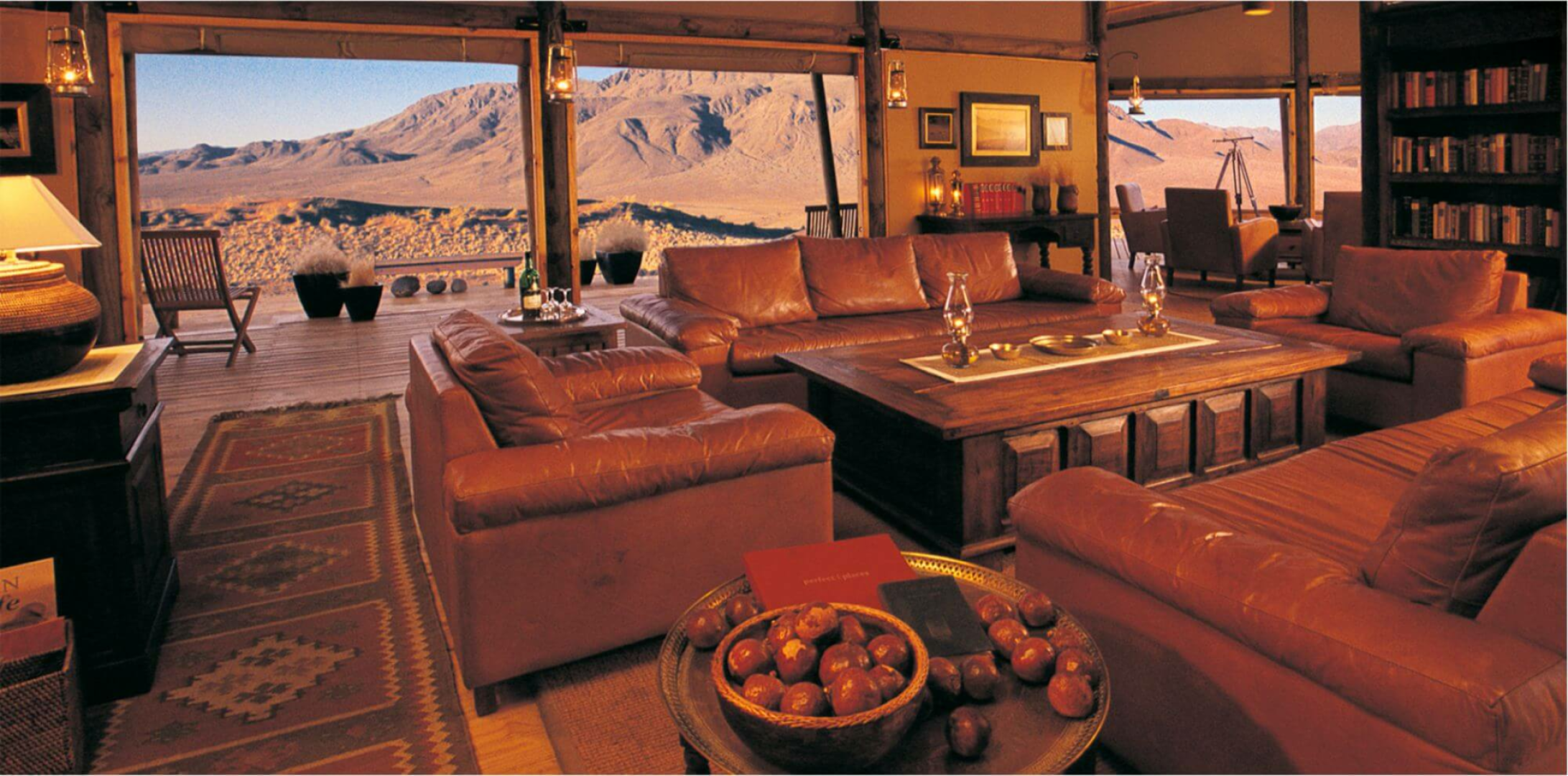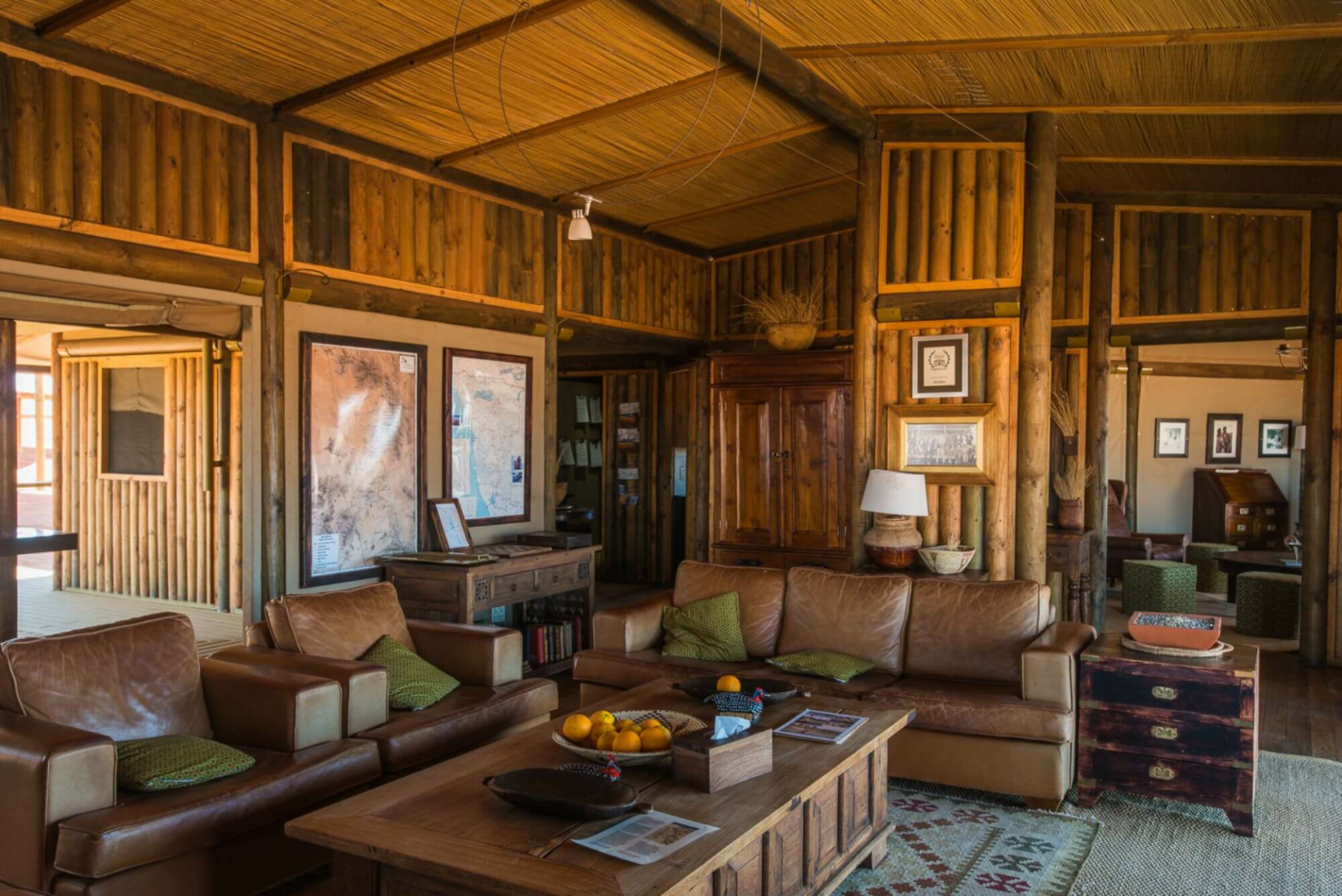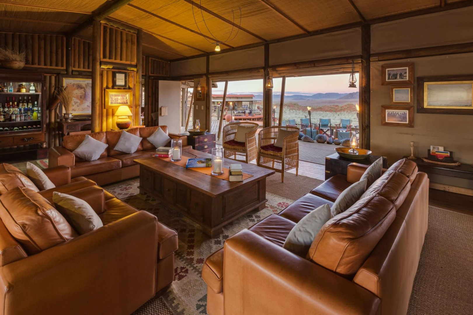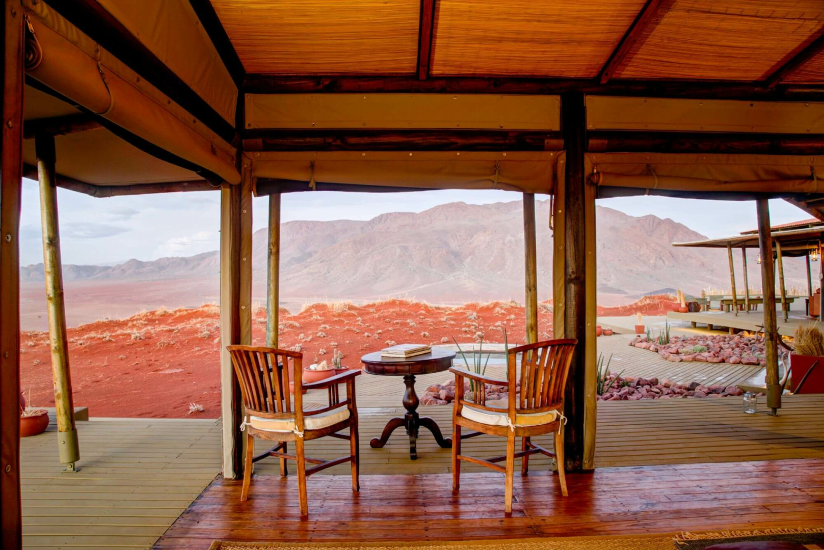 Herzstück der Lodge bilden mehrere Konstruktionen aus Leinen und Holz, die auf Plattformen über die Wüste erbaut sind und Bar und Lounge mit Ledersesseln, eine Bibliothek und zwei Essbereiche beherbergen. Alle Aufenthaltsbereiche sind hin zur Wüste offen und bieten einen einmaligen schönen Anblick. Es gibt auch auf der riesigen Terrasse einen kleinen, aber schönen runden Pool, wo man sich von der Hitze erholen kann. Eine schöne Feuerstelle, um den Tag bei einem Drink genussvoll zu verabschieden, ist natürlich auch hier zu finden.