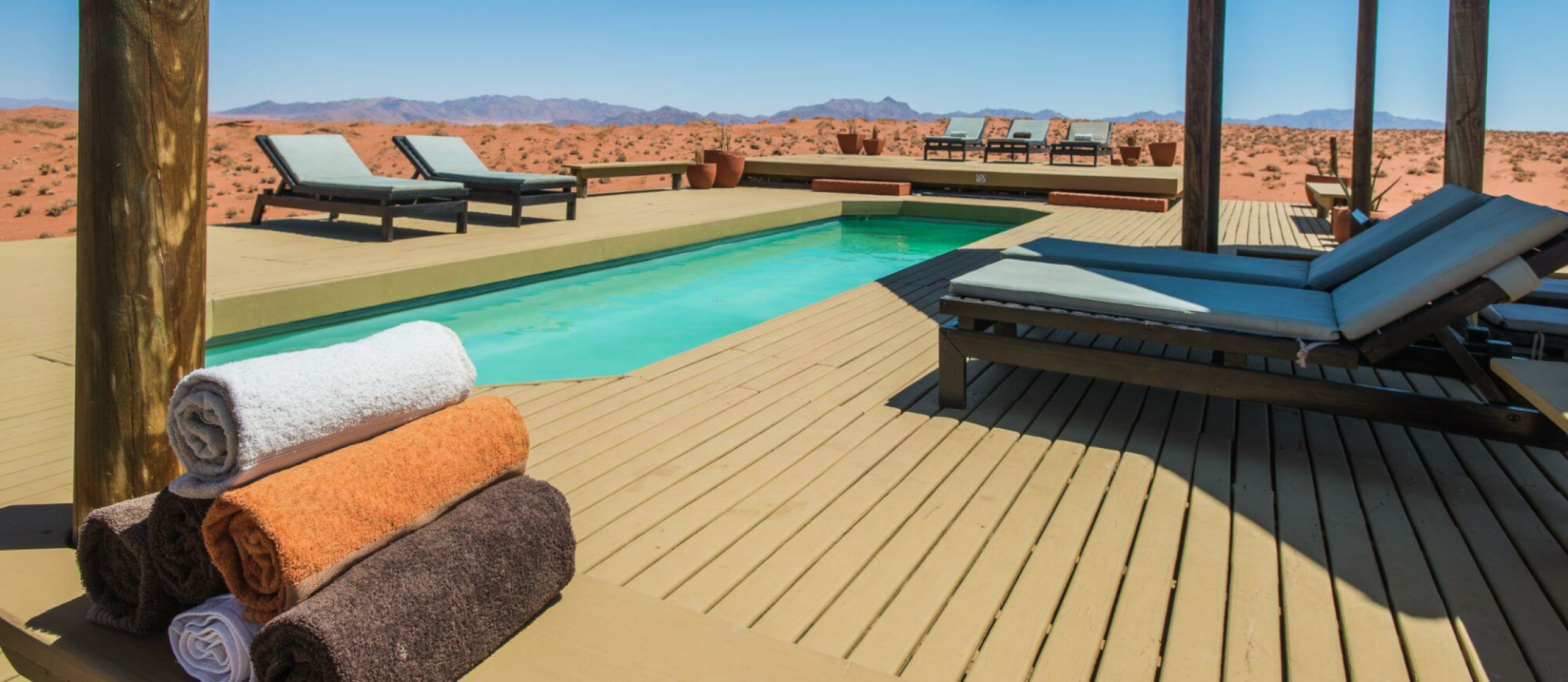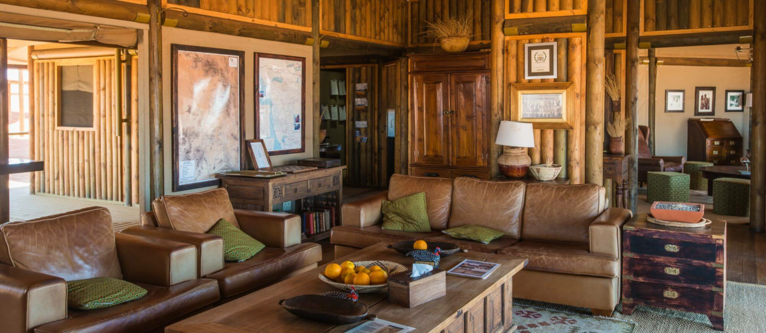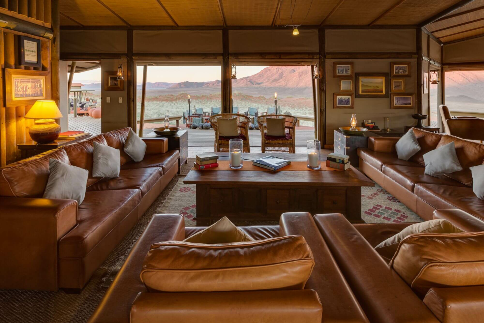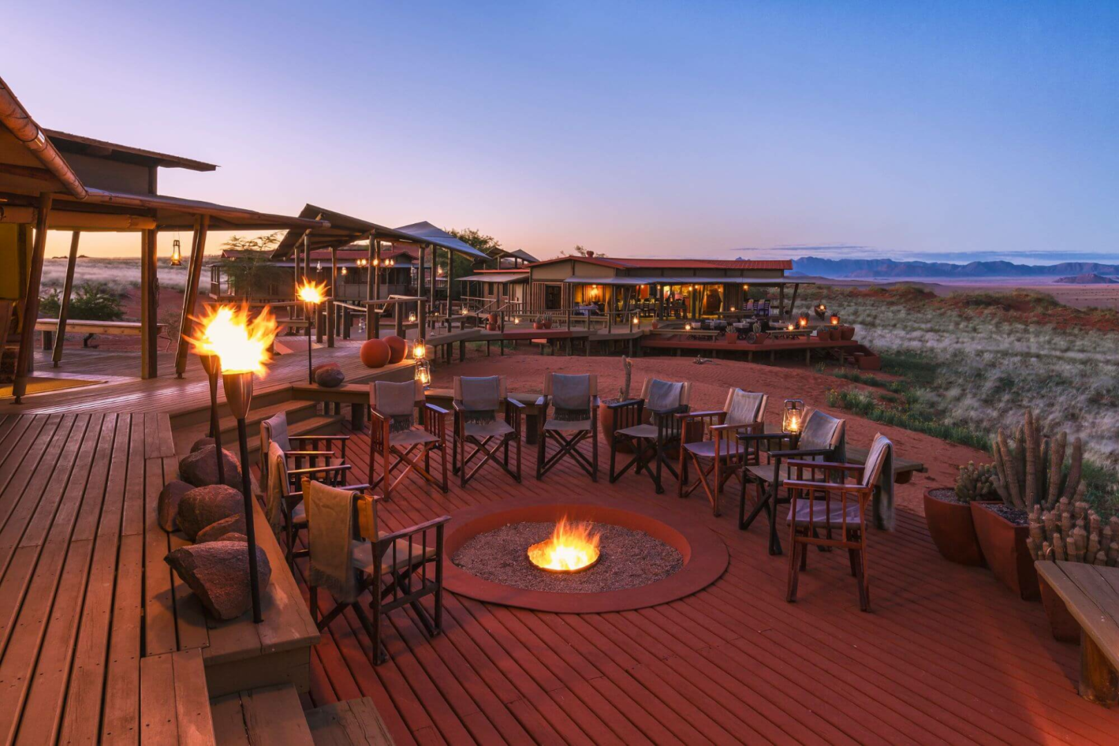 Herzstück der Lodge bilden mehrere Konstruktionen aus Leinen und Holz, die auf Plattformen über die Wüste erbaut sind und Bar und Lounge mit Ledersesseln, eine Bibliothek und zwei Essbereiche beherbergen. Alle Aufenthaltsbereiche sind hin zur Wüste offen und bieten einen einmaligen schönen Anblick. Es gibt auch auf der riesigen Terrasse einen kleinen, aber schönen runden Pool, wo man sich von der Hitze erholen kann. Eine schöne Feuerstelle, um den Tag bei einem Drink genussvoll zu verabschieden, ist natürlich auch hier zu finden.