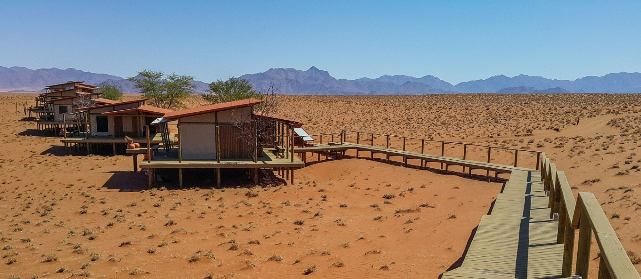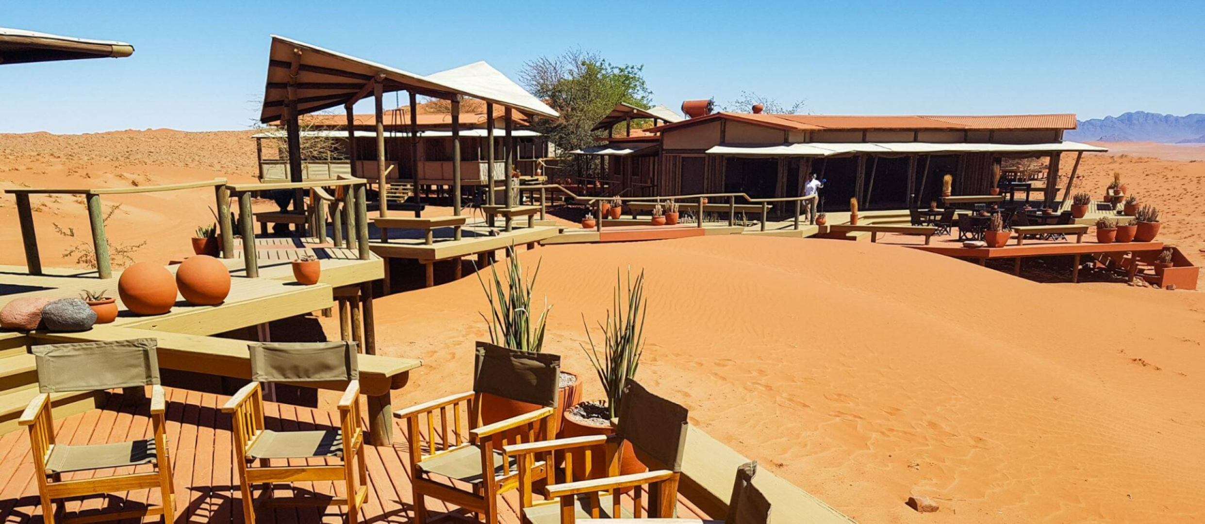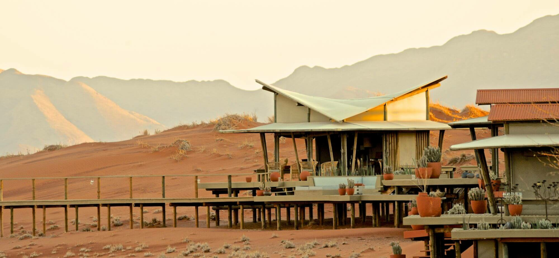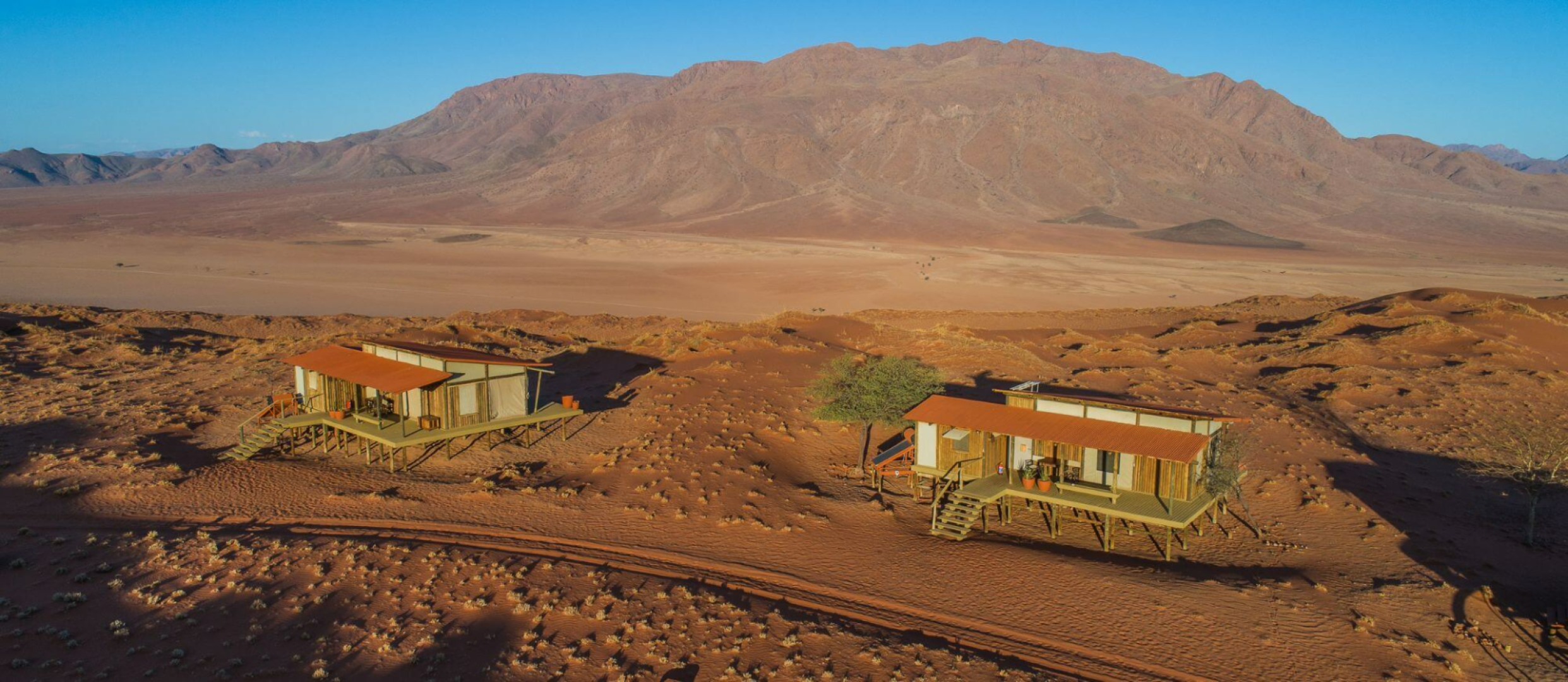 Sandige Wege und Stege über die Dünen verbinden die gemeinsamen Bereiche der Dunes Lodge mit den neun Chalets der Lodge. Diese wurden aus Holz und Leinen angefertigt. Wie auch die gemeinsamen Bereiche wurden die Chalets hoch über die Dünenlandschaft auf Plattformen errichtet. Holzdecks umgeben die Chalets fast vollständig. Hier befinden sich zahlreiche Sitzmöglichkeiten, eingebaute Bänken und Liegestühle, um das Wüstenpanorama zu genießen. Innen sind die Zimmer ein Traum. Massive Himmelsbetten mit Moskitonetzen, Gepäckablage, ein Schreibtisch und bequeme Sitzgelegenheiten sind vorhanden. Die Segeltuchvorhänge an den Wänden können vollständig aufgerollt werden und geben den Blick auf die umliegende Wüste frei. Es ist ein unbeschreiblicher Privileg, die grandiose Aussicht über die Wüste direkt vom Bett aus zu genießen! Auf Wunsch werden die Betten auch auf die Veranda verlegt, um den Gäste, die Möglichkeit zu geben, unter den Sternen zu schlafen.