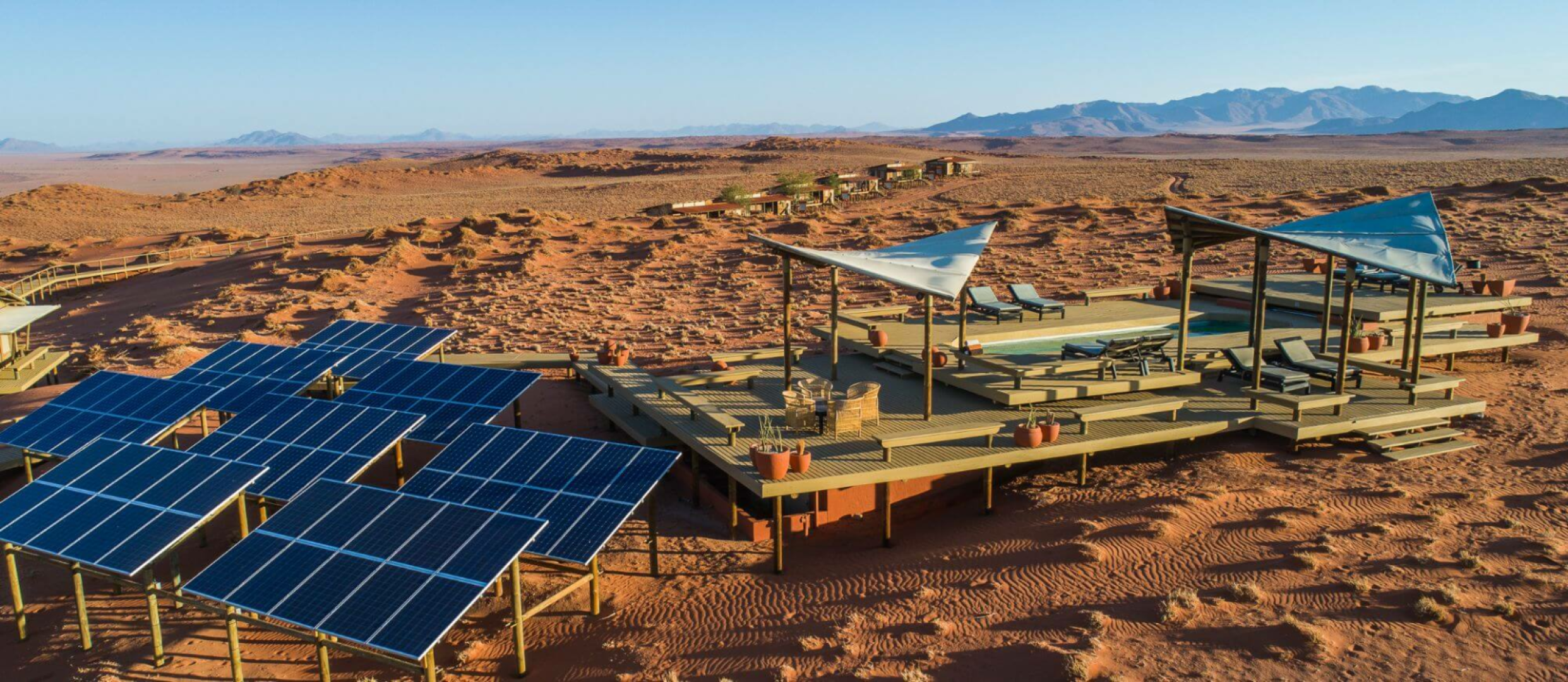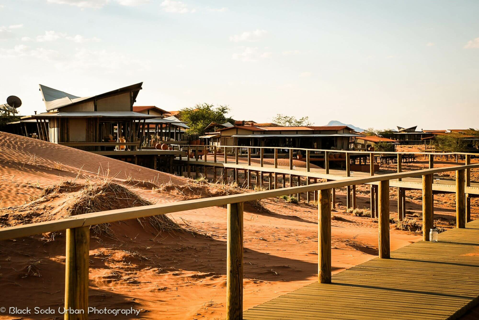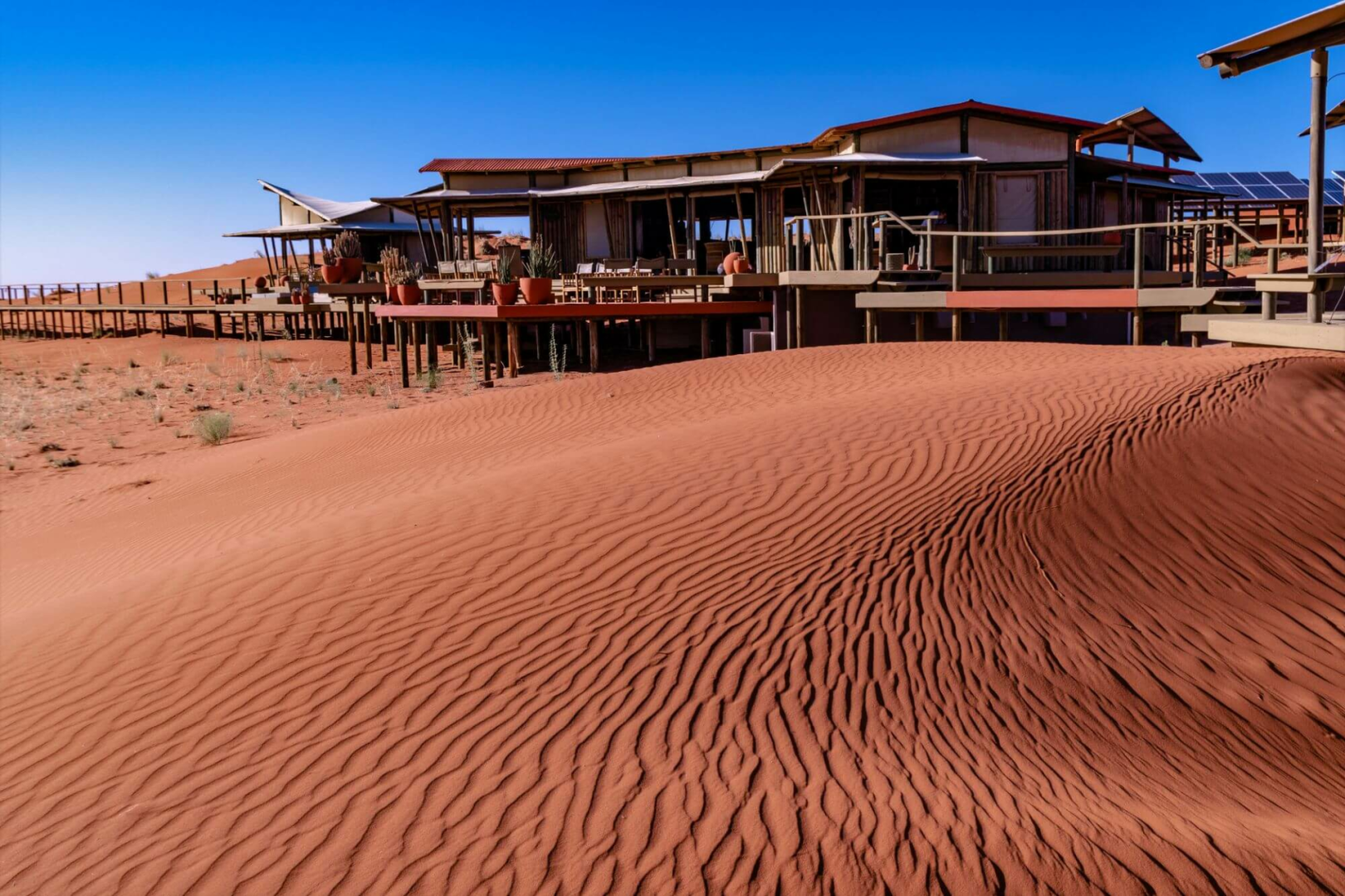 Sandige Wege und Stege über die Dünen verbinden die gemeinsamen Bereiche der Dunes Lodge mit den neun Chalets der Lodge. Diese wurden aus Holz und Leinen angefertigt. Wie auch die gemeinsamen Bereiche wurden die Chalets hoch über die Dünenlandschaft auf Plattformen errichtet. Holzdecks umgeben die Chalets fast vollständig. Hier befinden sich zahlreiche Sitzmöglichkeiten, eingebaute Bänken und Liegestühle, um das Wüstenpanorama zu genießen. Innen sind die Zimmer ein Traum. Massive Himmelsbetten mit Moskitonetzen, Gepäckablage, ein Schreibtisch und bequeme Sitzgelegenheiten sind vorhanden. Die Segeltuchvorhänge an den Wänden können vollständig aufgerollt werden und geben den Blick auf die umliegende Wüste frei. Es ist ein unbeschreiblicher Privileg, die grandiose Aussicht über die Wüste direkt vom Bett aus zu genießen! Auf Wunsch werden die Betten auch auf die Veranda verlegt, um den Gäste, die Möglichkeit zu geben, unter den Sternen zu schlafen.