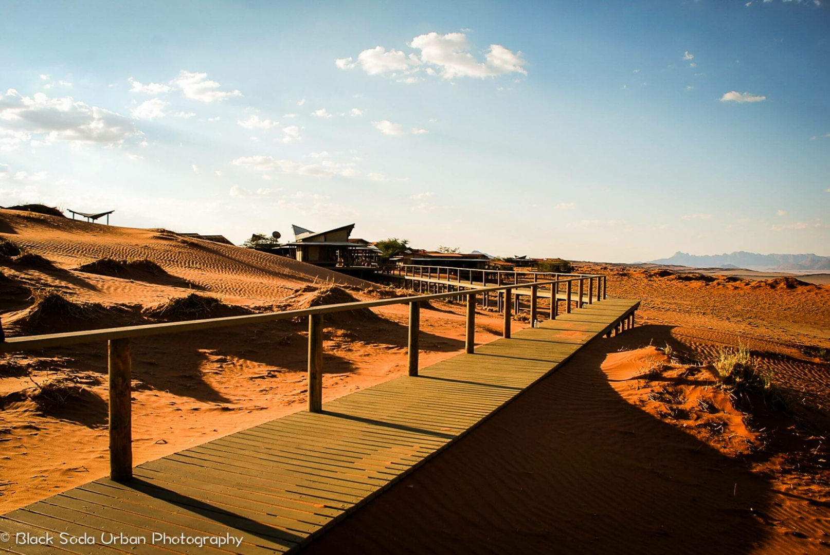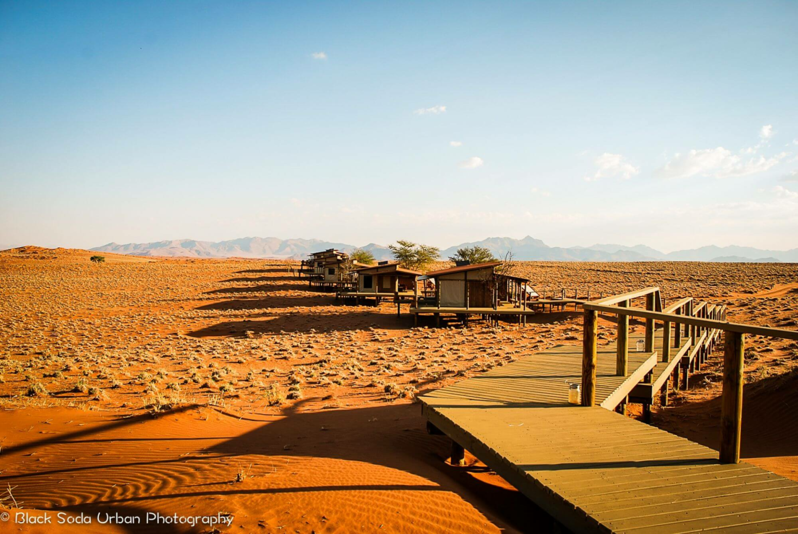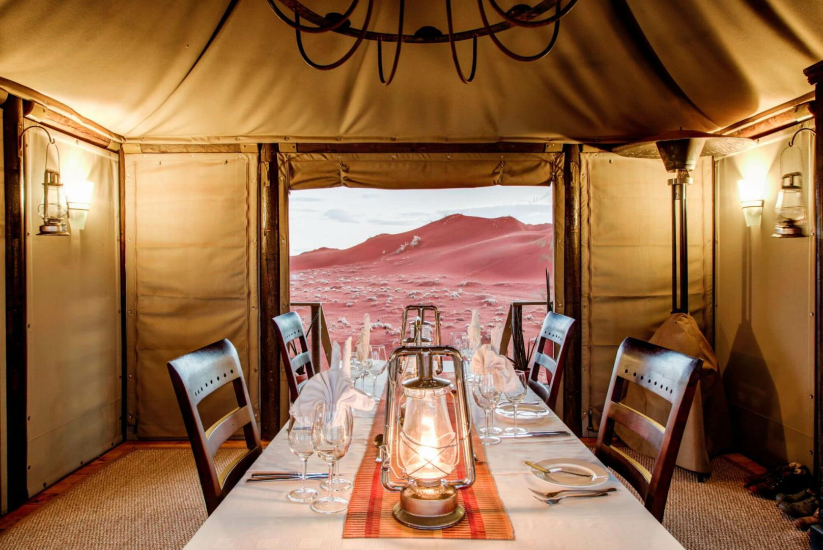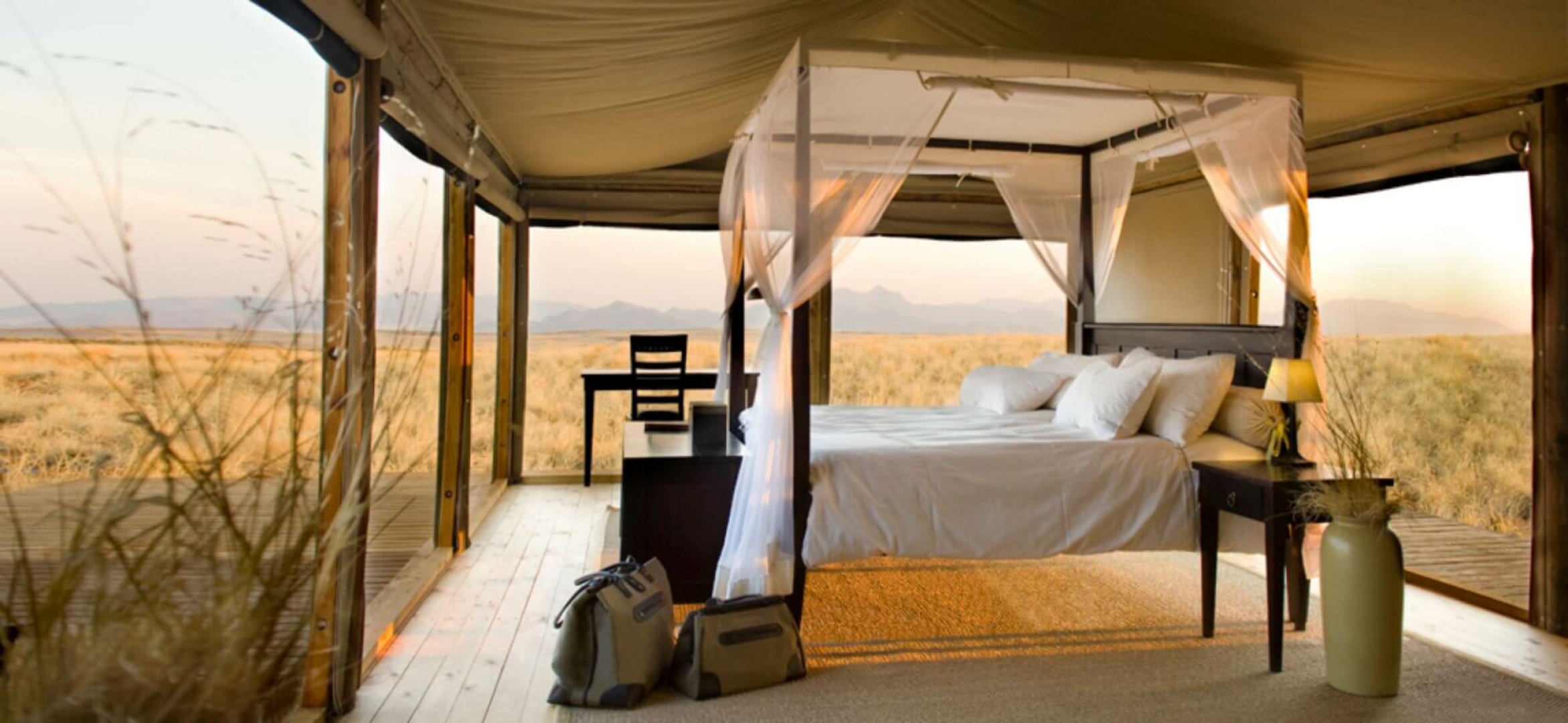 Sandige Wege und Stege über die Dünen verbinden die gemeinsamen Bereiche der Dunes Lodge mit den neun Chalets der Lodge. Diese wurden aus Holz und Leinen angefertigt. Wie auch die gemeinsamen Bereiche wurden die Chalets hoch über die Dünenlandschaft auf Plattformen errichtet. Holzdecks umgeben die Chalets fast vollständig. Hier befinden sich zahlreiche Sitzmöglichkeiten, eingebaute Bänken und Liegestühle, um das Wüstenpanorama zu genießen. Innen sind die Zimmer ein Traum. Massive Himmelsbetten mit Moskitonetzen, Gepäckablage, ein Schreibtisch und bequeme Sitzgelegenheiten sind vorhanden. Die Segeltuchvorhänge an den Wänden können vollständig aufgerollt werden und geben den Blick auf die umliegende Wüste frei. Es ist ein unbeschreiblicher Privileg, die grandiose Aussicht über die Wüste direkt vom Bett aus zu genießen! Auf Wunsch werden die Betten auch auf die Veranda verlegt, um den Gäste, die Möglichkeit zu geben, unter den Sternen zu schlafen.