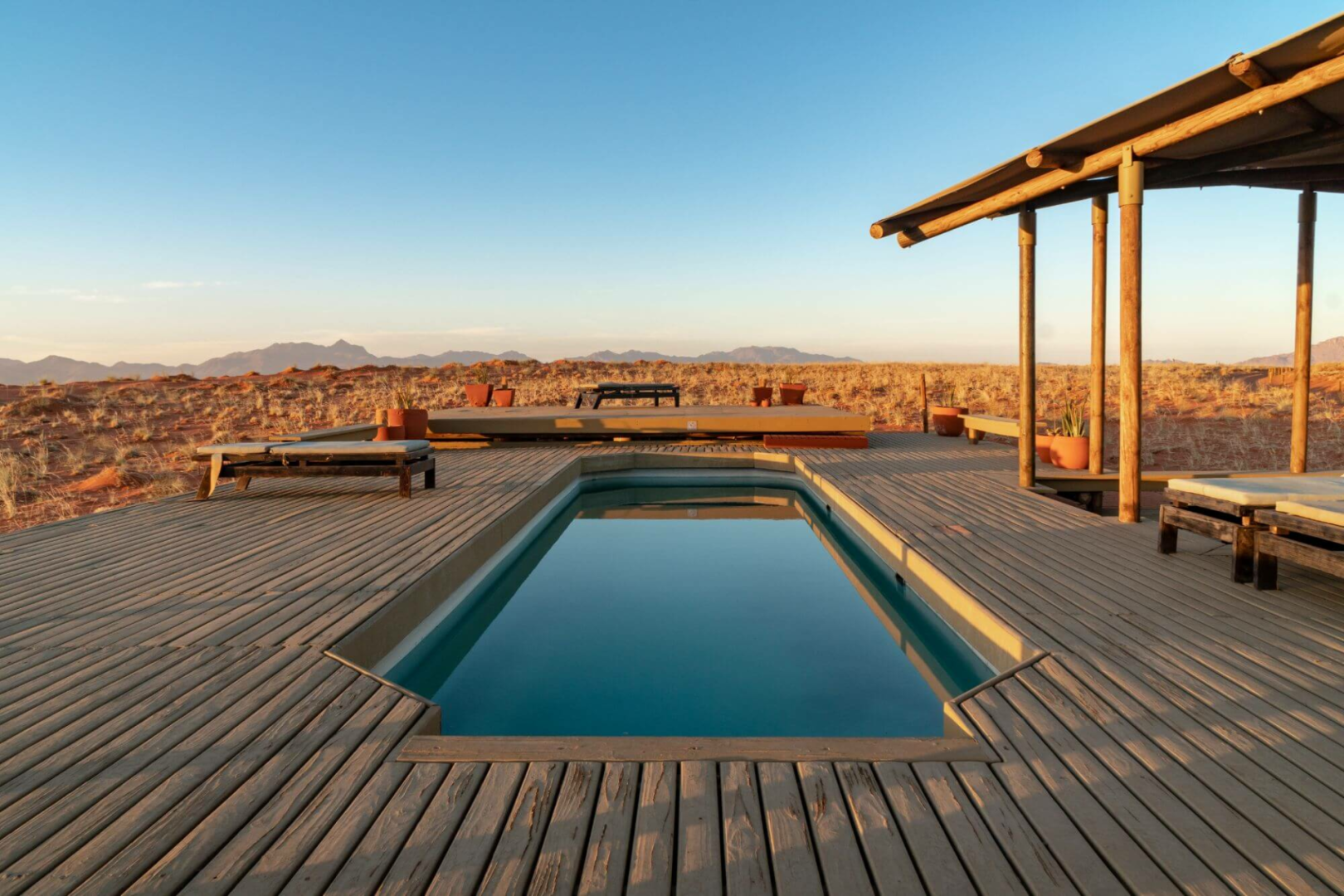 Die Wolwedans Dunes Lodge ist die größte (auch wenn bei 9 Wohneinheiten sich die Größe wahrhaftig in Grenzen hält) aller Wolwedans Camps im Namibrand Nature Reserve, einem 2.100 km² großen Gebiet in der Namib-Wüste im Süden Namibias.