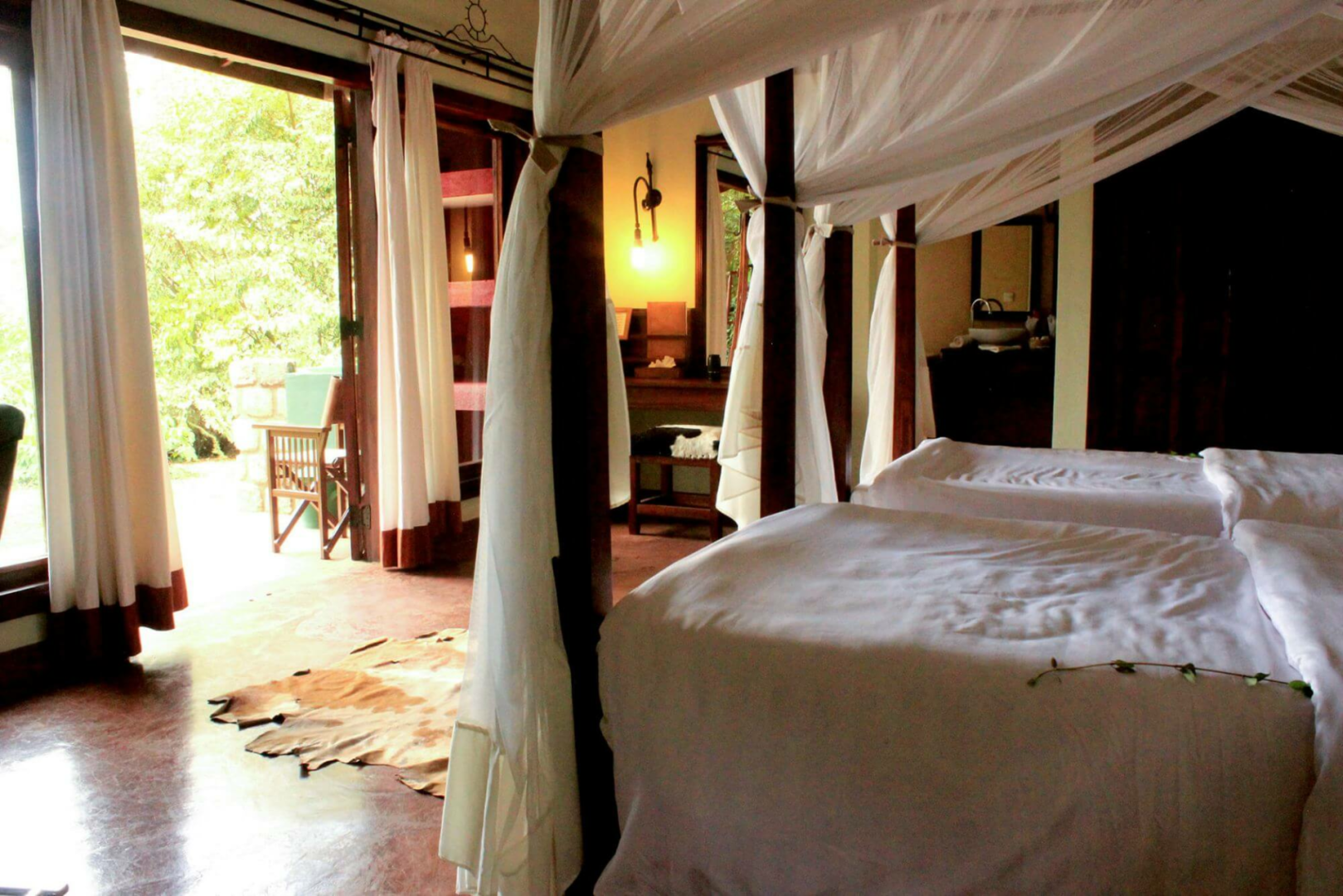 Die stilvollen Zimmer mit großem Panoramafenster und Kamin, welche in zwei massiven Bungalowreihen untergebracht sind, sind sehr geschmackvoll dekoriert und verfügen über ein mehr als dezentes Badezimmer mit Badewanne, sowie Innen- und Außendusche. Die gemeinsamen Aufenthaltsbereiche sind ebenso angenehm gestaltet und die üppig bewachsene Gartenananlage inkl. Pool gepflegt.
