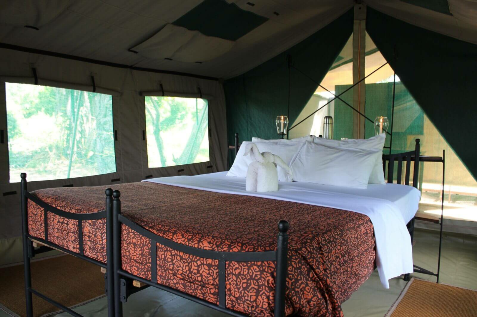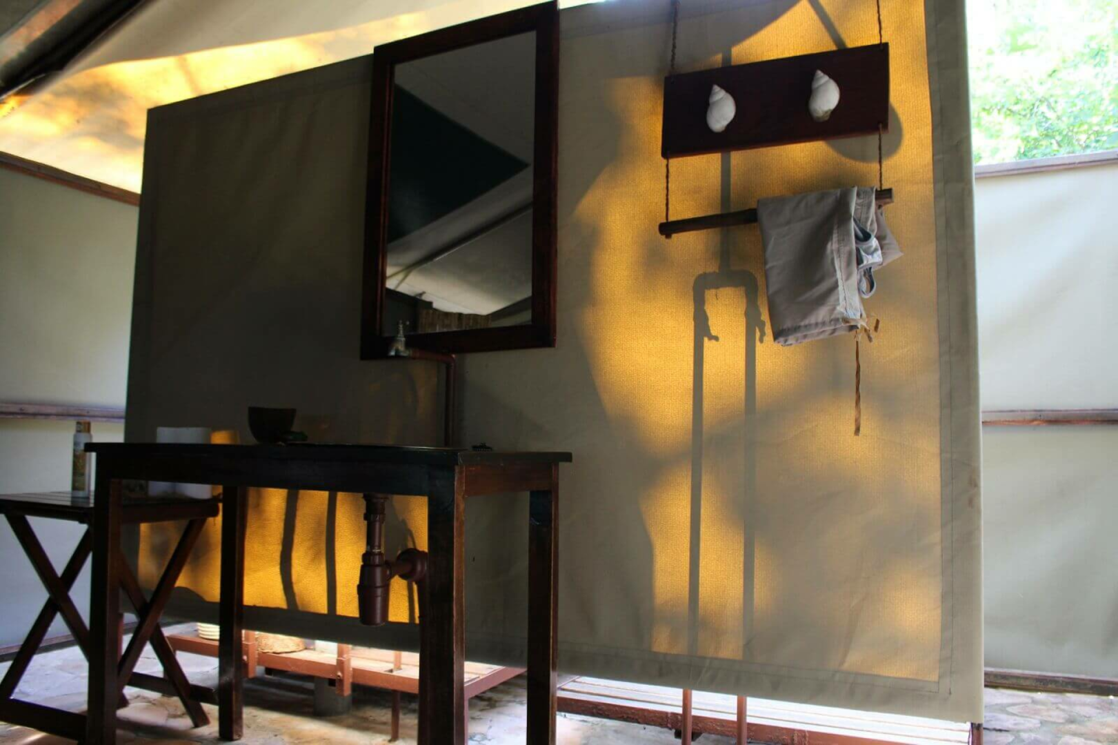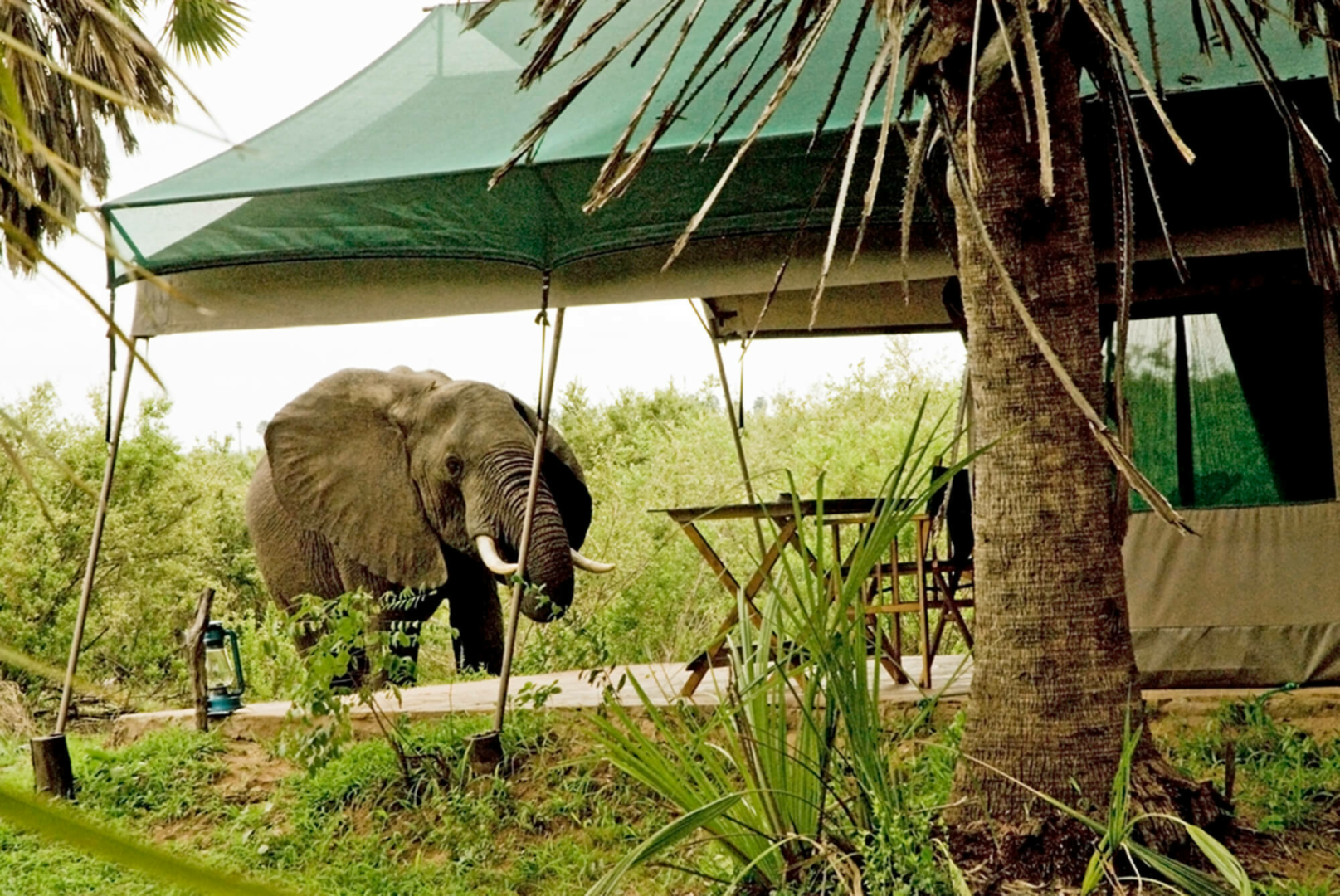 Vor dem Mess-Zelt wird das Abendessen gemeinsam eingenommen. Ein sehr erfahrenes Paar aus Südafrika managt das Camp und als passionierte Wildlife – Spezialisten geht es Ihnen dabei um ein authentisches Safarierlebnis in einer lockeren und entspannten Atmosphäre. Im Camp gibt es keinen Strom, eine Akkuaufladestation ist vorhanden. Die Zelte sind einfach, aber ausreichend ausgestattet, es gibt eine kleine Veranda und eine Freiluftdusche, die mittels einer Solaranlage mit warmem Wasser versorgt wird.