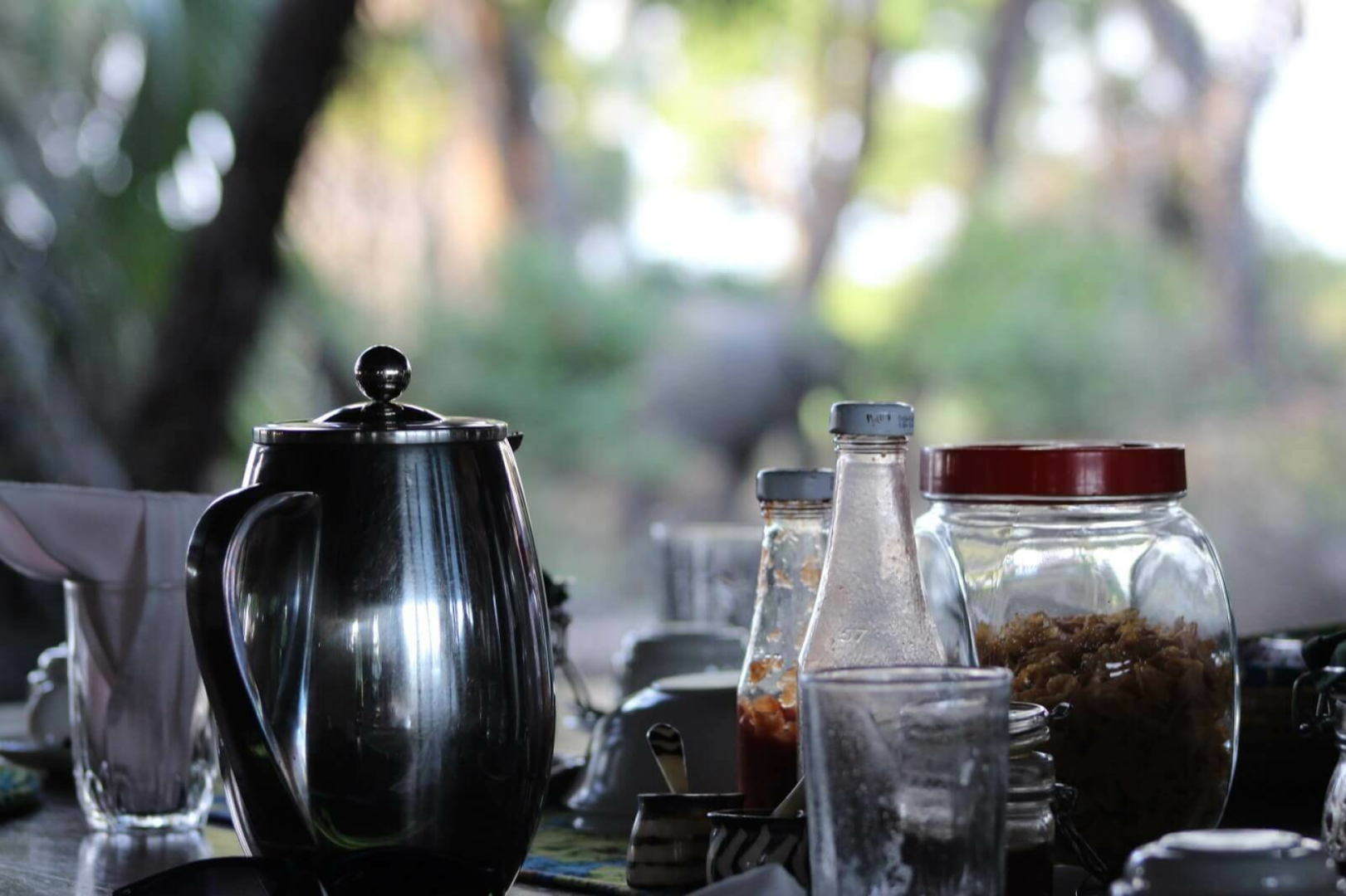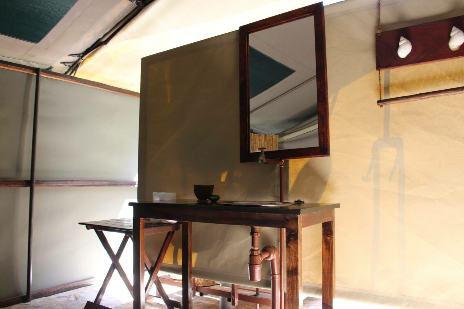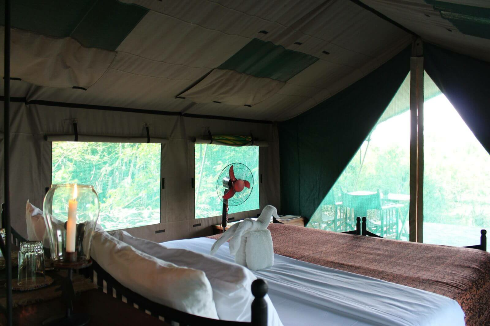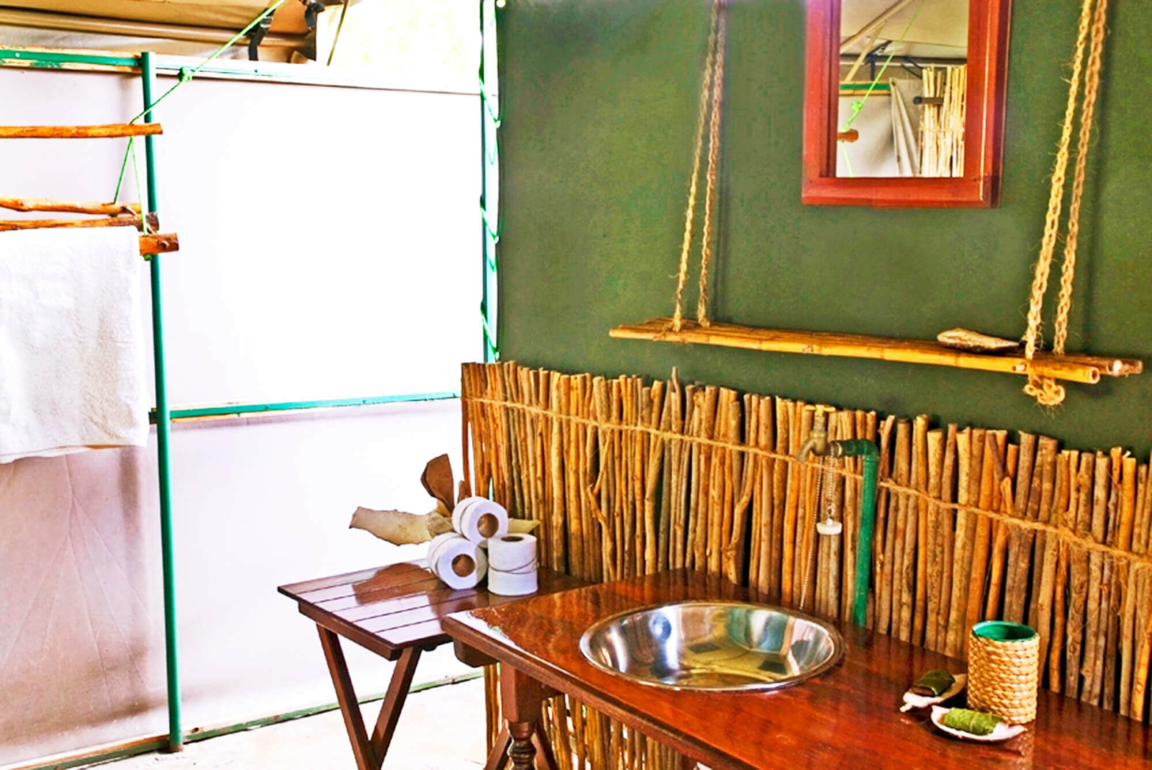 Vor dem Mess-Zelt wird das Abendessen gemeinsam eingenommen. Ein sehr erfahrenes Paar aus Südafrika managt das Camp und als passionierte Wildlife – Spezialisten geht es Ihnen dabei um ein authentisches Safarierlebnis in einer lockeren und entspannten Atmosphäre. Im Camp gibt es keinen Strom, eine Akkuaufladestation ist vorhanden. Die Zelte sind einfach, aber ausreichend ausgestattet, es gibt eine kleine Veranda und eine Freiluftdusche, die mittels einer Solaranlage mit warmem Wasser versorgt wird.