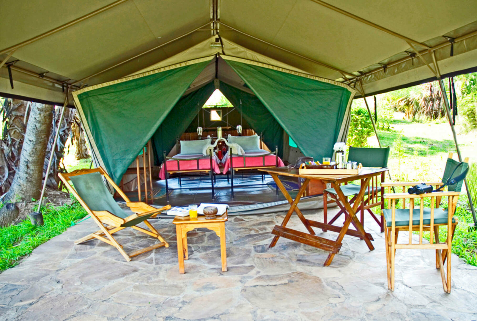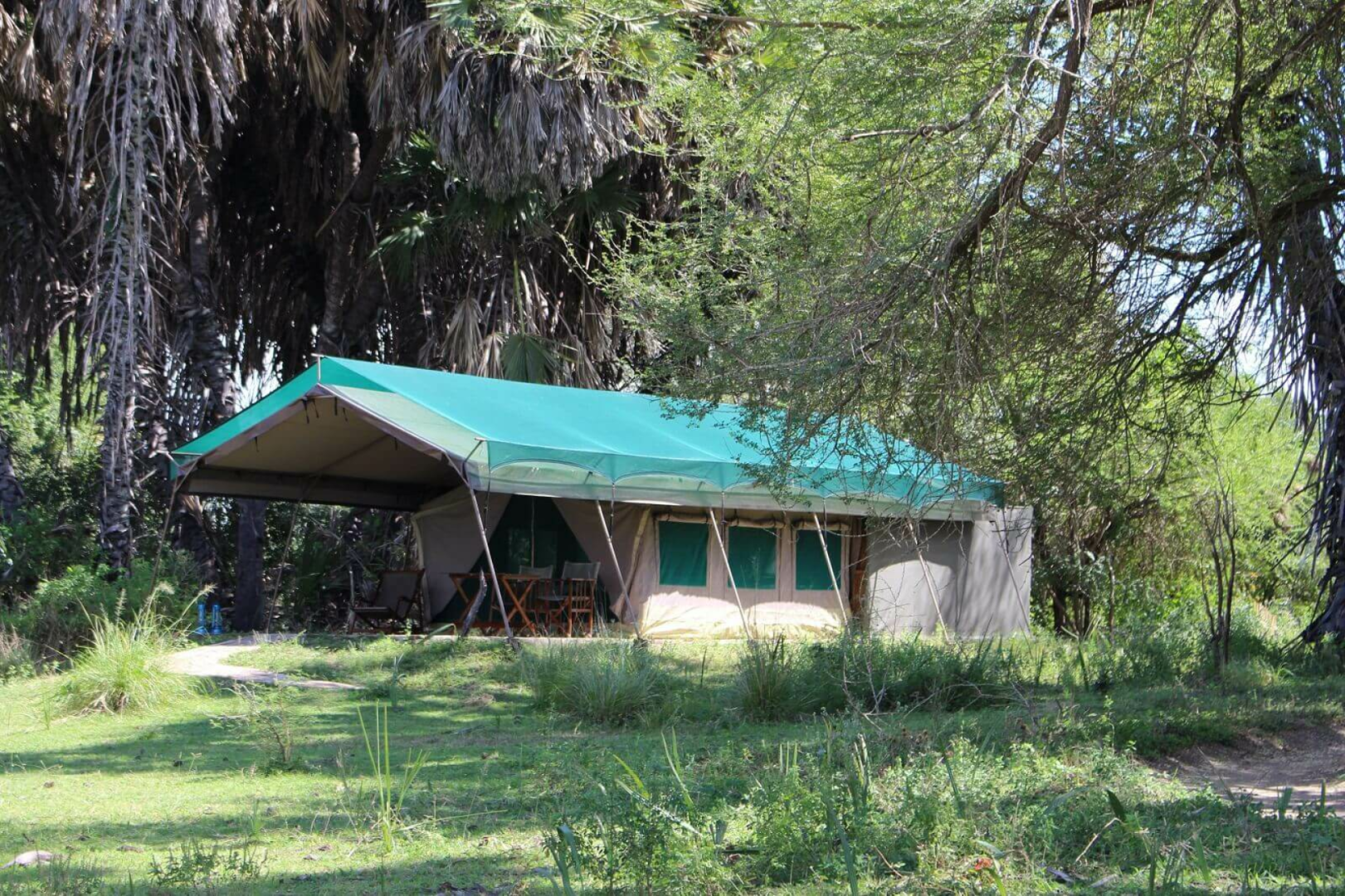 Im Jahr 2010 erweitert und upgegraded bietet die Lodge ca. zehn großzügige Zelte unter Reetdach, die auf einem festen Holzuntergrund...