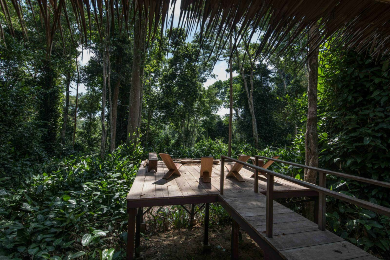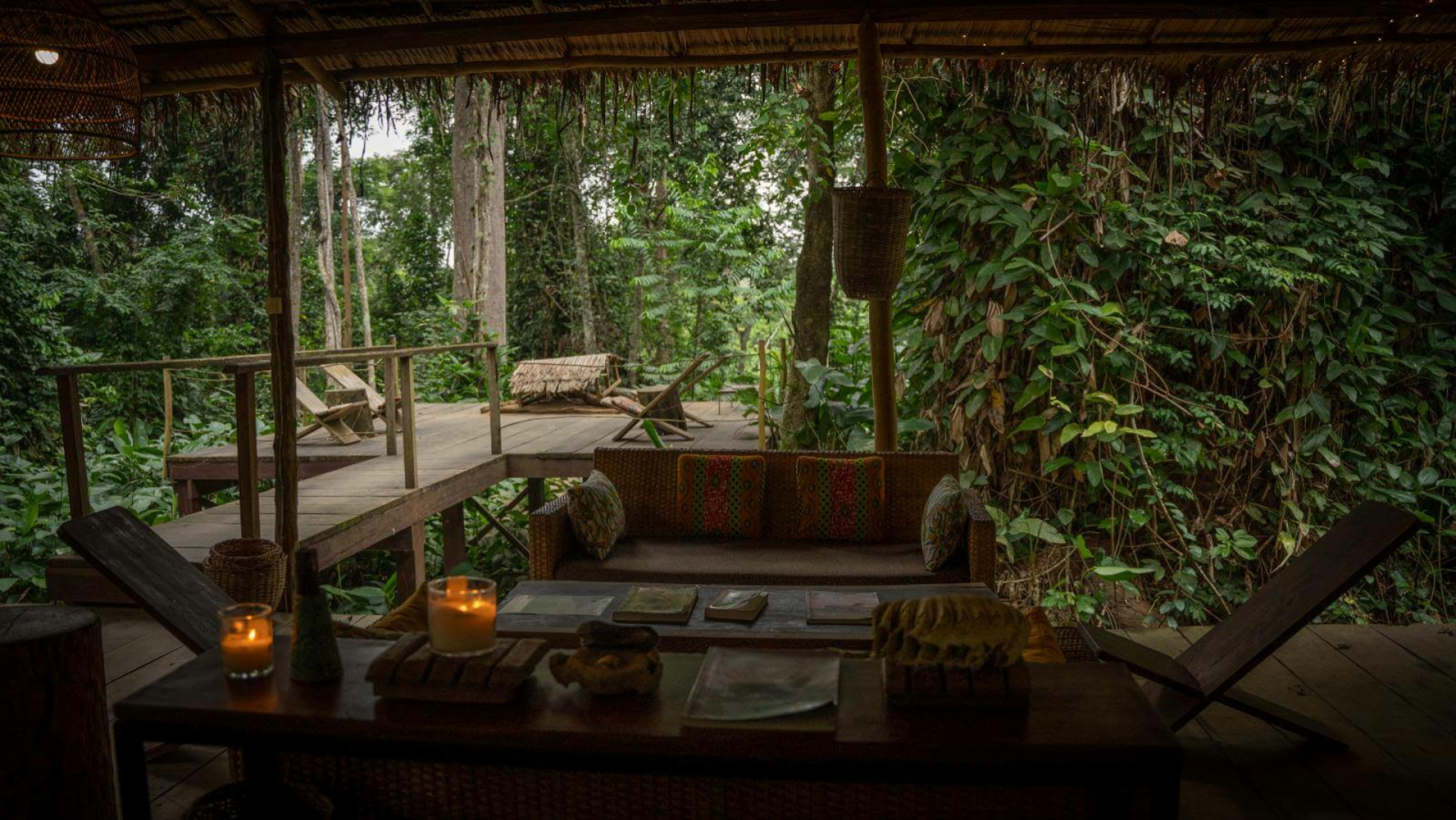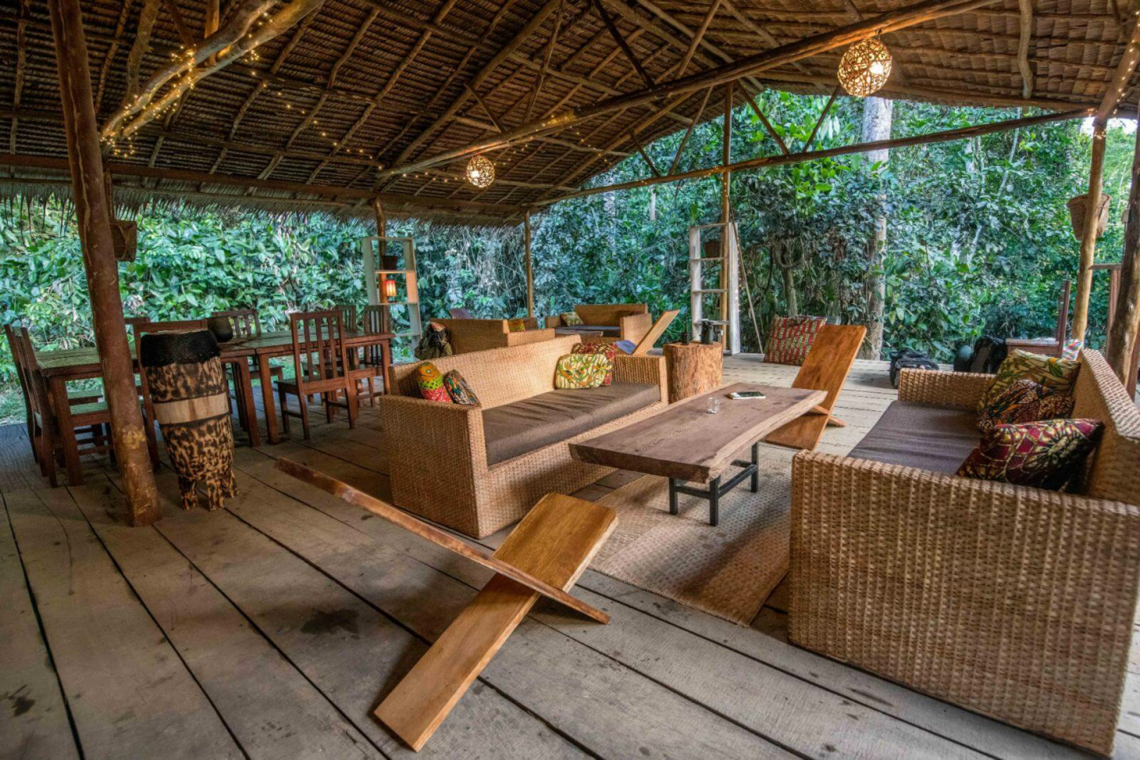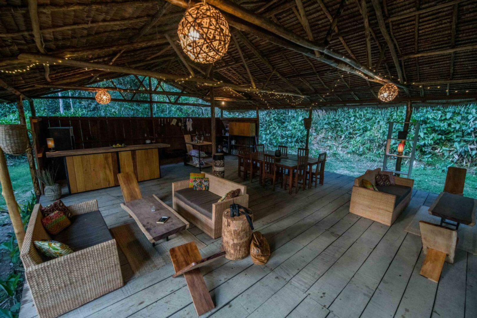 Der zentrale Bereich, ebenfalls auf einer erhöhten Holzplattform, umfasst einen offenen Speisesaal, eine einfache Lounge mit Sofas, einen kleinen Laden und eine Feuerstelle.