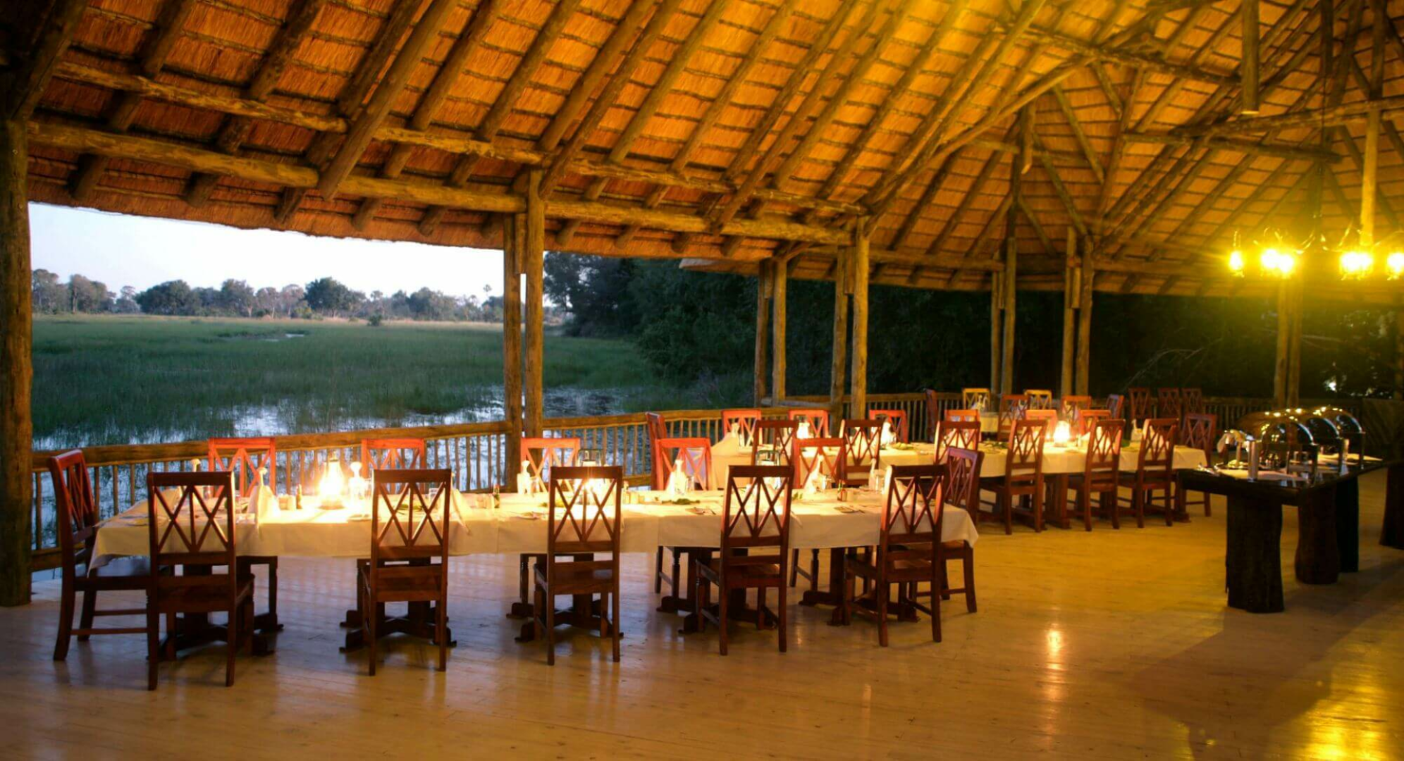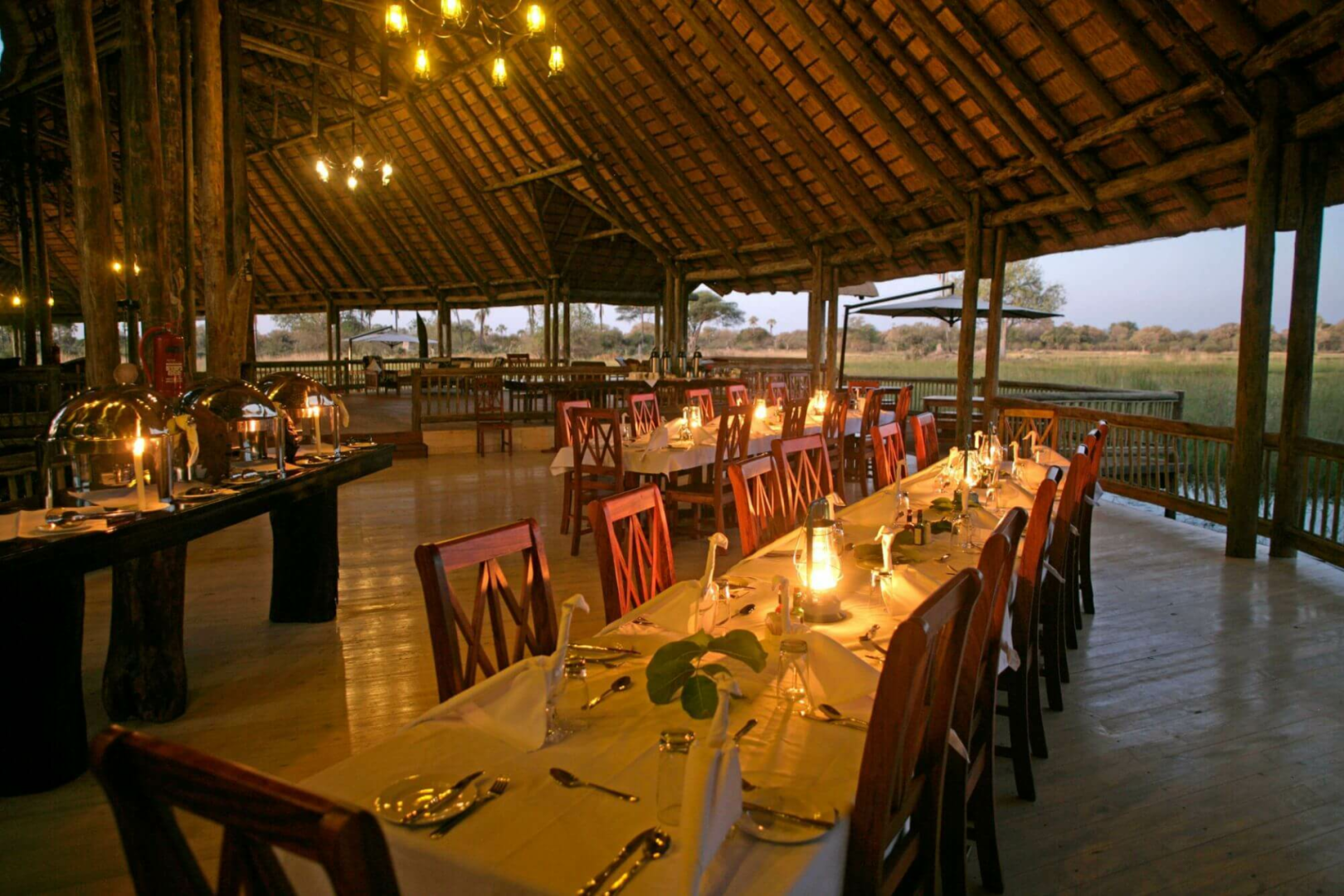 Herzstück des Camps ist eine große, auf dem Wasser stehende Boma unter Reetdach, in der die gemeinsamen Bereiche untergebracht sind. Die Boma öffnet sich an der vorderen Seite hin zur Lagune und bietet einen einmalig schönen Blick. Man findet hier eine umlaufende Veranda mit reichlichen Sitzmöglichkeiten, einer Feuerstelle, sowie einen Lounge- und einen Essbereich.