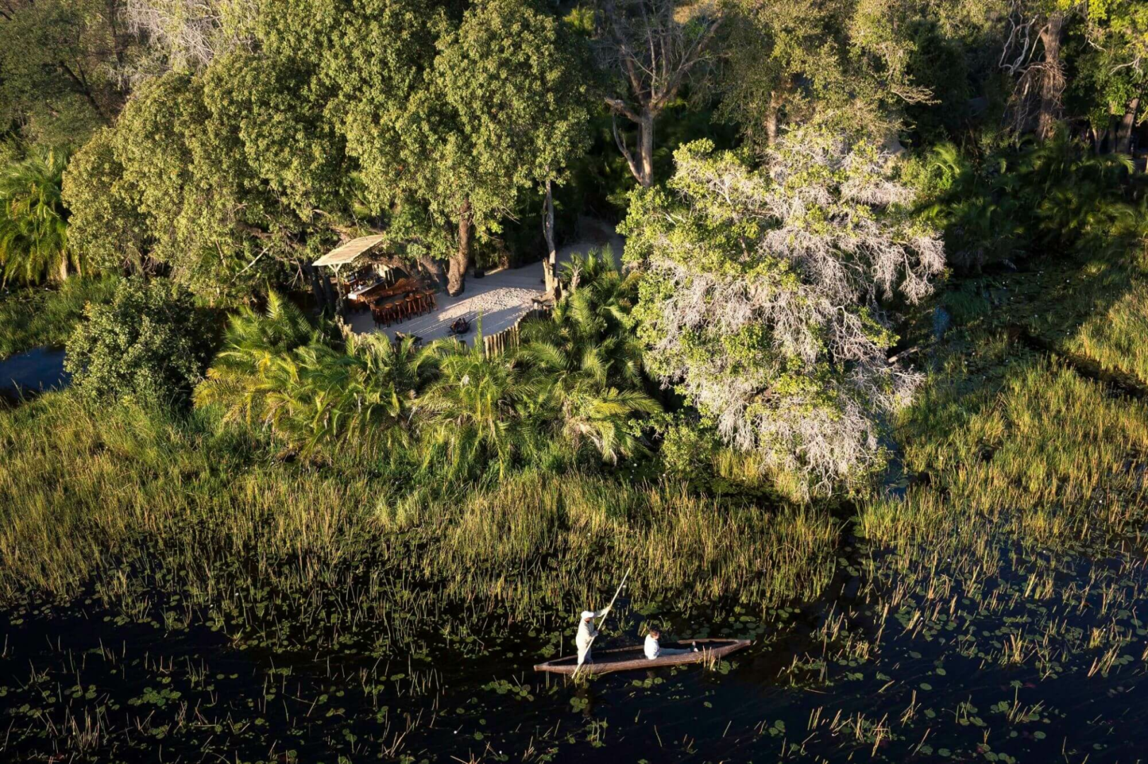 ungestörte Aussicht auf die umliegenden Wasserwege des Okavango Deltas.
