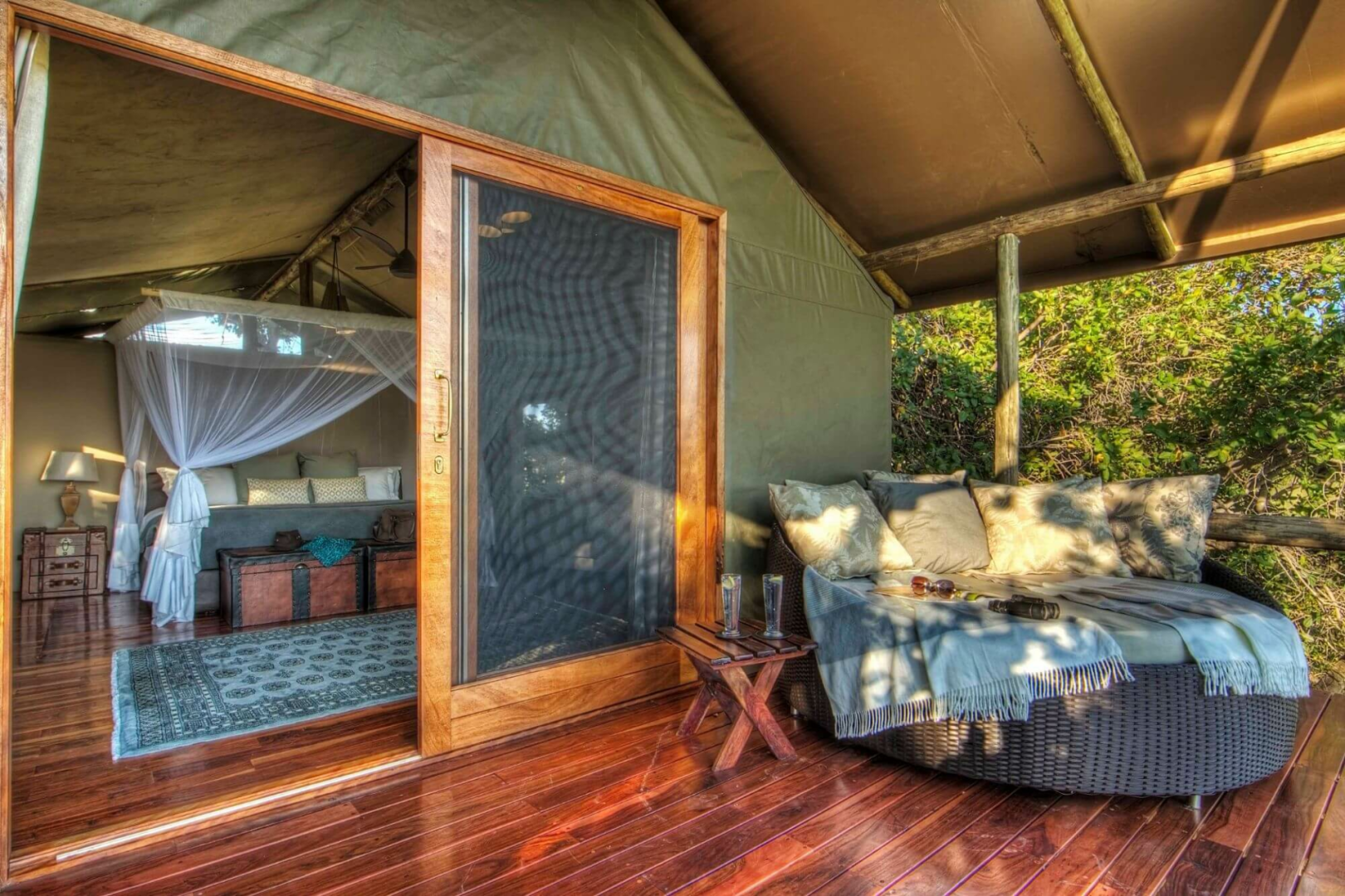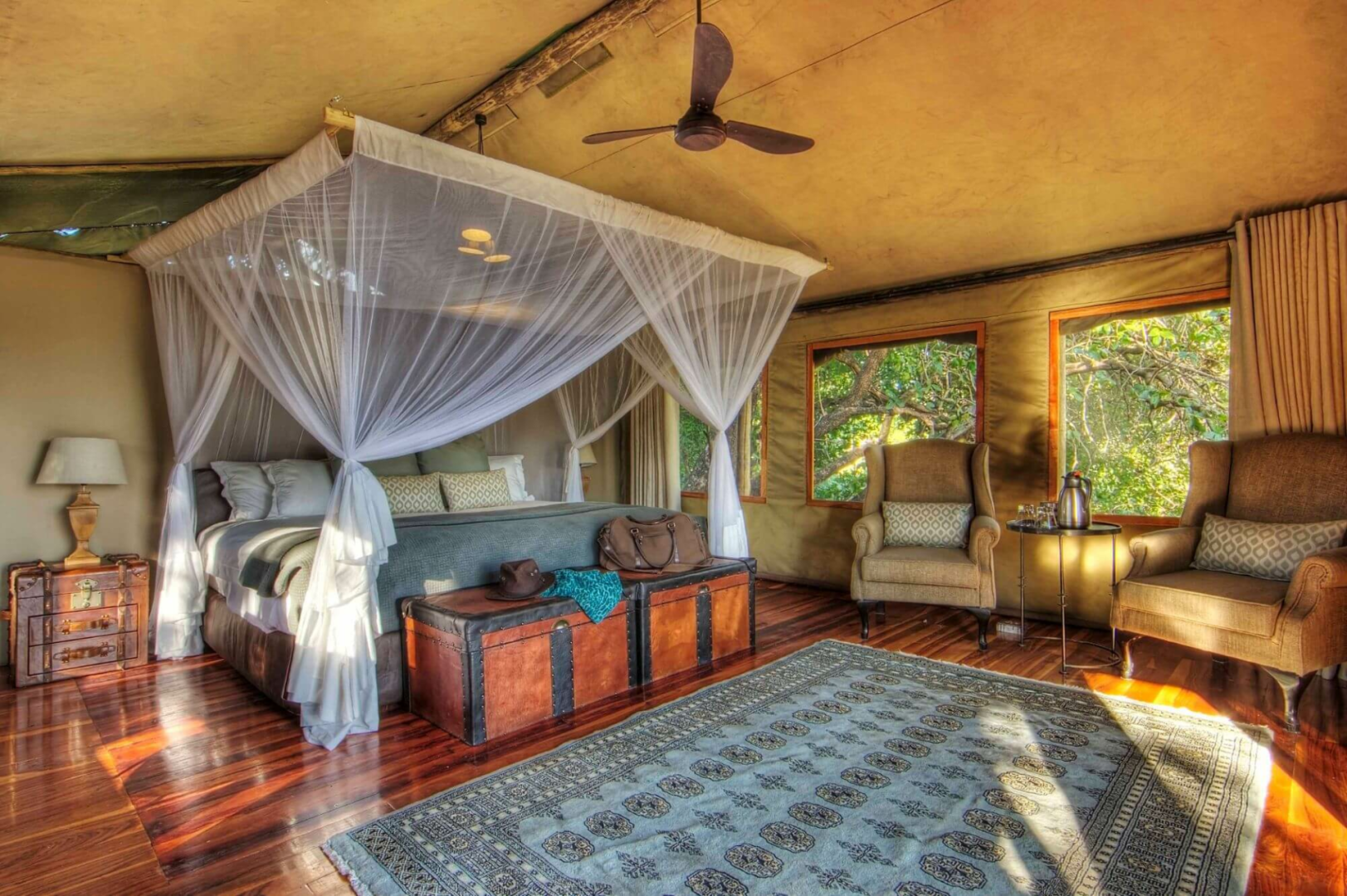 Die Luxuszelte in Shinde ist alle auf Holzdecks errichtet und haben alle eine tolle Aussicht. Die Zelte sind geräumig und super komfortabel mit Veranda, einem wunderschön dekoriertem Schlafzimmer, mit schönen Teppichen ausgelegtem Fußboden aus dunklem Teakholz, Sesseln und Lesestoff ausgestattet. Sie sind absolut komfortabel ohne penible luxuriös zu sein.