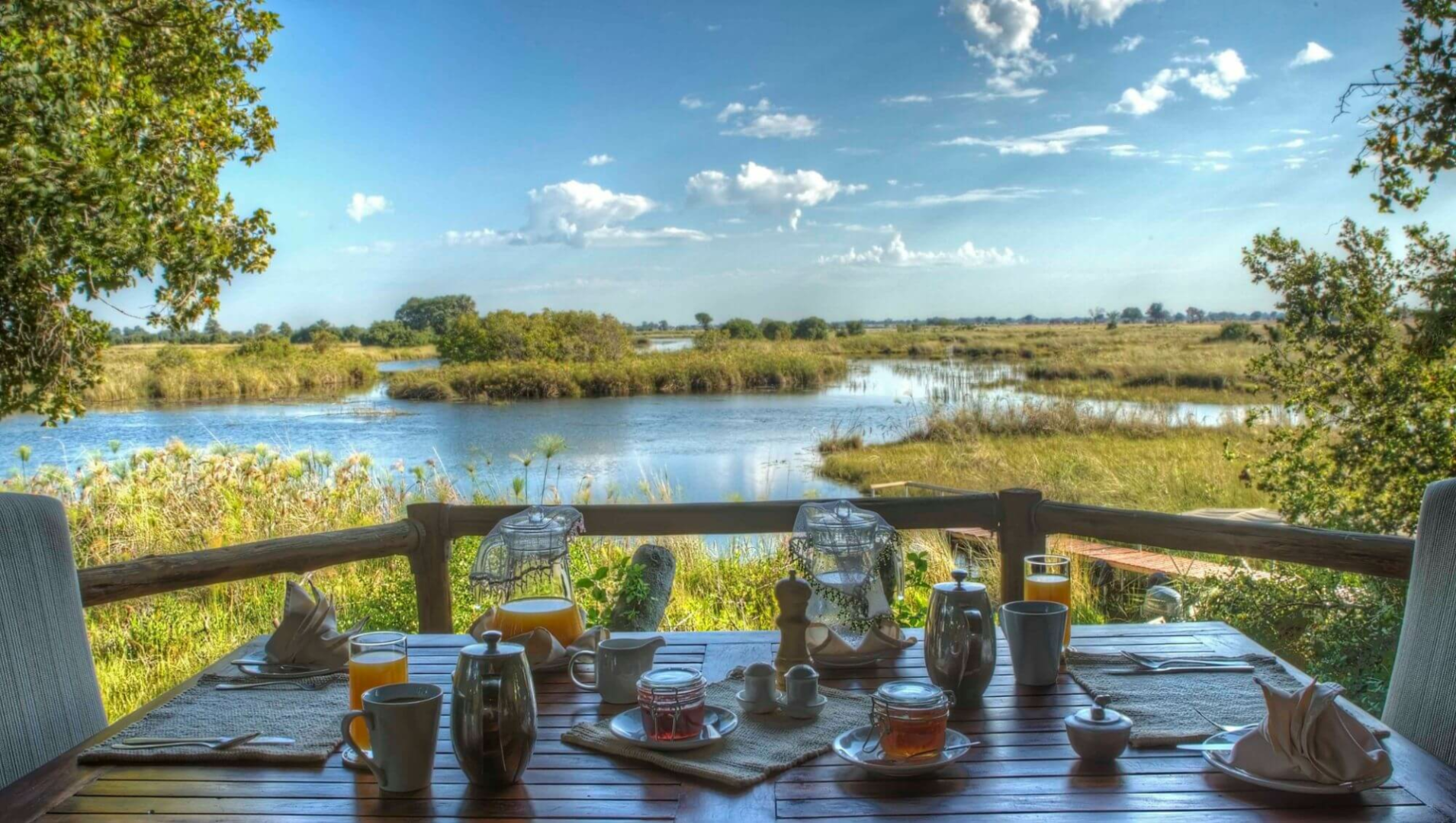 Eine Ebene höher befindet sich der Essraum mit einem nicht weniger als spektakulären Blick über die permanenten Gewässer des Deltas. Weitere Terrassen und Decks ausgelegt mit Liegestühlen ergänzen das Angebot.