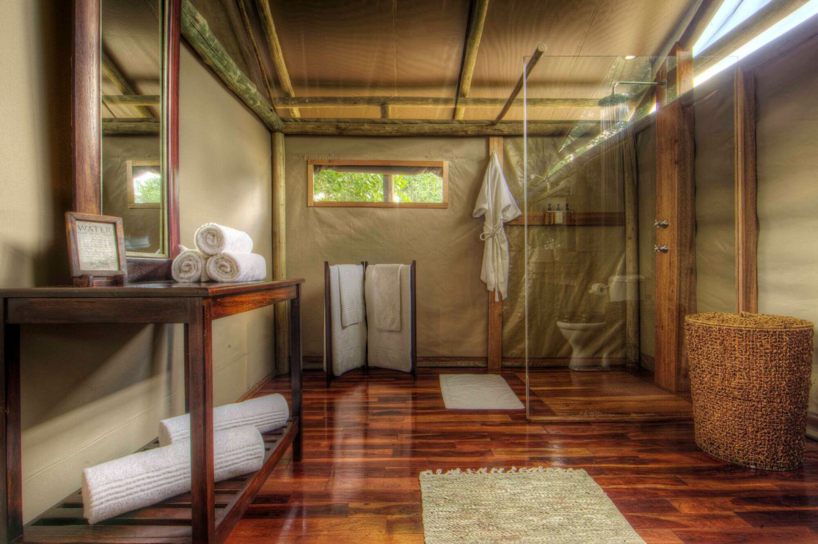 Jedes Zelt hat ein eigenes Badezimmer mit Porzellanwaschbecken und Dusche.