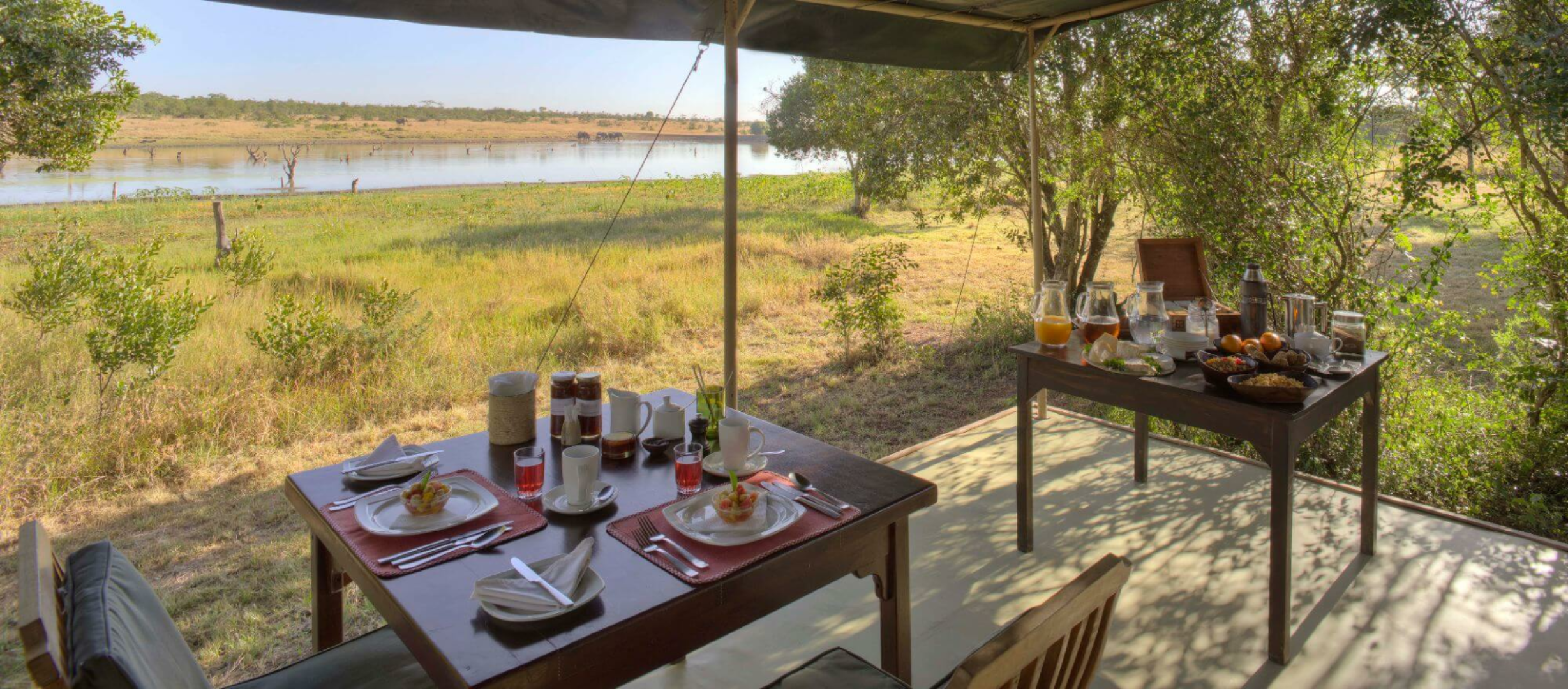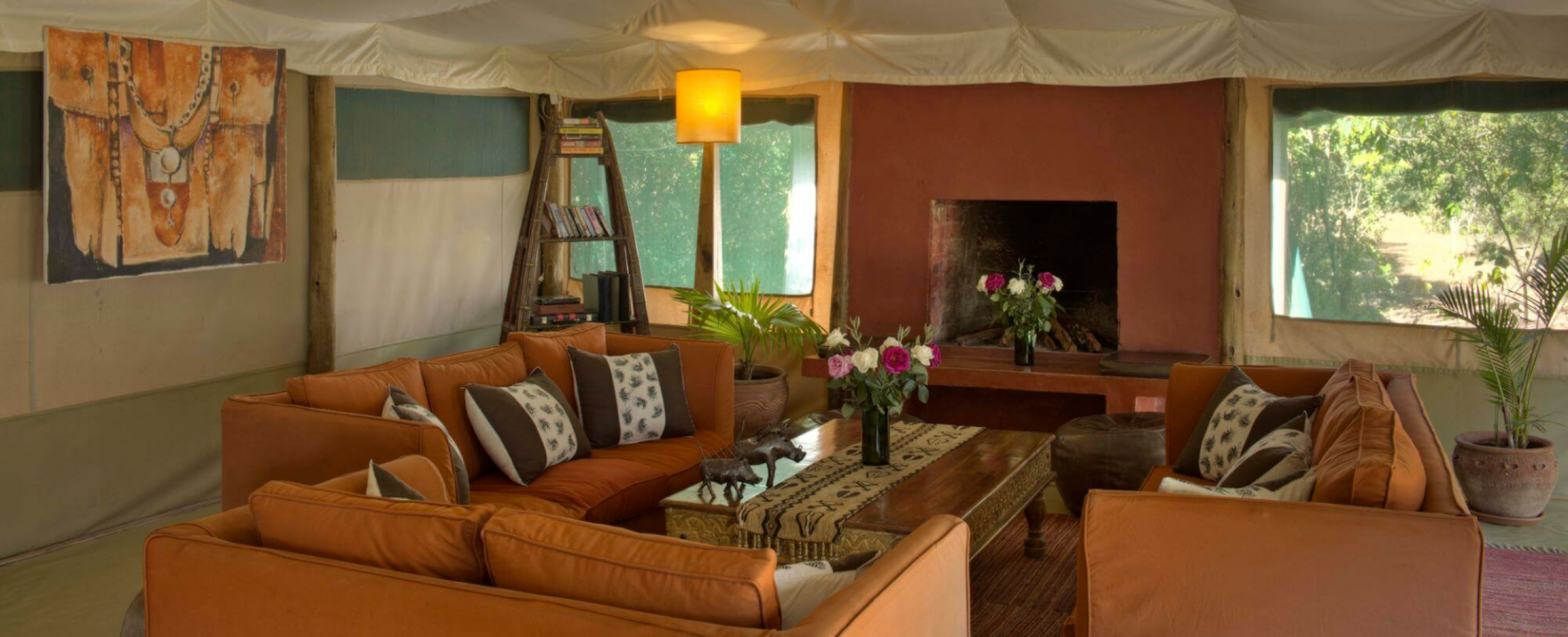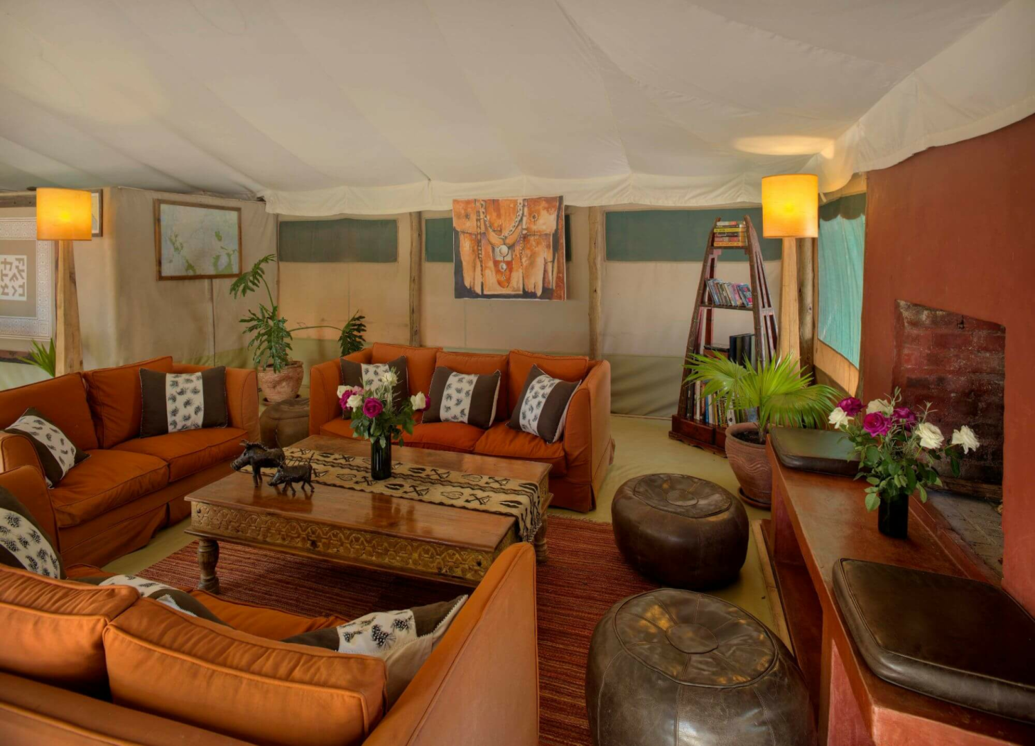 Sonst ist Kicheche Laikipia ein angenehmes Tented Camp mit Flusslage im klassischen Safaristil, bestehend aus einem großen zentralen Messzelt mit einem sehr schick gemachten Loungebereich, komfortabel mit bunten Sesseln, Sofas, niedrigen mit Gravuren verzierten Holztischen, Lederhockern und afrikanischem Kunstwerk eingerichtet. Es gibt auch einen separaten Essbereich mit einem mittig stehendem gemeinsamen Tisch für die Mahlzeiten. Direkt vor dem Messzelt führt eine große Wiese zum Ufer des Ewaso Ngiro-Flusses, eine Lieblingsstelle für Frühstück oder Mittagessen.