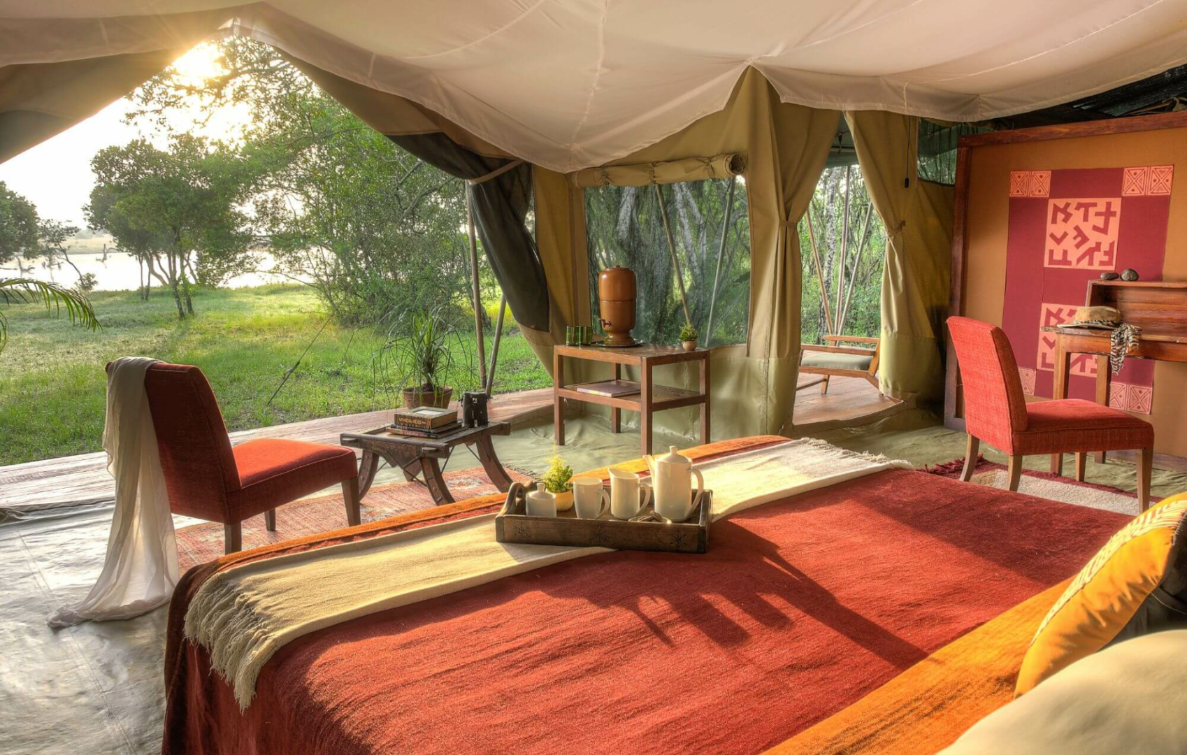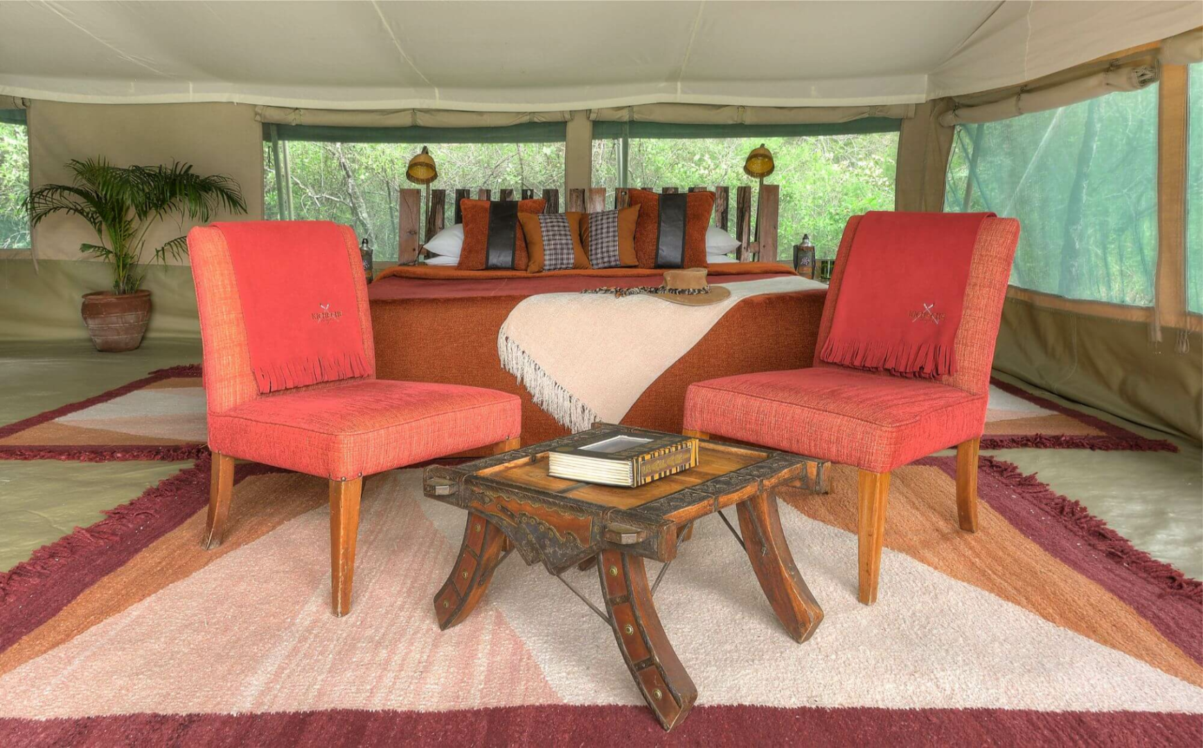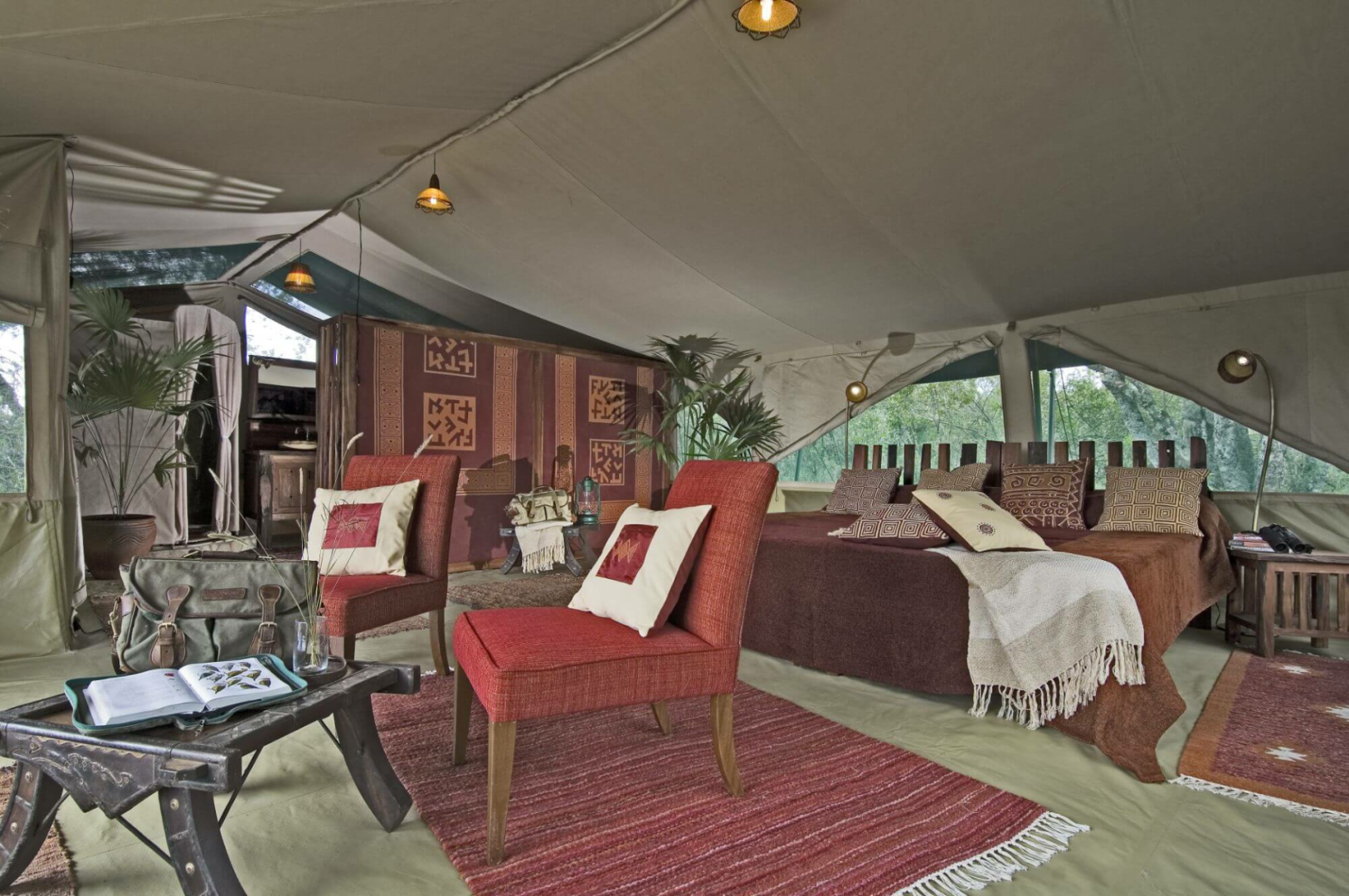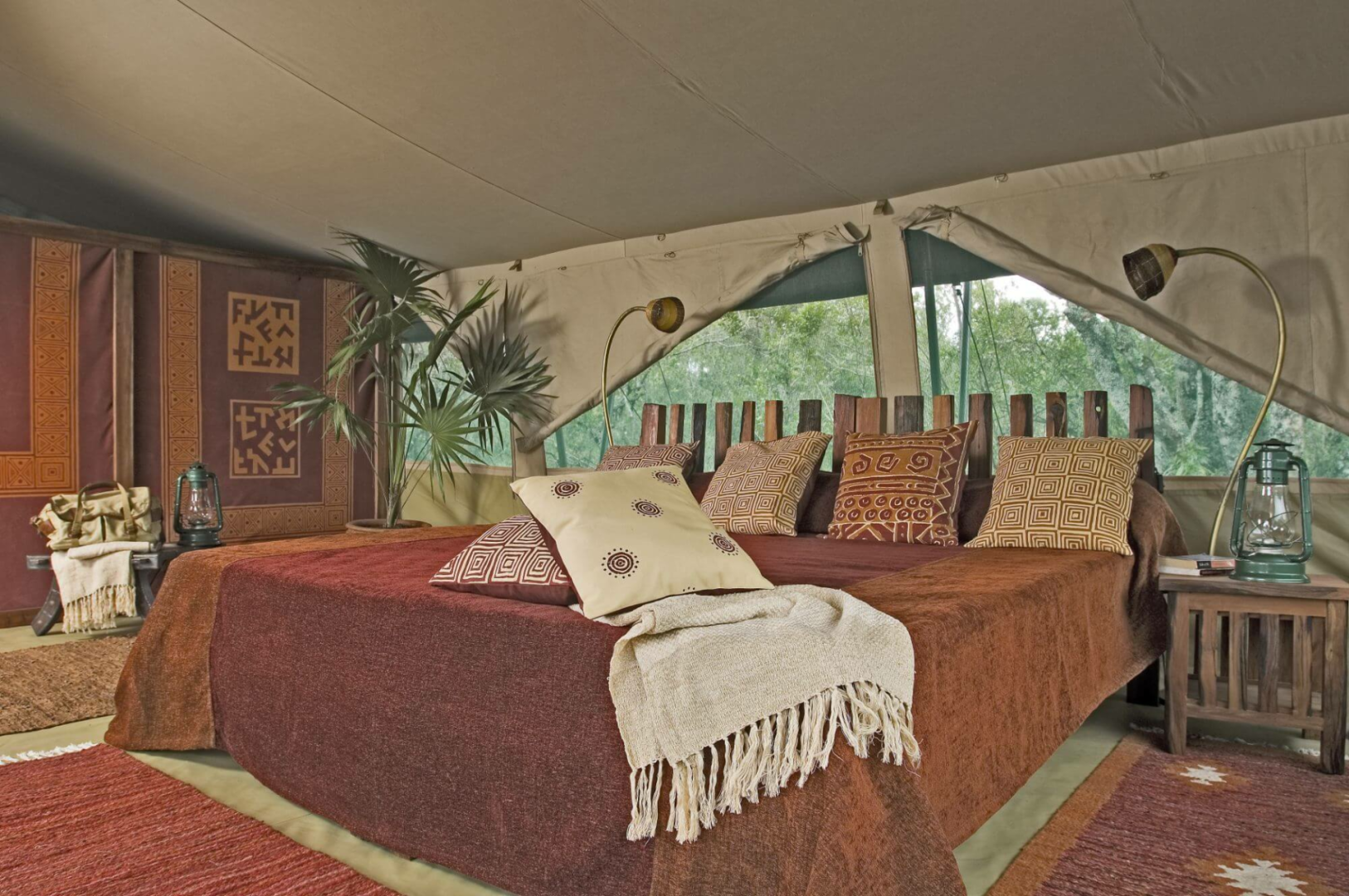 Die Gäste werden in sechs sehr luxuriösen Zeltsuiten untergebracht, die man über gewundene Pfade, die sich durch den Busch schlängeln, erreicht. Die Zelte sind sehr groß und im Inneren fröhlich bunt mit zahlreichen weichen Teppichen, die ausgelegt sind, um den Boden aus Leinen zu verschönern. Es gibt ein großes Queen-Size-Bett aus Massivholz, einen Schreibtisch mit zwei Sesseln und überraschend viele Pflanzentöpfe, die dem Raum eine sehr natürliche Atmosphäre verleihen. Gummistiefel, Regenschirme, Insektenspray, Pantoffeln und ein Bademantel sprechen für das hohe Komfortlevel hier.