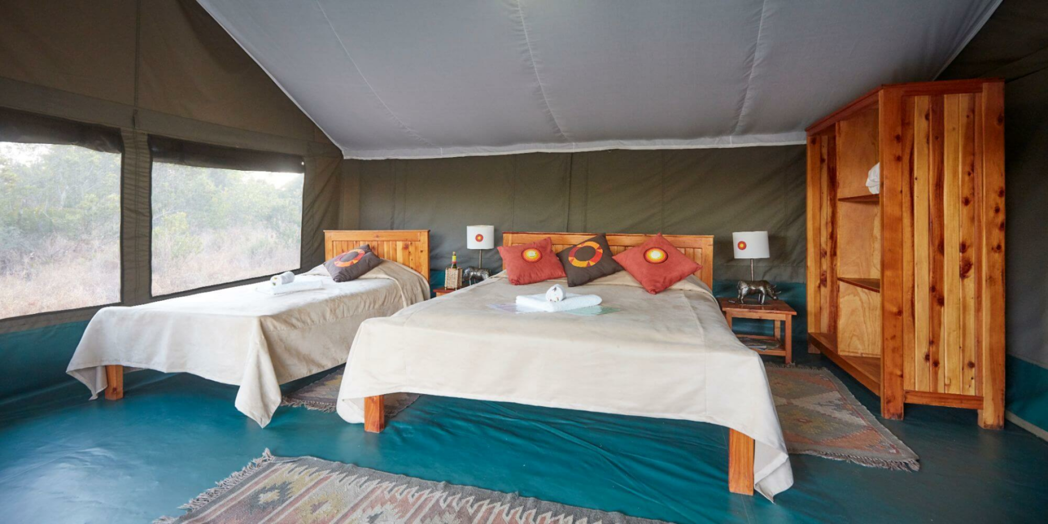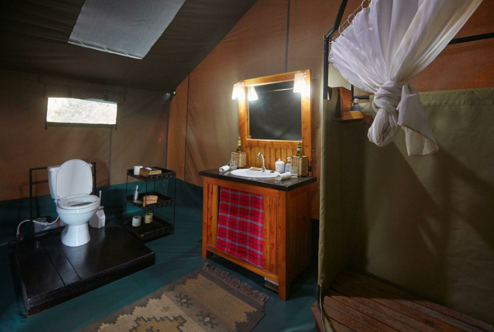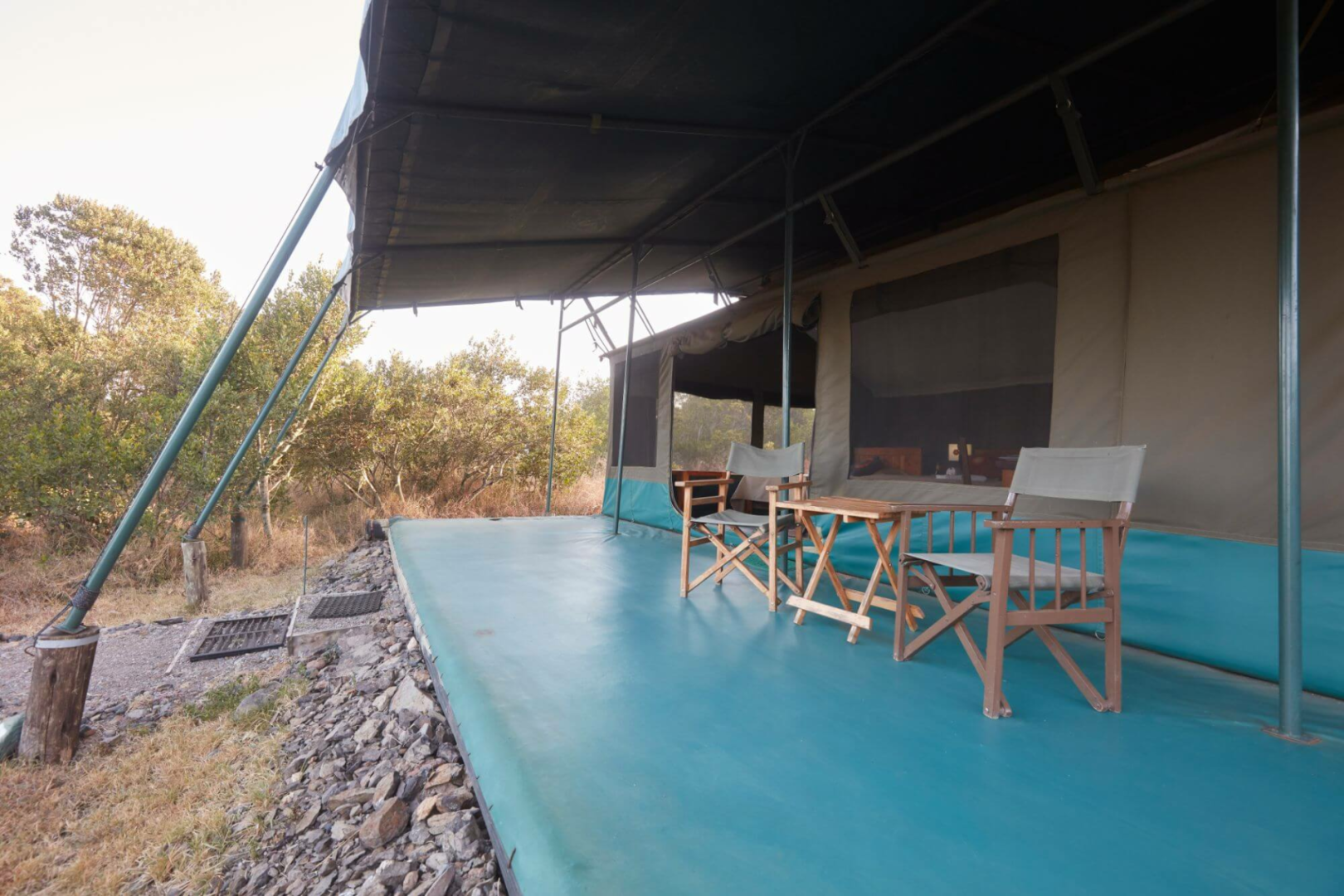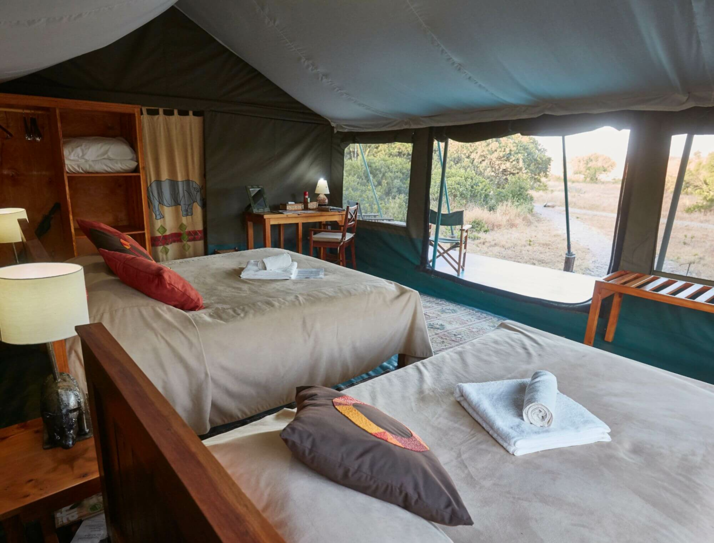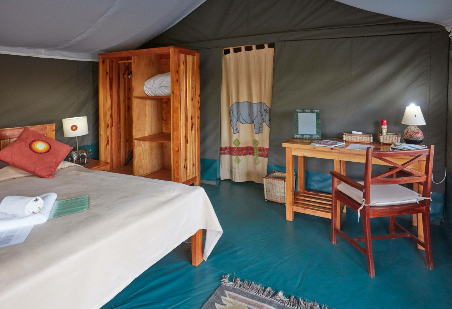 Das Porini Rhino Camp ist an sich relativ einfach, bestehend aus einem zentralen Messzelt mit etwas nüchtern eingerichteten Esszimmer mit Veranda und Unterbringung in sieben Safarizelten, die ansprechender gestaltet sind, als man es von Außen vermuten würde. Im Inneren sind Teppiche auf dem Boden verteilt. Die Möbeleinrichtung bestehend aus Bett, einem kleinen Schreibtisch und einem Gepäckständer ist einfach und funktional. Jedes Zelt hat sein eigenes Badezimmer mit Buschdusche und Toilette.