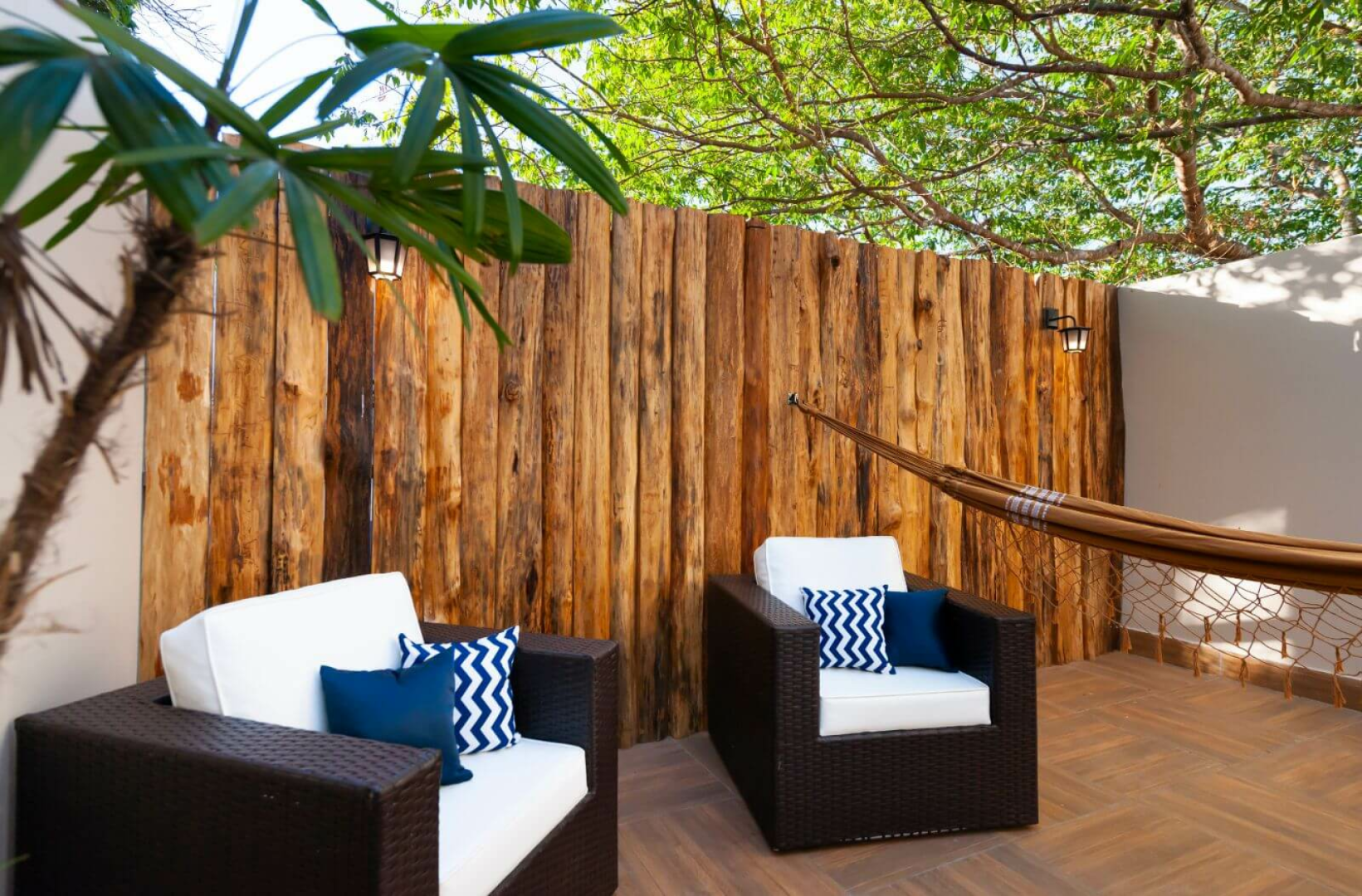 Die insgesamt 28 Zimmer liegen verteilt in den anderen zwei Gebäuden. Die Zimmer sind in zwei Kategorien unterteilt, Standard und Premium. Alle Zimmer sind mit Klimaanlage, Deckenventilator, WLAN, Minibar und Privatbad ausgestattet. Die Premium-Zimmer sind größer und haben zusätzlich einen privaten offenen Bereich zum Lesen oder Entspannen, mit Hängematten, Stühlen und einem Tisch.