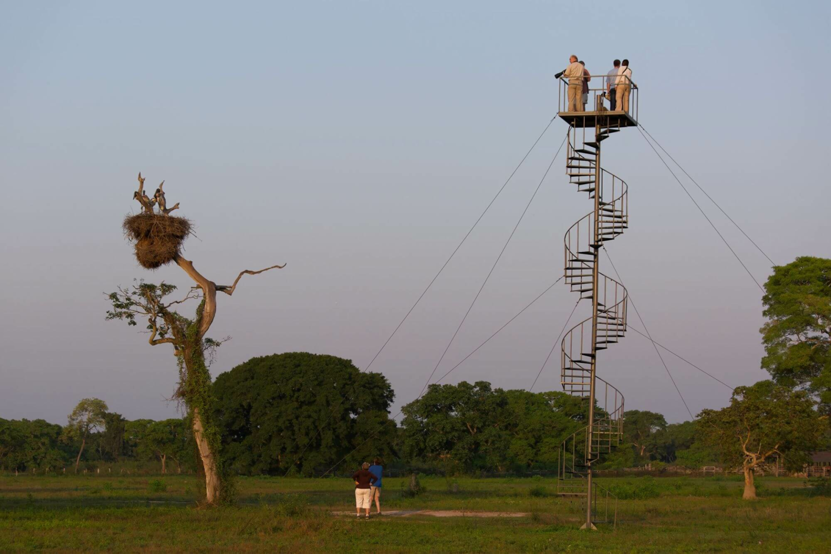 Das große Highlight der South Wild Pantanal Lodge ist die einzigartige Lage am Pixaim-Fluss. Hier kann man nicht nur eine herrliche Bootsfahrt genießen, sondern auch die reiche Flussfauna beobachten. Am Ufer befindet sich ein Turm, ausgezeichnet für Vogelbeobachtung. Ein weiterer Turm, etwa 10 Meter hoch, befindet sich direkt neben einem Jabiru-Nest und bietet sensationelle Möglichkeiten (vor allem in der Brutzeit), die großen Störche aus nächster Nähe zu fotografieren.