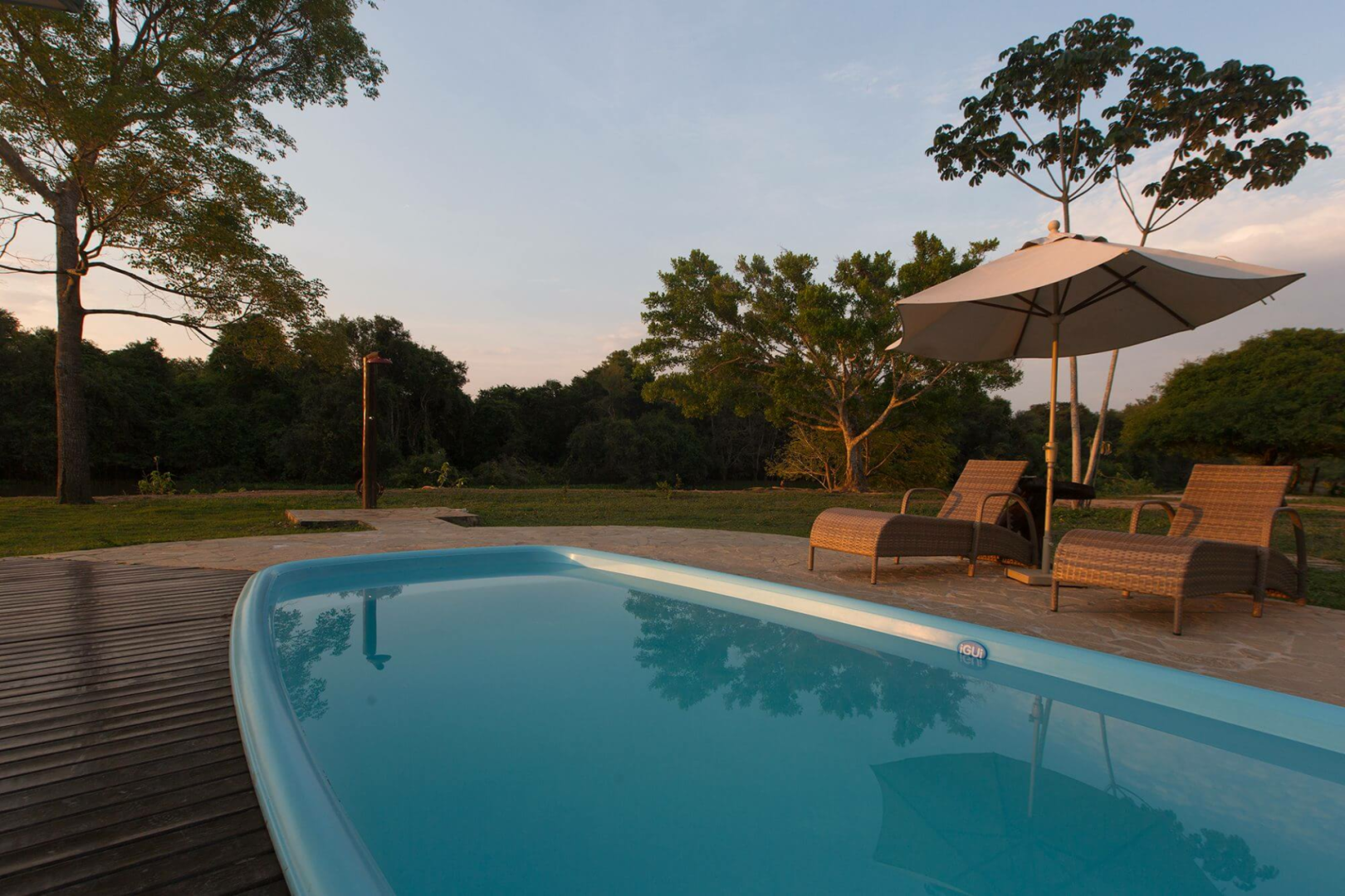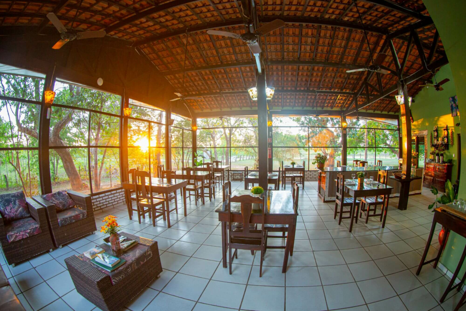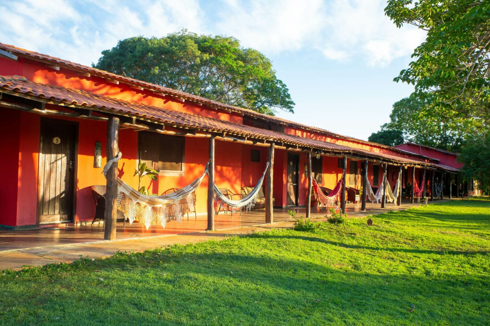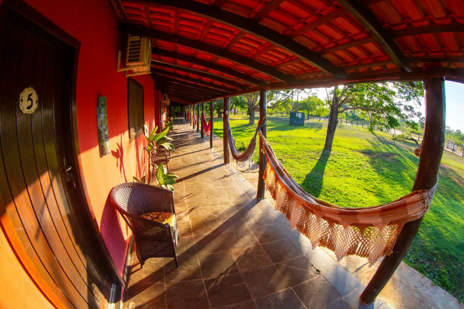 Die dreizehn im Pantanal-Farm-Stil gehaltenen Zimmer sind um das Hauptgebäude herum verteilt. Von der Veranda blickt man auf den Hof, mit Kolibri-Futterstellen und Saatgut-Futterautomaten, die früh am Morgen gefüllt werden. In den Zimmern gibt es ein großes Bett, das von einem Moskitonetz bedeckt ist, außerdem gibt es einen Tisch und einen bequemen Stuhl.