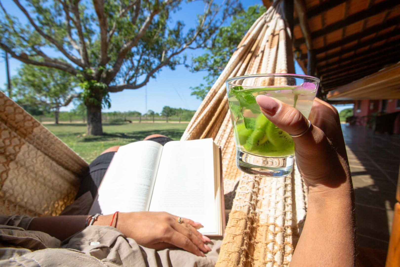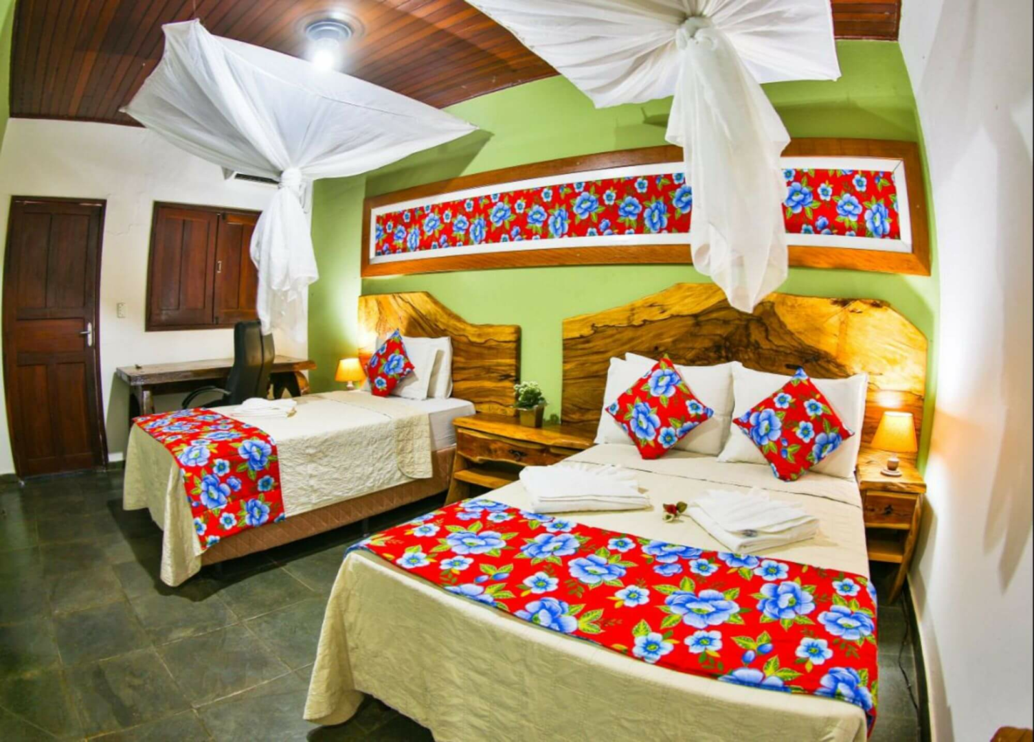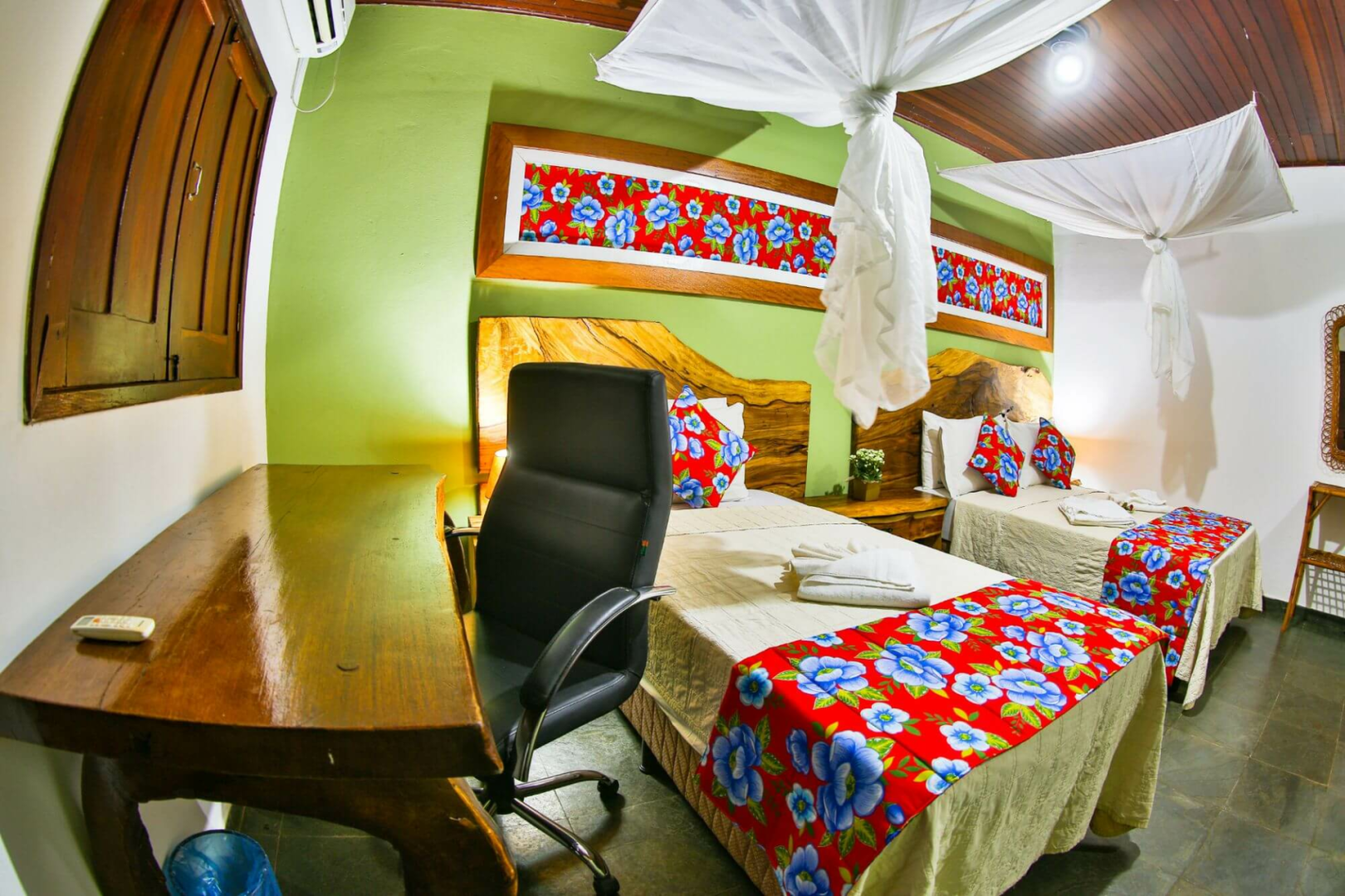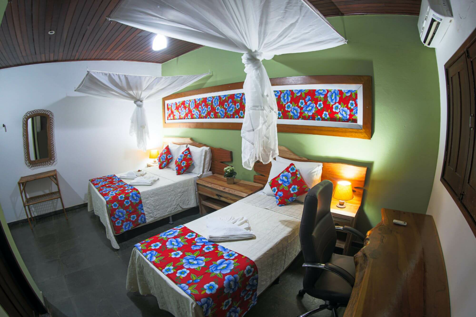 Die dreizehn im Pantanal-Farm-Stil gehaltenen Zimmer sind um das Hauptgebäude herum verteilt. Von der Veranda blickt man auf den Hof, mit Kolibri-Futterstellen und Saatgut-Futterautomaten, die früh am Morgen gefüllt werden. In den Zimmern gibt es ein großes Bett, das von einem Moskitonetz bedeckt ist, außerdem gibt es einen Tisch und einen bequemen Stuhl.