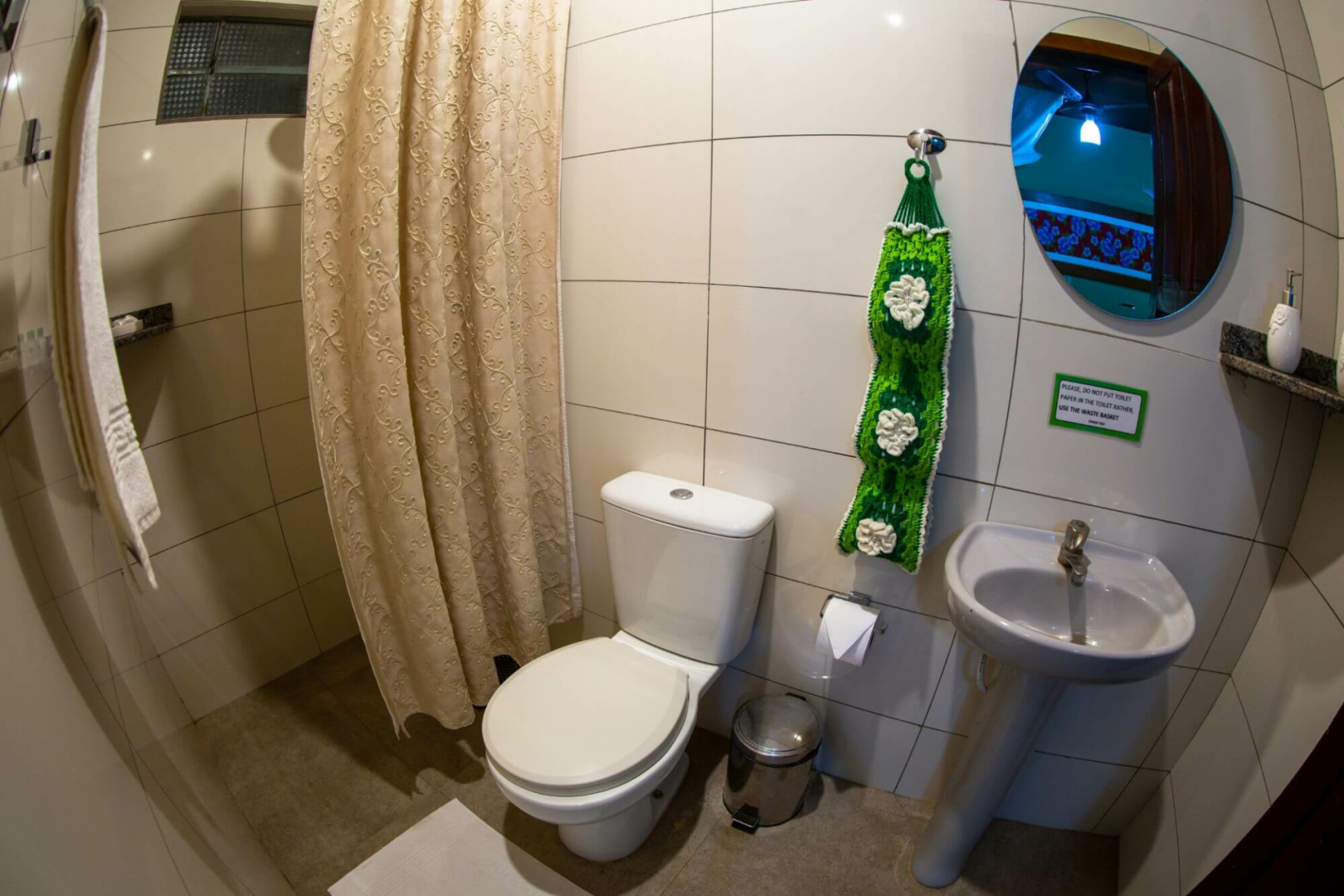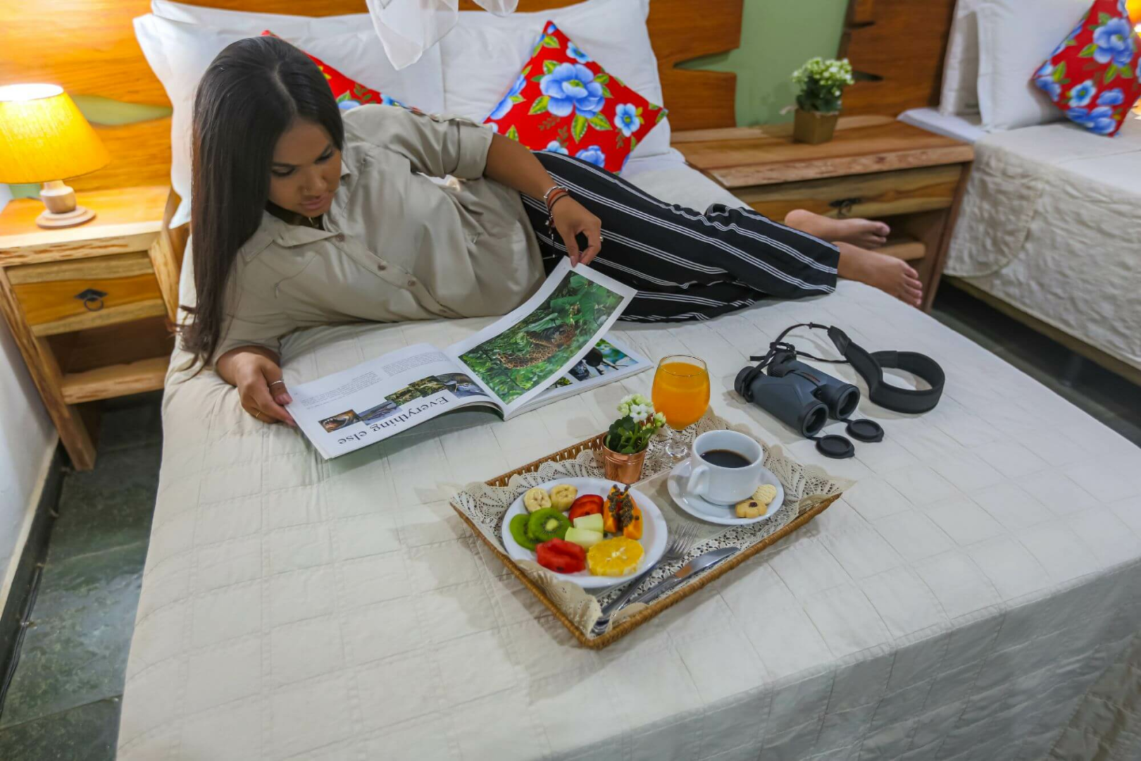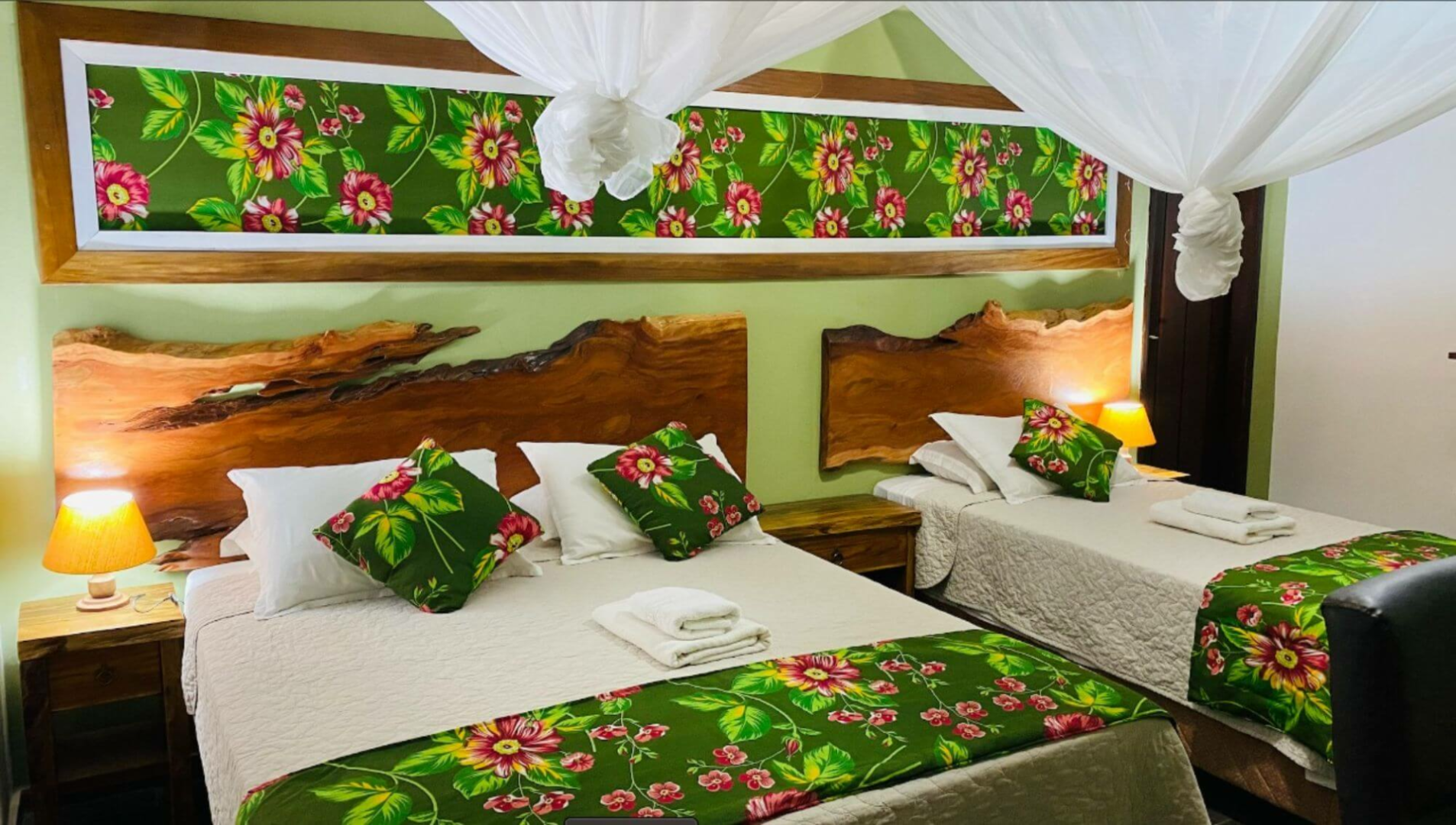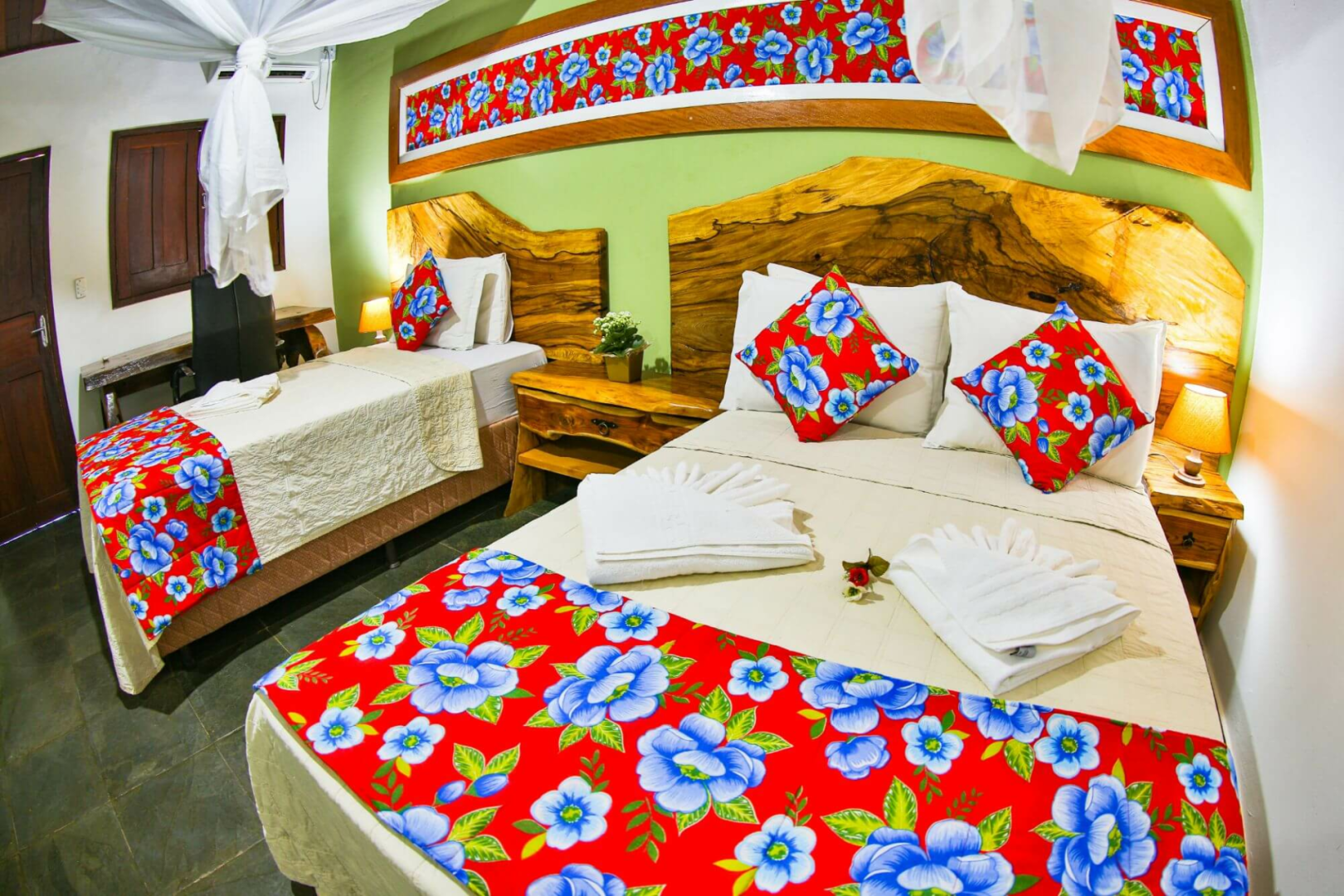 Die dreizehn im Pantanal-Farm-Stil gehaltenen Zimmer sind um das Hauptgebäude herum verteilt. Von der Veranda blickt man auf den Hof, mit Kolibri-Futterstellen und Saatgut-Futterautomaten, die früh am Morgen gefüllt werden. In den Zimmern gibt es ein großes Bett, das von einem Moskitonetz bedeckt ist, außerdem gibt es einen Tisch und einen bequemen Stuhl.
