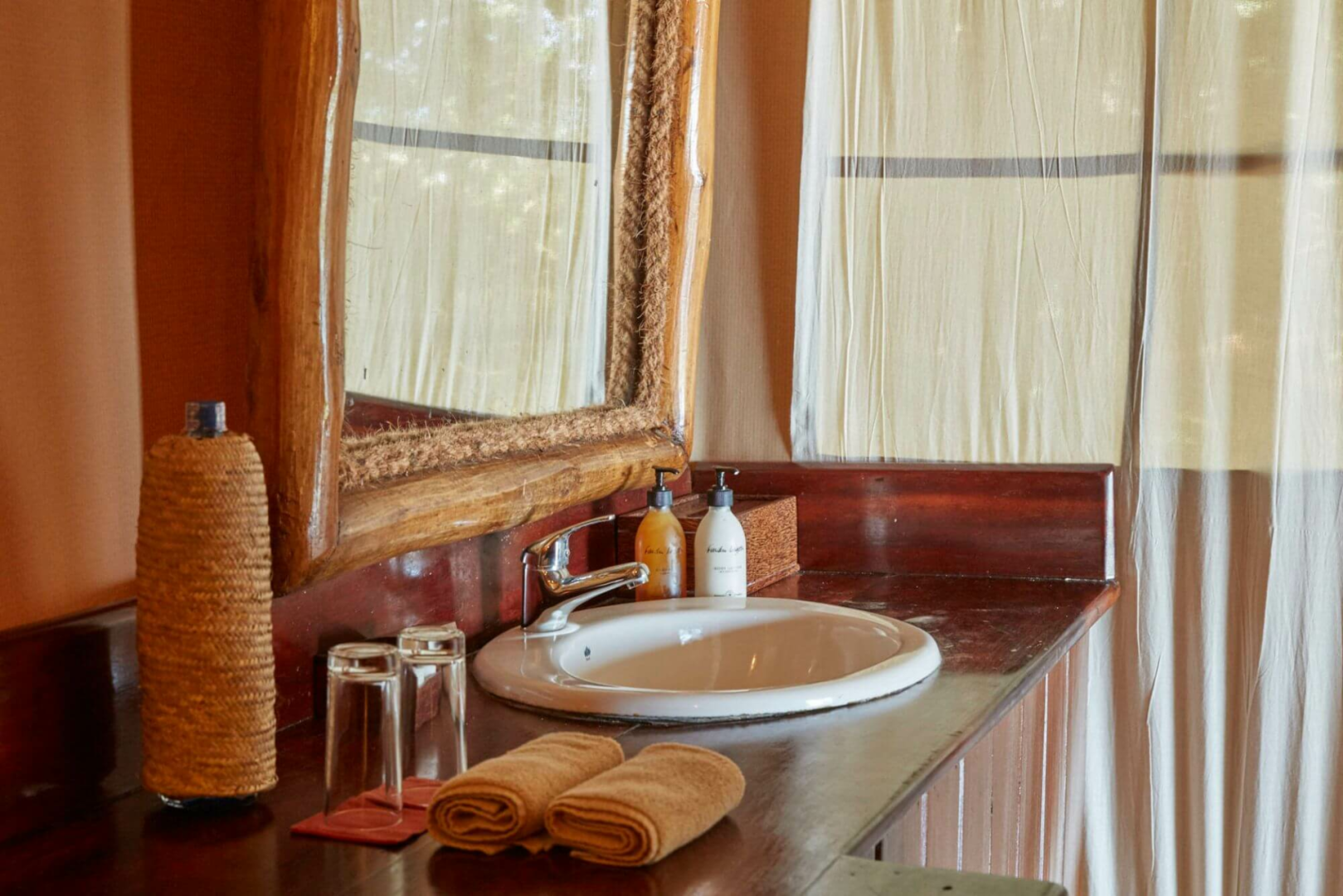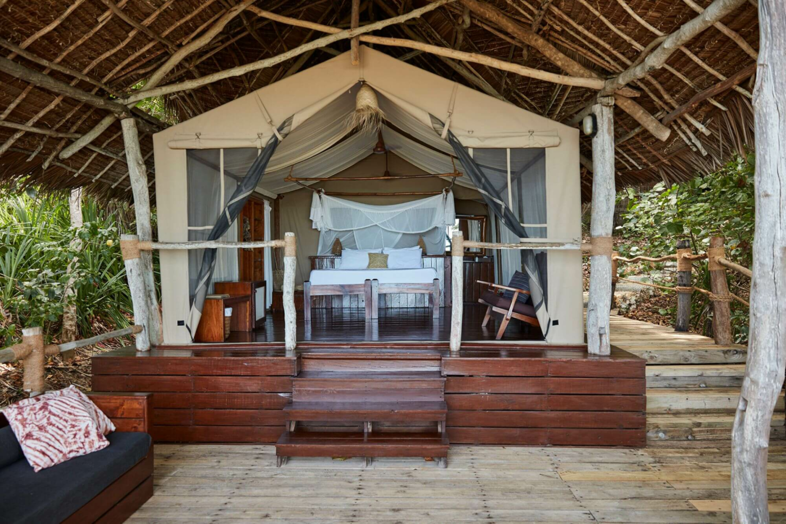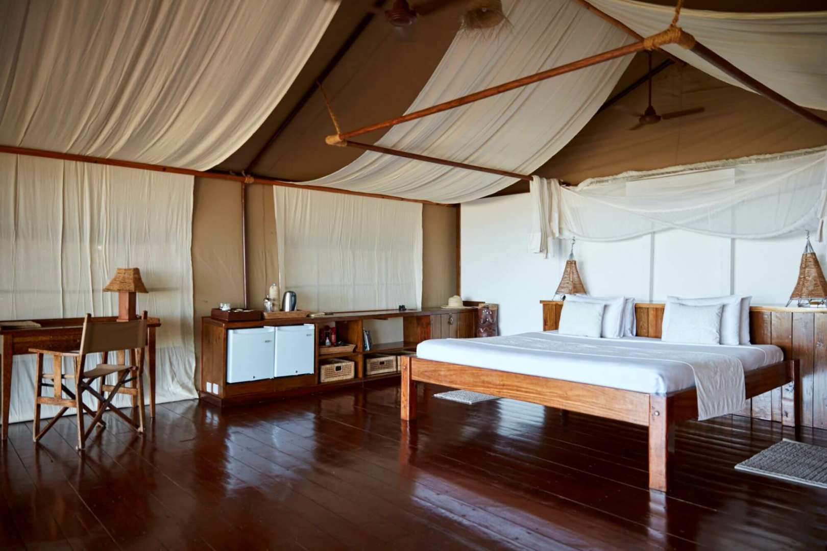 Gäste werden in acht Beachbungalows und in acht weniger preisintensiv aber genauso schönen Hillside Bungalows untergebracht. Alle Konstruktionen sind aus Leinen unter Reetdach über Plankenwege erreichbar. Die Bungalows sind super komfortabel, haben eine eigene private Veranda, einen kleinen Aufenthaltsbereich, Böden aus dunklem Holz, ein Queensize Bett und Bad. Für alle, die sich das Besondere leisten wollen, gibt es auch zwei Suites.