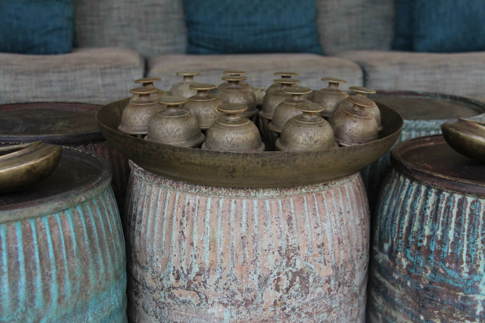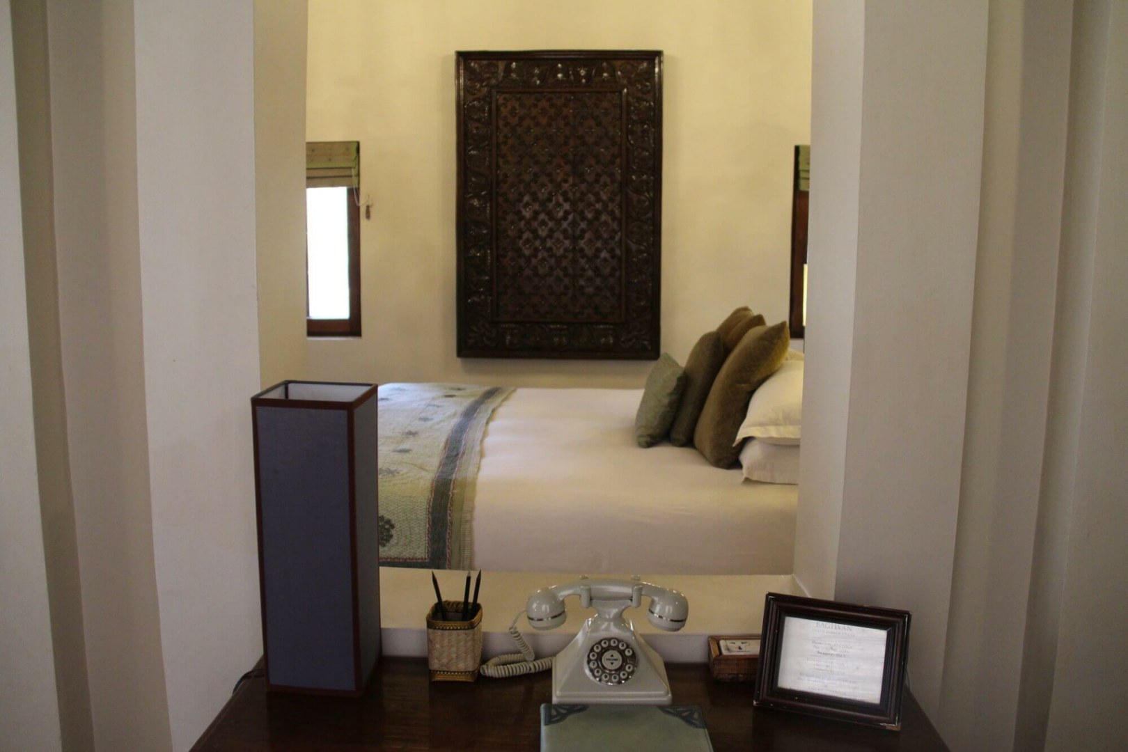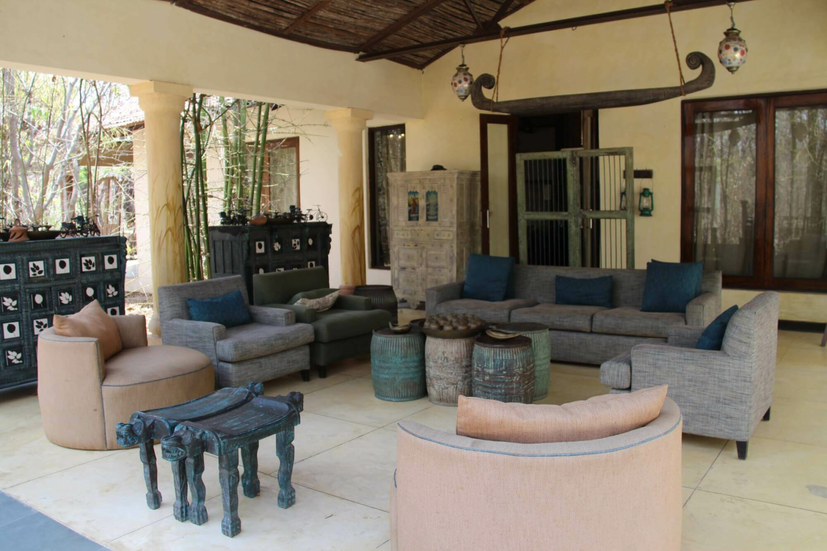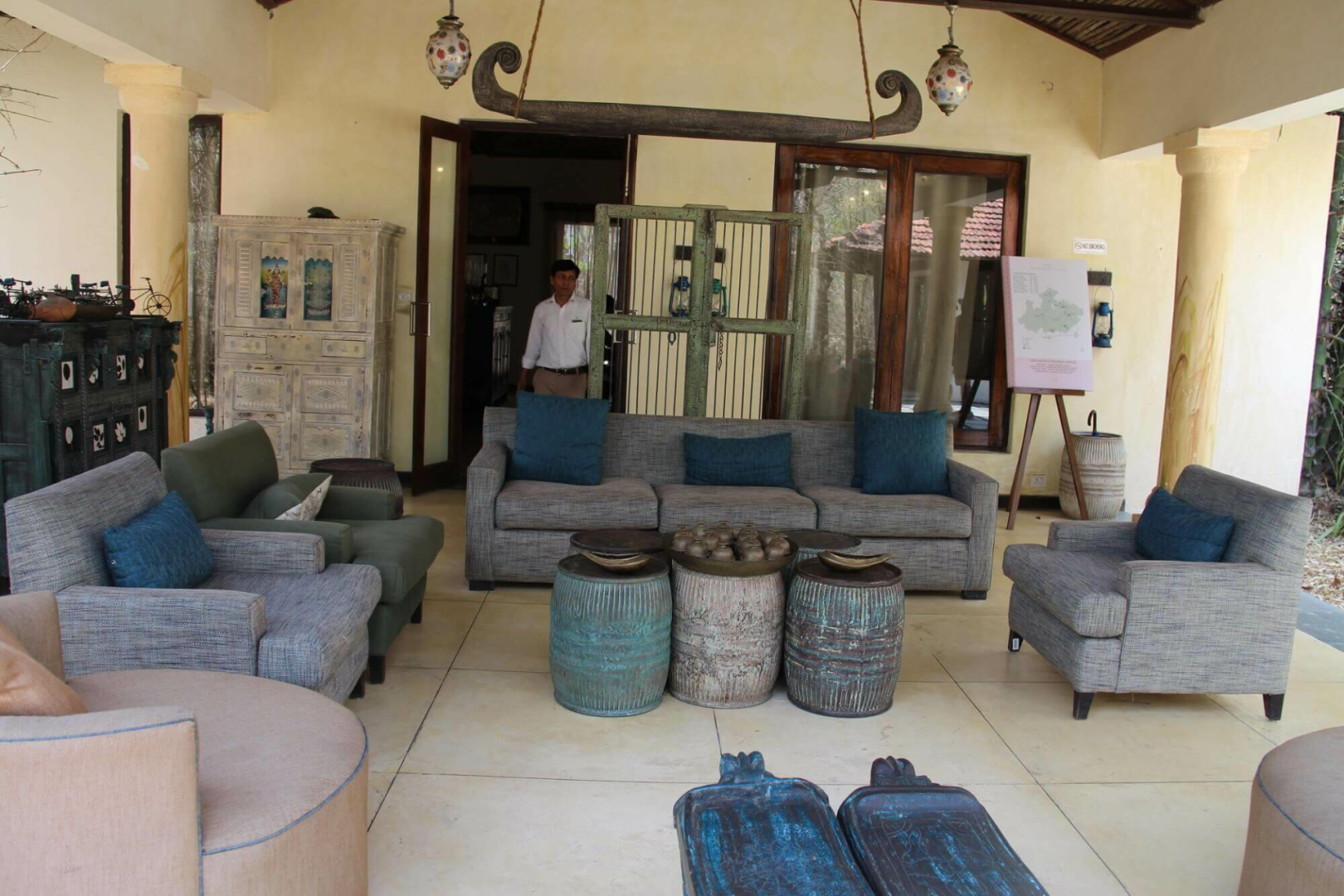 Baghvan im Pench Nationalpark gehört der Taj-Luxushotelkette. Am meisten hat uns die sehr intime Lage inmitten des naturbelassenen Waldes in der Pufferzone des Parks nah dem Turia Gate überzeugt. Die kleine Lodge besteht aus einem Haupthaus mit vorgelagertem offenem Loungebereich inklusive Souvenirshop. Links davon liegen ein kleiner Pool und ein offenes Deck für die Abendessen im Winter. Im Inneren des Hauptgebäudes ist der Restaurantbereich untergebracht. Alle gemeinsamen Bereiche sind mit wunderschönem alten Mobiliar und pastellfarbigen Dekoartikeln eingerichtet. Zweifellos hat der Innenarchitekt Baghvans eine hervorragende Arbeit geleistet.