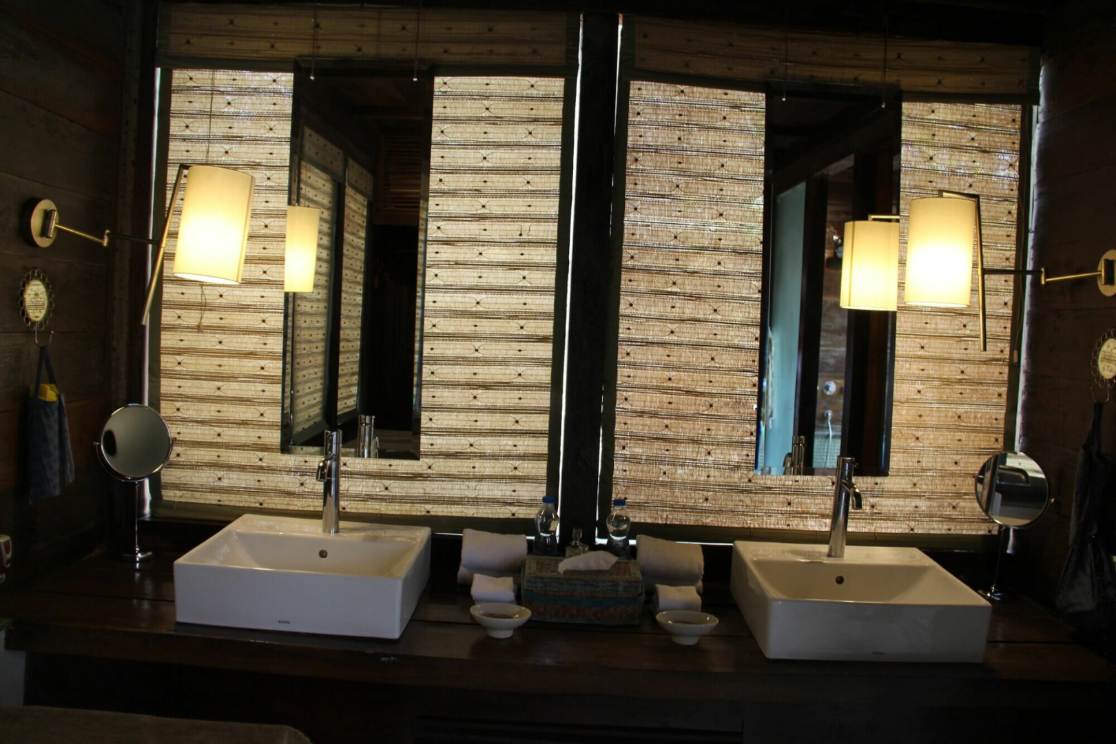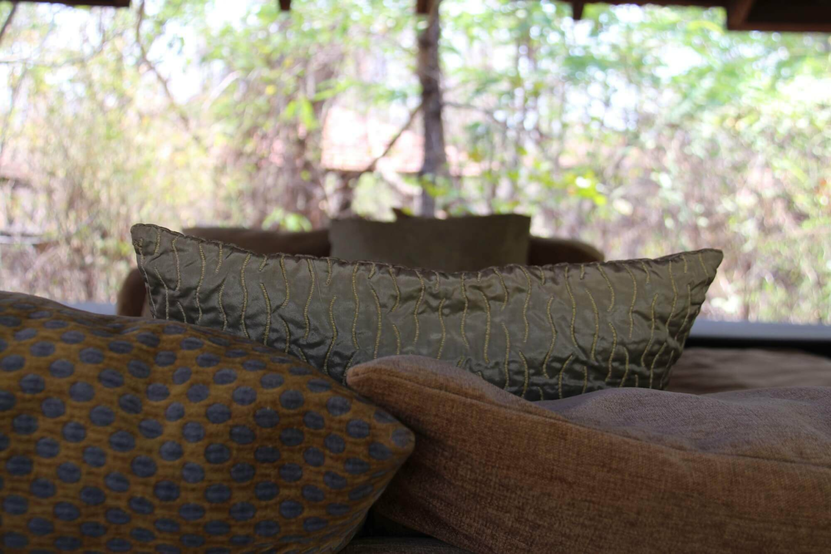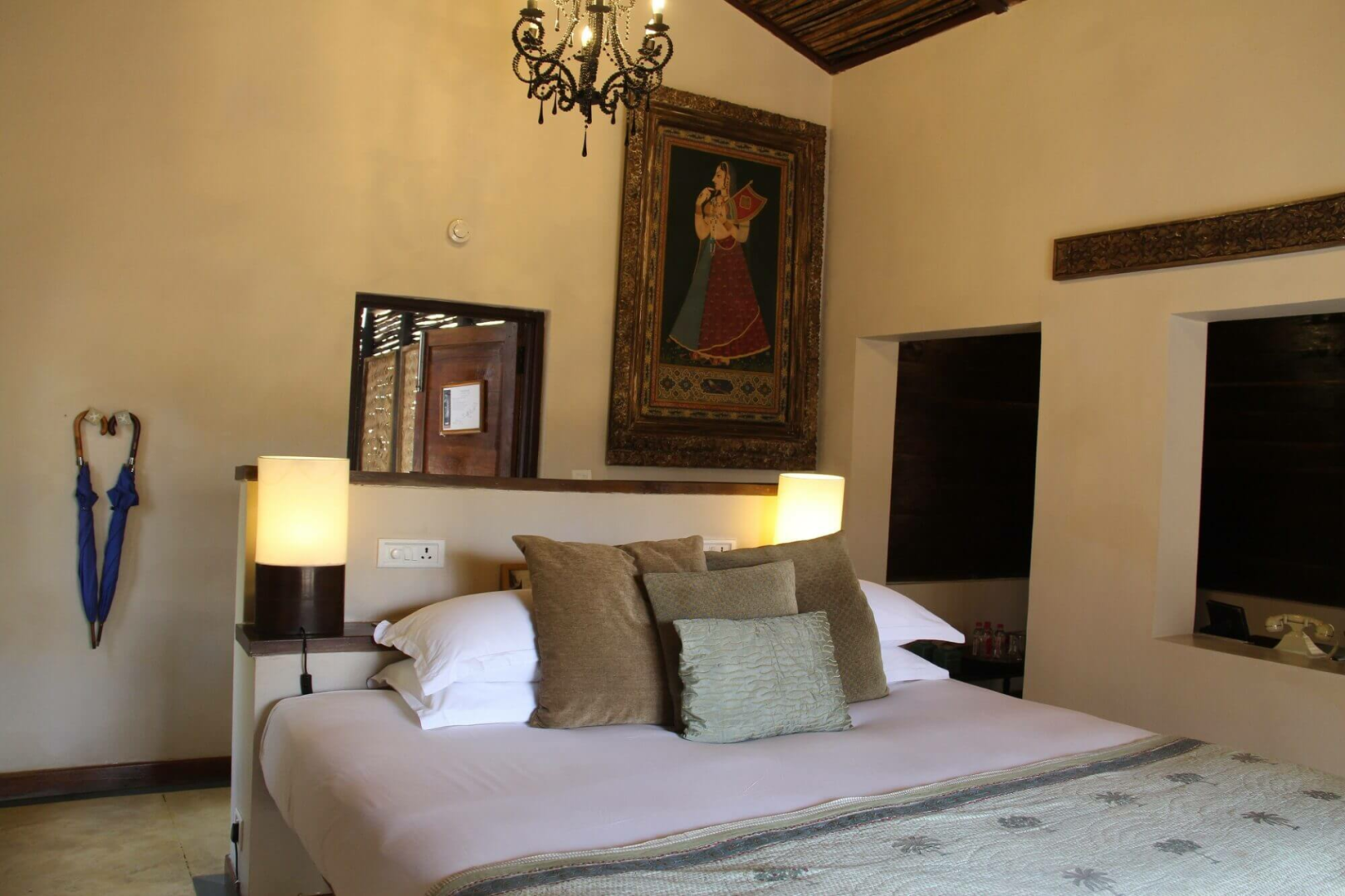 Hinter dem Restaurantbereich führt ein Pfad zu sechs der Luxuscottages. Die anderen sechs liegen unterhalb des Pools auf der vorderen Seite. Jedes Cottage ist mit sehr viel Geschmack eingerichtet. Das eher kleine Schlafzimmer mit geschlossener Terrasse liegt gleich links vom Flur. Neben dem sehr großen Badezimmer mit Outdoor-Dusche führt eine Treppe auf den Machaan, dem Beobachtungsdeck und Schmuckstück der Cottages. Wie in einer Lodge solcher Kategorie ist die komplette Einrichtung der Cottages von einem sehr dezenten Luxus gekennzeichnet.