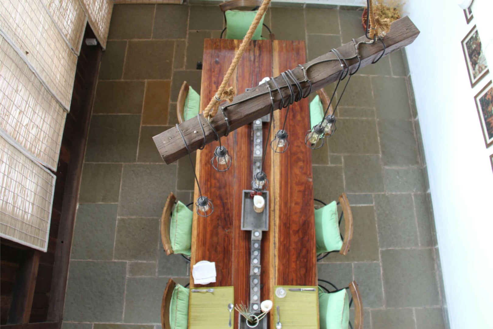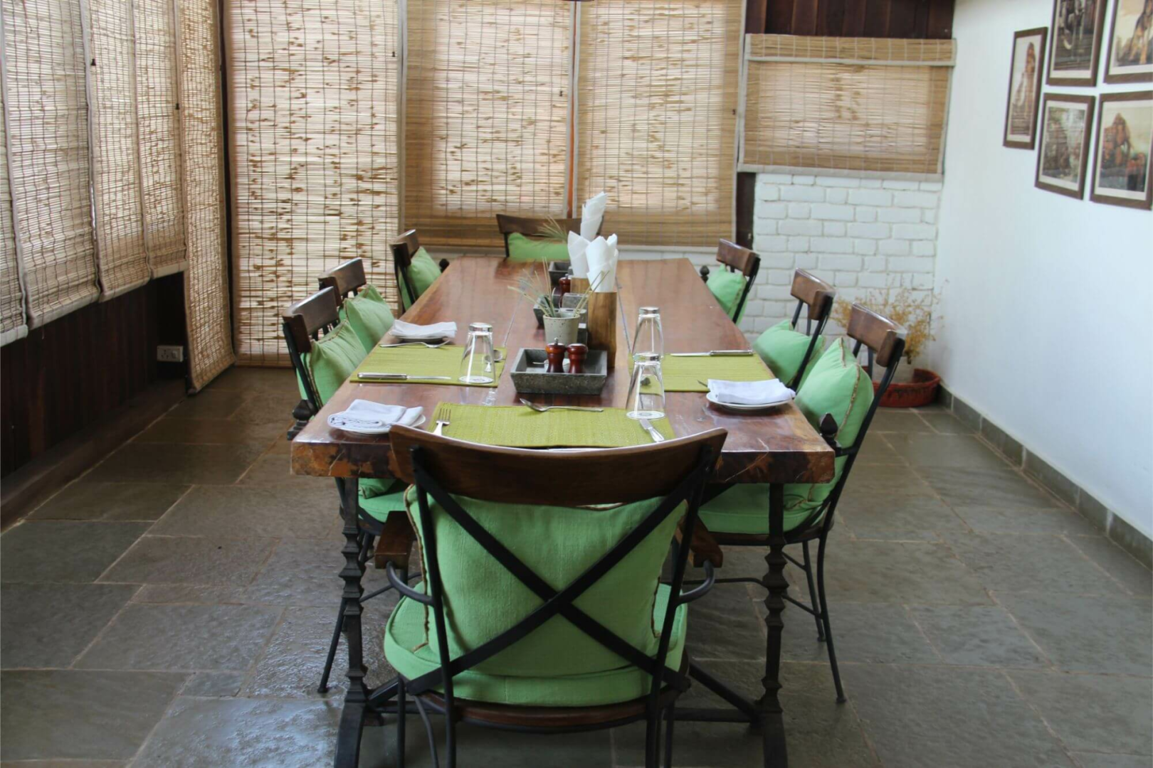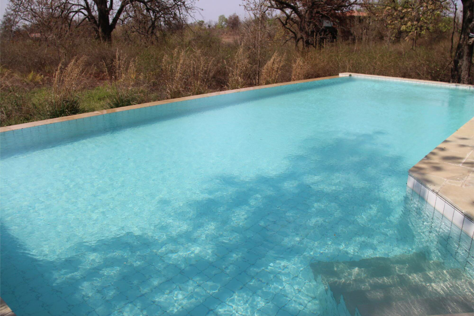 Setzt man den Weg auf dem Hauptpfad fort, gelangt man in das Hauptgebäude mit dahinter liegendem sehr schönem Pool. Das zweistöckige, strahlend weiß bemalte Haupthaus beherbergt einen sehr luftigen und halb offenen Speisesaal, wo man selbst im heißen Sommer aufgrund des ausgeklügelten Lüftungssystems ohne Klimaanlage auskommt. Dazu gibt es einen auf der Terrasse gelegenen wundervollen Loungebereich mit Blick auf den Pool und die umgebende Landschaft. Das Essen ist ausgezeichnet, der Service unaufdringlich und der Manager eine durchaus angenehme Person mit einem sanften Führungsstil.