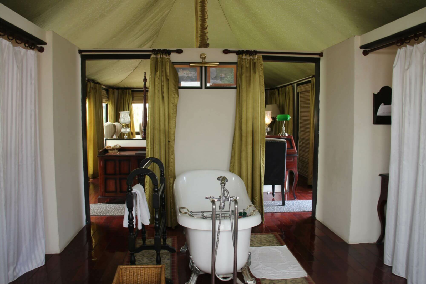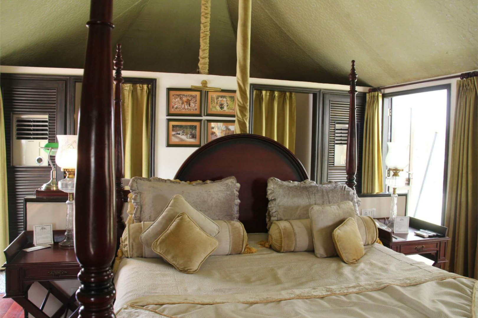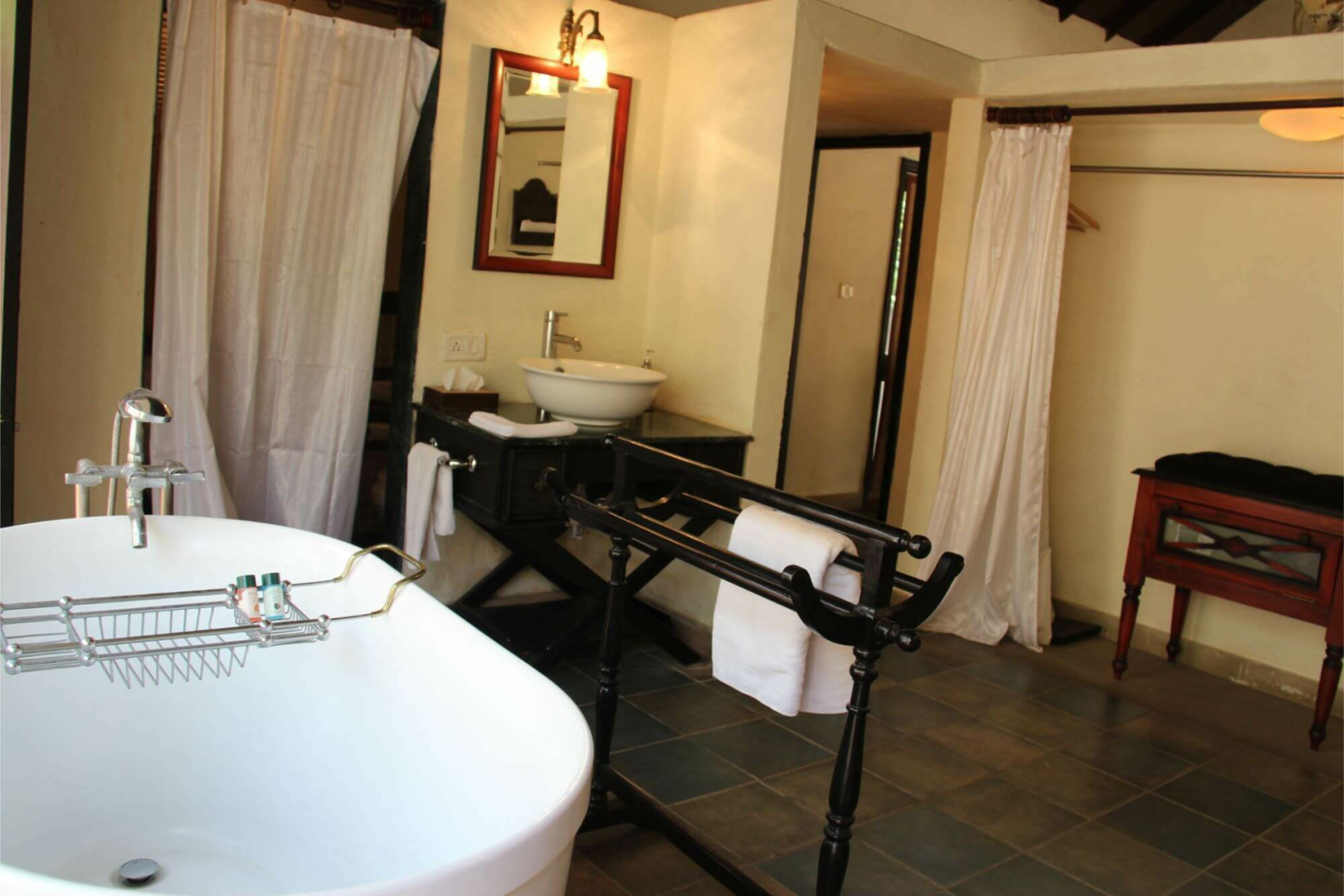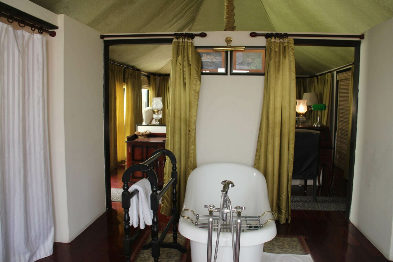 Tuli Corridor liegt inmitten einer wunderschönen Parkanlage und ist eine komische Mischung aus edler Lodge mit sehr vielen Schönheitsfehlern, die so typisch für indische Lodges sind. Auf der einen Seite finden wir die sehr schön eingerichteten acht Zeltsuites, deren Inneres eine der schönsten Inneneinrichtungen von allen Pench-Lodges aufweist. Mit Antikmöbeln, wunderschönen Schmuckobjekten, einem tollen Badezimmer mit freistehender Badewanne und Outdoor-Dusche fühlt man sich wohl. Die acht Luxuszelte sind um eine große zentrale Fläche angeordnet und mit sehr viel Platz von einander aufgestellt. Zu jedem Zelt gehört eine Veranda mit Feuerstelle, wo im Winter gegen eine geringe Gebühr Feuer angemacht werden kann. Leider habe ich die Sofas auf der Veranda während meines Besuchs im April 2019 in keinem guten Zustand vorgefunden.