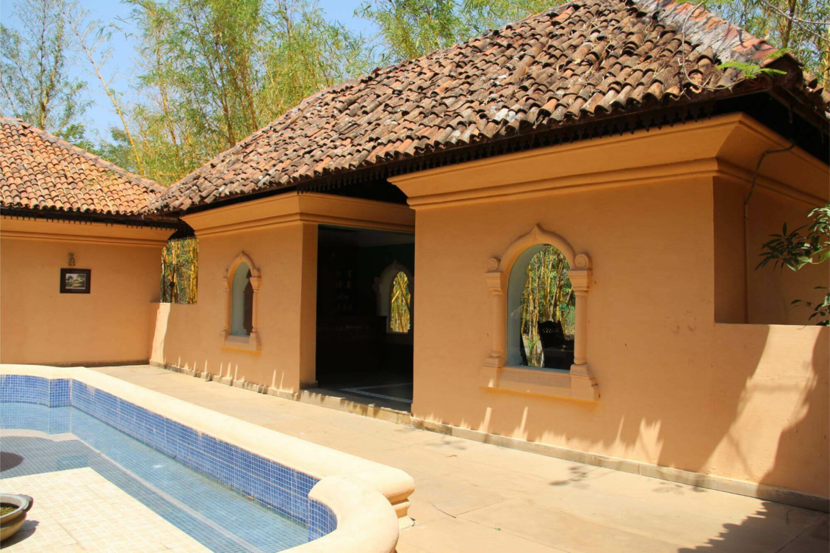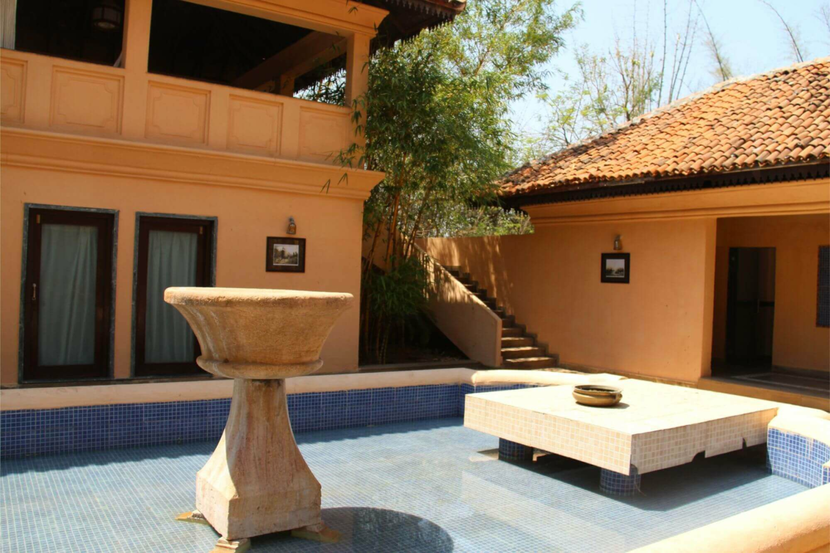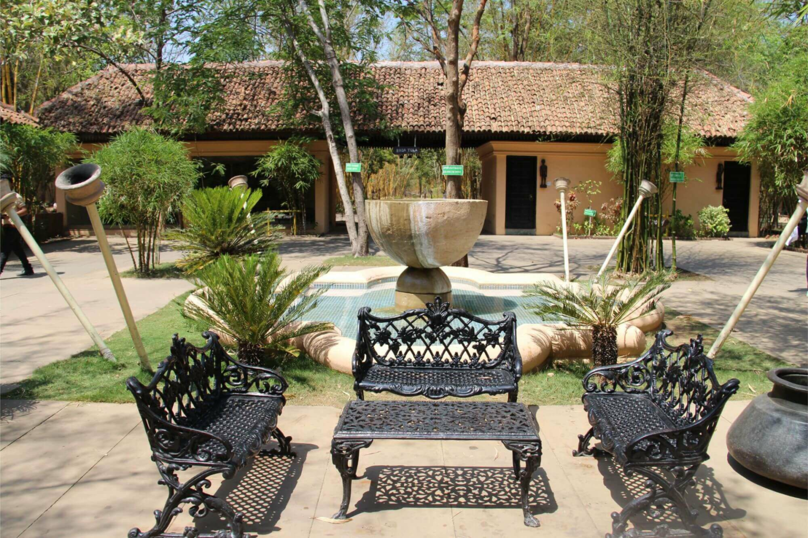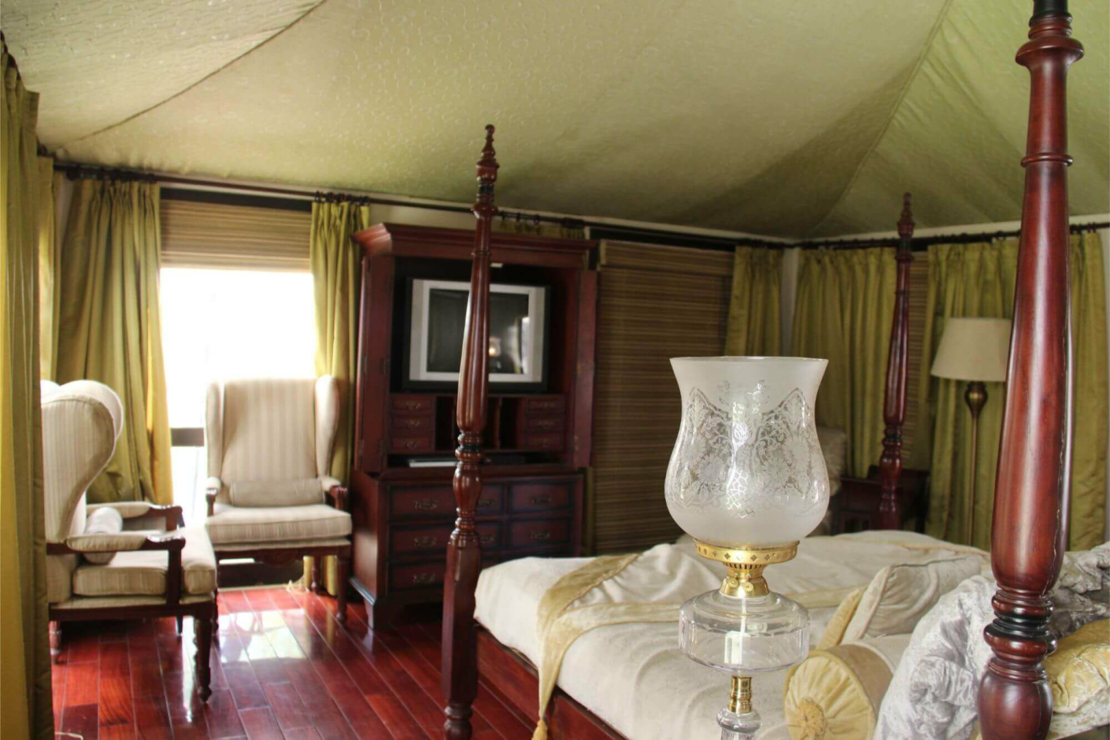 Tuli Corridor liegt inmitten einer wunderschönen Parkanlage und ist eine komische Mischung aus edler Lodge mit sehr vielen Schönheitsfehlern, die so typisch für indische Lodges sind. Auf der einen Seite finden wir die sehr schön eingerichteten acht Zeltsuites, deren Inneres eine der schönsten Inneneinrichtungen von allen Pench-Lodges aufweist. Mit Antikmöbeln, wunderschönen Schmuckobjekten, einem tollen Badezimmer mit freistehender Badewanne und Outdoor-Dusche fühlt man sich wohl. Die acht Luxuszelte sind um eine große zentrale Fläche angeordnet und mit sehr viel Platz von einander aufgestellt. Zu jedem Zelt gehört eine Veranda mit Feuerstelle, wo im Winter gegen eine geringe Gebühr Feuer angemacht werden kann. Leider habe ich die Sofas auf der Veranda während meines Besuchs im April 2019 in keinem guten Zustand vorgefunden.