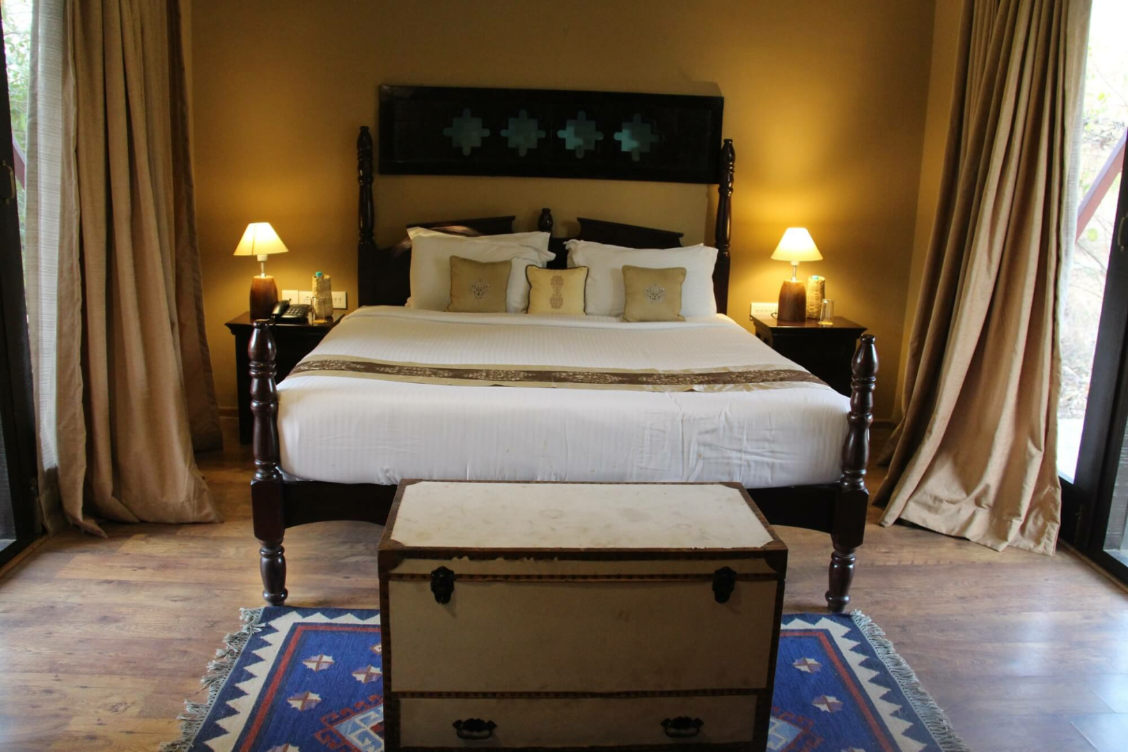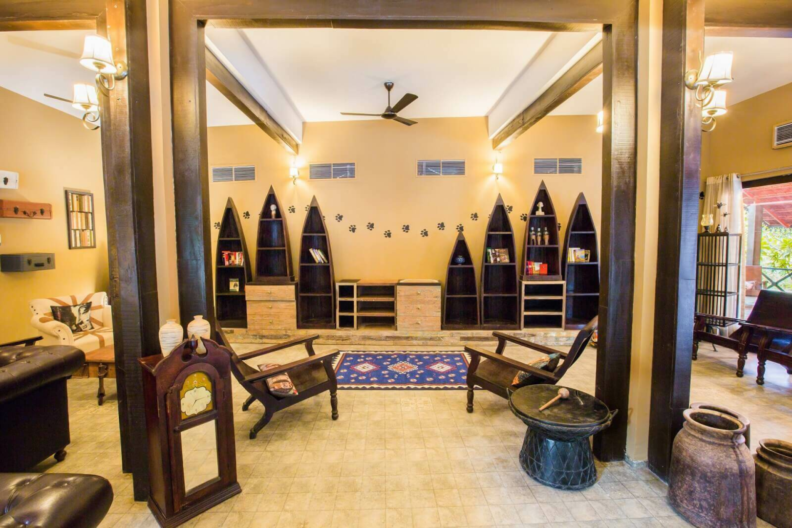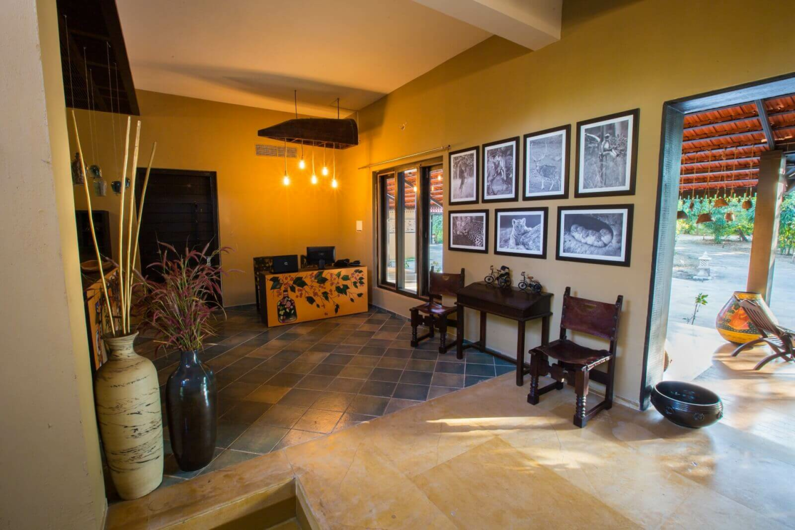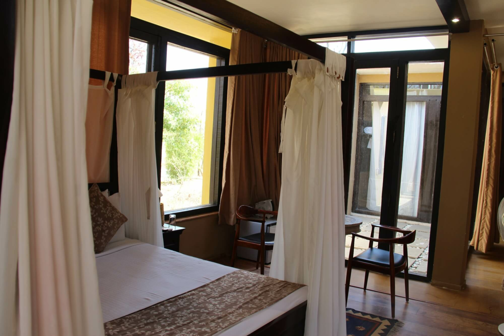 Es gibt 12 Zimmer mit drei unterschiedlichen Kategorien. Von allen sind die Standardzimmer sicherlich die Option mit dem besten Preis- Leistungsverhältnis. Diese sind sehr großzügig geschnitten und haben ein ausgeklügeltes Design, das viel Raum ermöglicht. Darüber hinaus gibt es Cottages und Machaans, welche aus zwei Stockwerken bestehen. Die Eingangstür im Erdgeschoss öffnet sich zu einem Hof auf der rechten Seite. Geradeaus fndet man das großzügige und schön dekorierte Schlafzimmer mit zwei Terrassen. Am Flur links gibt es eine Tür zum Badezimmer, wo das mit Blüten dekorierte Badebecken ein Blickfang ist. Rechts vom Flur führt eine weitere Tür zu der Treppe zum Obergeschoss, wo sich eine sehr große Terrasse mit Blick auf den umliegenden Wald befindet.