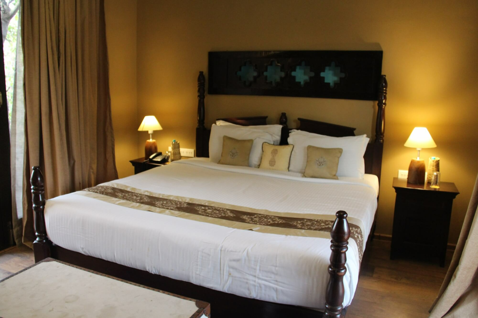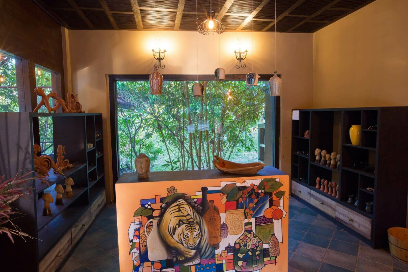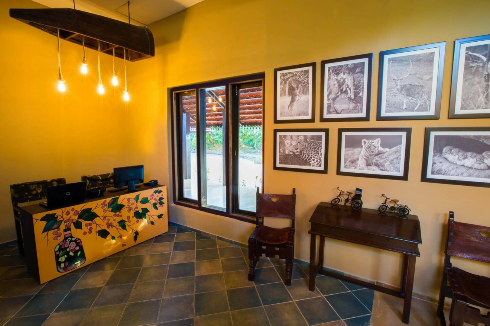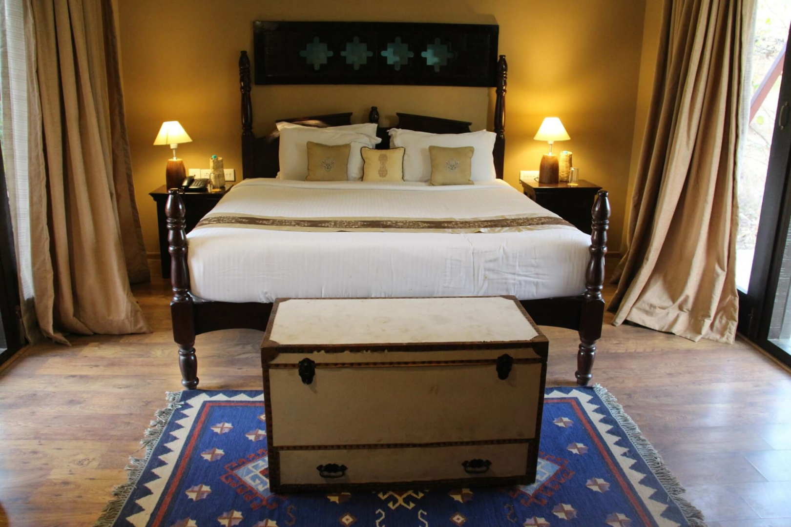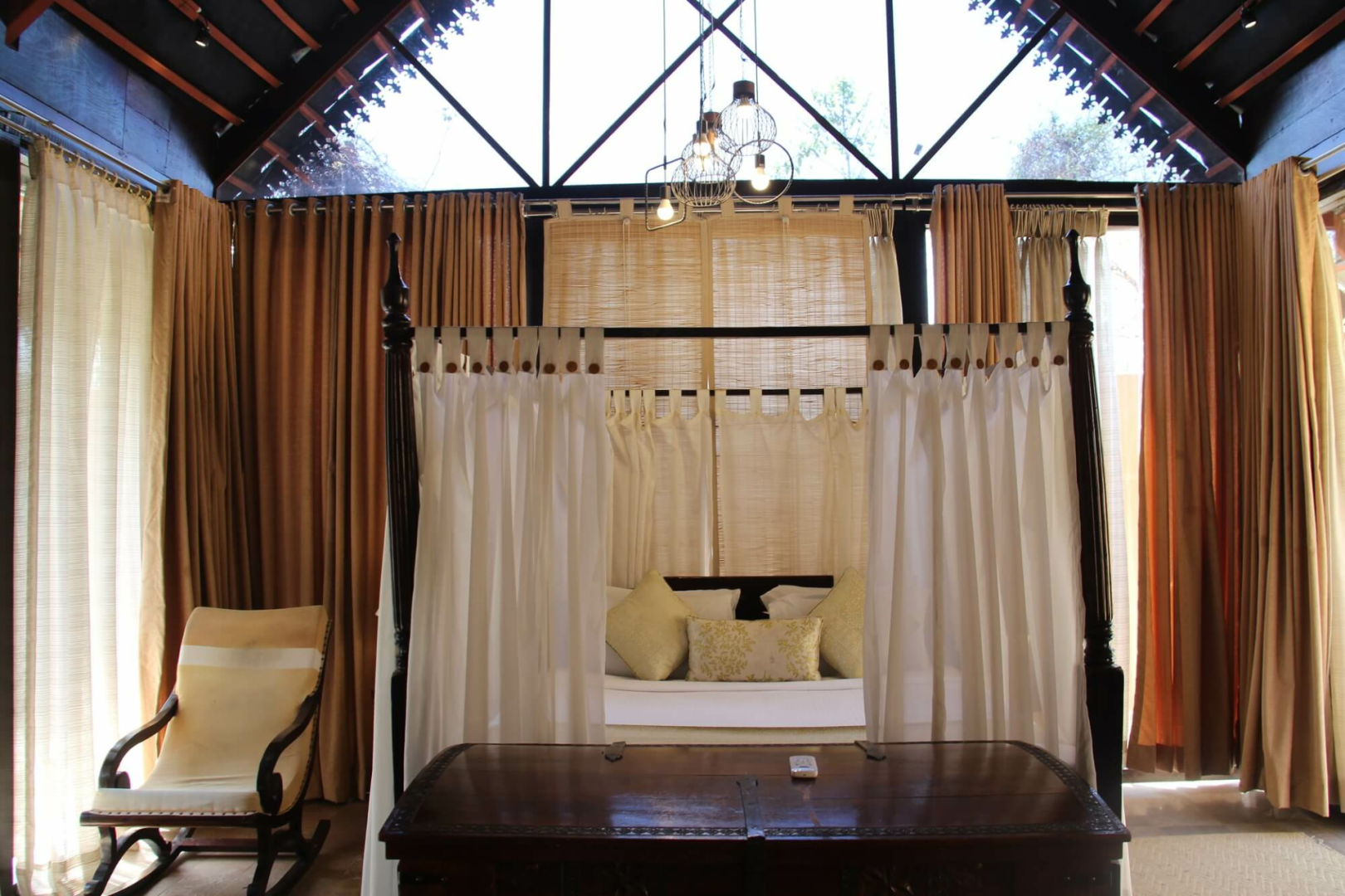 Es gibt 12 Zimmer mit drei unterschiedlichen Kategorien. Von allen sind die Standardzimmer sicherlich die Option mit dem besten Preis- Leistungsverhältnis. Diese sind sehr großzügig geschnitten und haben ein ausgeklügeltes Design, das viel Raum ermöglicht. Darüber hinaus gibt es Cottages und Machaans, welche aus zwei Stockwerken bestehen. Die Eingangstür im Erdgeschoss öffnet sich zu einem Hof auf der rechten Seite. Geradeaus fndet man das großzügige und schön dekorierte Schlafzimmer mit zwei Terrassen. Am Flur links gibt es eine Tür zum Badezimmer, wo das mit Blüten dekorierte Badebecken ein Blickfang ist. Rechts vom Flur führt eine weitere Tür zu der Treppe zum Obergeschoss, wo sich eine sehr große Terrasse mit Blick auf den umliegenden Wald befindet.